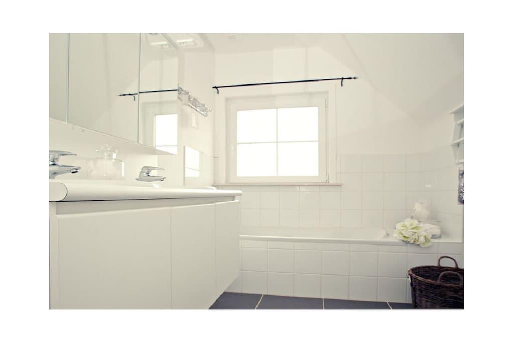 Stueetage: (Stue(enkeltsovesofa, Fjernsyn(kabel), Fjernsyn(digital), Fjernsyn(antenne), kakkelovn), guest toilet(, toilet)) På 1. etage: (soveværelse(, , enkeltseng, enkeltseng, enkeltseng), soveværelse(, , dobbeltseng)) , , Køkken(kogeplade, brødrister, komfur, kaffemaskine, ovn, køleskab), badeværelse(, toilet, badekar, bruser, håndvask), balkon, varme, terrasse(havemøbler, solstole), parkering