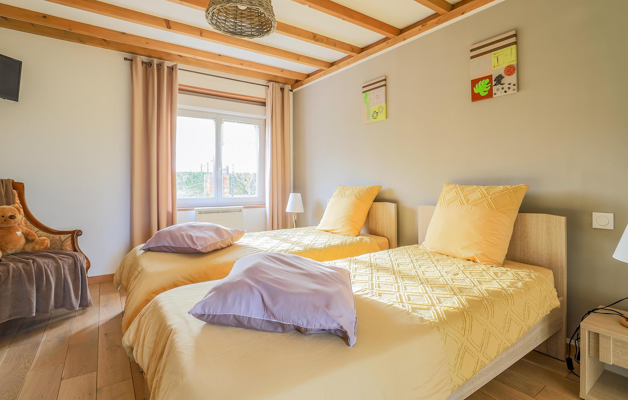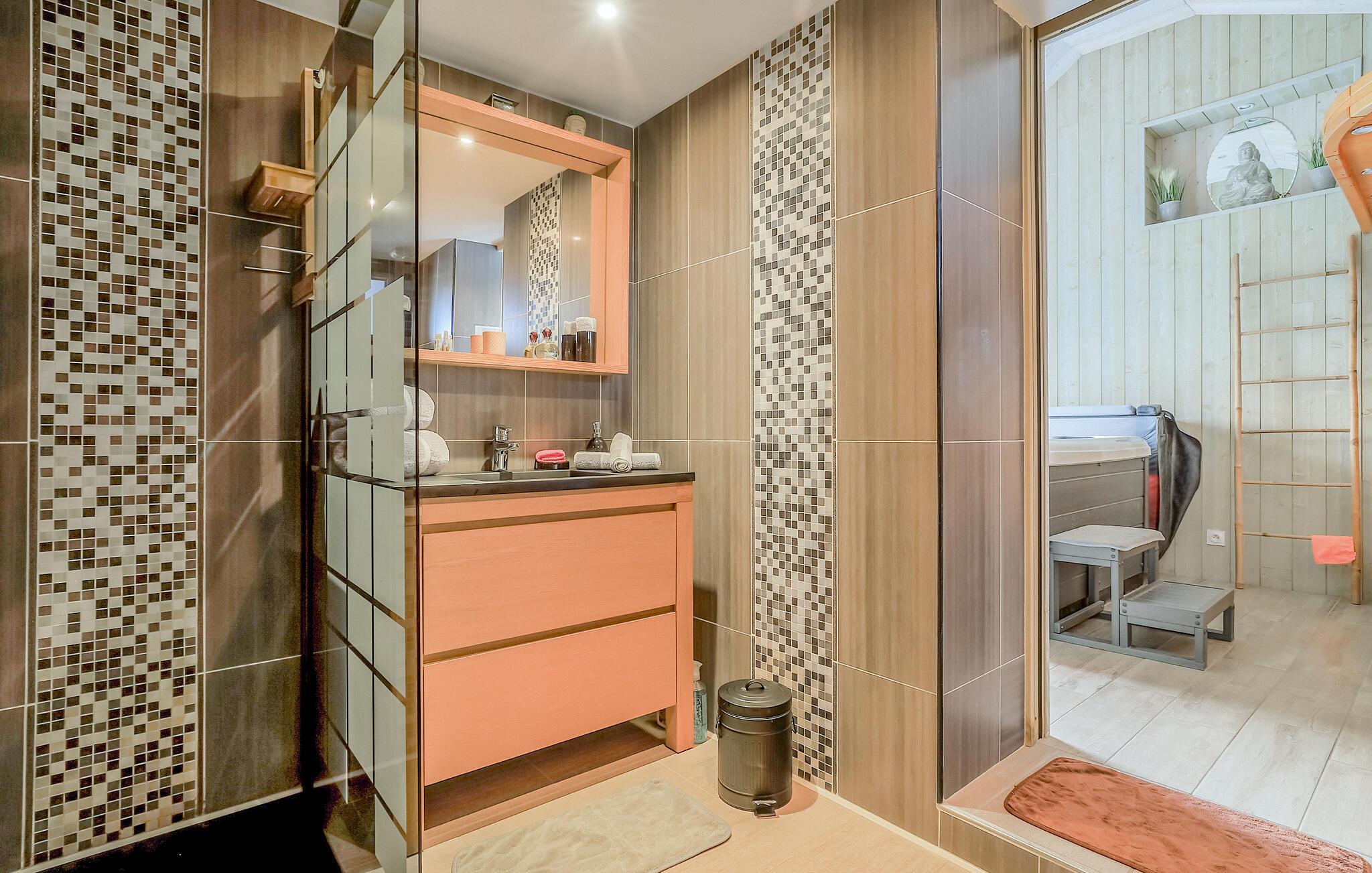 Dette etplans feriehus med en hyggelig legehems tilbyder en oase af ro og afslapning midt i den idylliske natur nær Opalkysten. De smagfuldt indrettede rum og det separate afslapningsområde med spabad giver jer mulighed for at lægge hverdagen bag jer. Den hyggelige indretning og det veludstyrede køkken sørger for en komfortabel oplevelse, mens terrassen og haven er perfekte steder til at nyde den landlige stilhed. Forkæl jer selv med en afslappende oplevelse i saunaen eller i hamammen, der kan benyttes efter aftale.