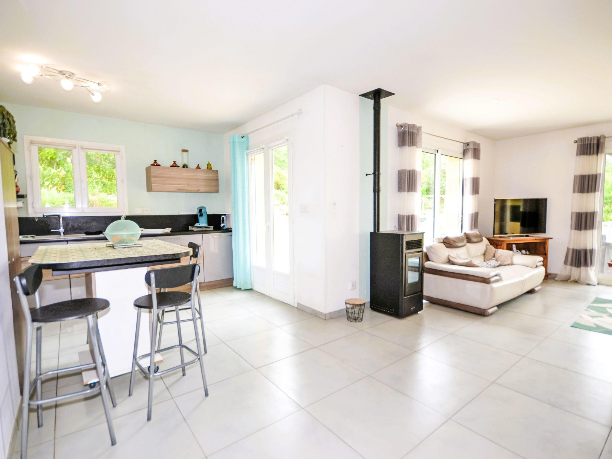3-room terraced house 105 m2. Beautiful furnishings: living/dining room 25 m2 with Scandinavian wood stove and TV (flat screen), air conditioning and electric shutters. 1 room with 1 french bed (160 cm, length 200 cm), electric shutters. 1 room with 1 double sofabed (140 cm, length 190 cm), 1 french bed (140 cm, length 190 cm), electric shutters. Open kitchen (oven, dishwasher, 3 induction hot plates, toaster, kettle, microwave, electric coffee machine, Capsules for coffee machine (Senséo) extra). Bath/shower, sep. WC. Electric heating. Terrace 40 m2 partly roofed, south facing position. Terrace furniture, deck chairs (4). Very beautiful view. Facilities: washing machine, dryer, iron, mosquito net. Internet (WiFi, free). Please note: non-smoking house. Maximum 1 pet/ dog allowed. Smoke alarm. Offer by a private individual according to Art. 155, IV of CGI.