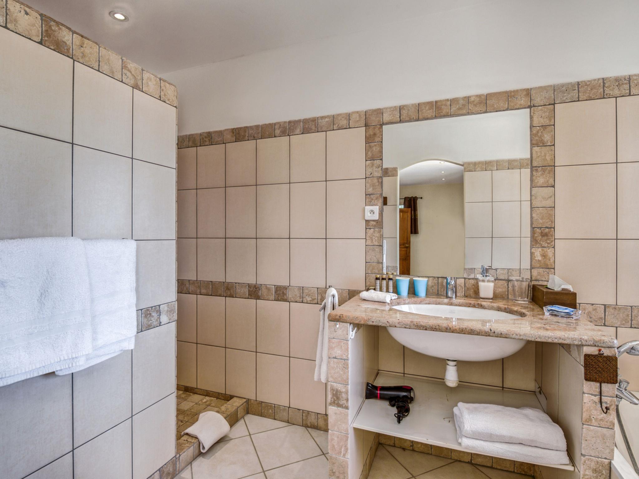 6-room villa 250 m2 on 2 levels. Beautiful and cosy furnishings: large living/dining room with TV (flat screen). Exit to the terrace. 2 rooms, each room with 1 french bed (160 cm, length 200 cm), shower/WC. Exit to the terrace. 1 room with 2 beds (90 cm, length 190 cm), shower/WC. Exit to the terrace. 1 room with 2 beds (90 cm, length 190 cm), shower/WC. Large, open kitchen (4 hot plates, oven, dishwasher, microwave, freezer, electric coffee machine). Upper floor: 1 room with 1 french bed (160 cm, length 200 cm). Exit to the balcony. Bathroom, sep. WC. Air-conditioning, forced-air heating. Large terrace 50 m2. Terrace furniture, deck chairs (10). View of the garden. Facilities: washing machine, iron, children's high chair, baby cot for up to 3 year olds, hair dryer. Internet (WiFi, free). Please note: two of the bedrooms on the ground-floor, are located in the adjoining house, with separate entrance.