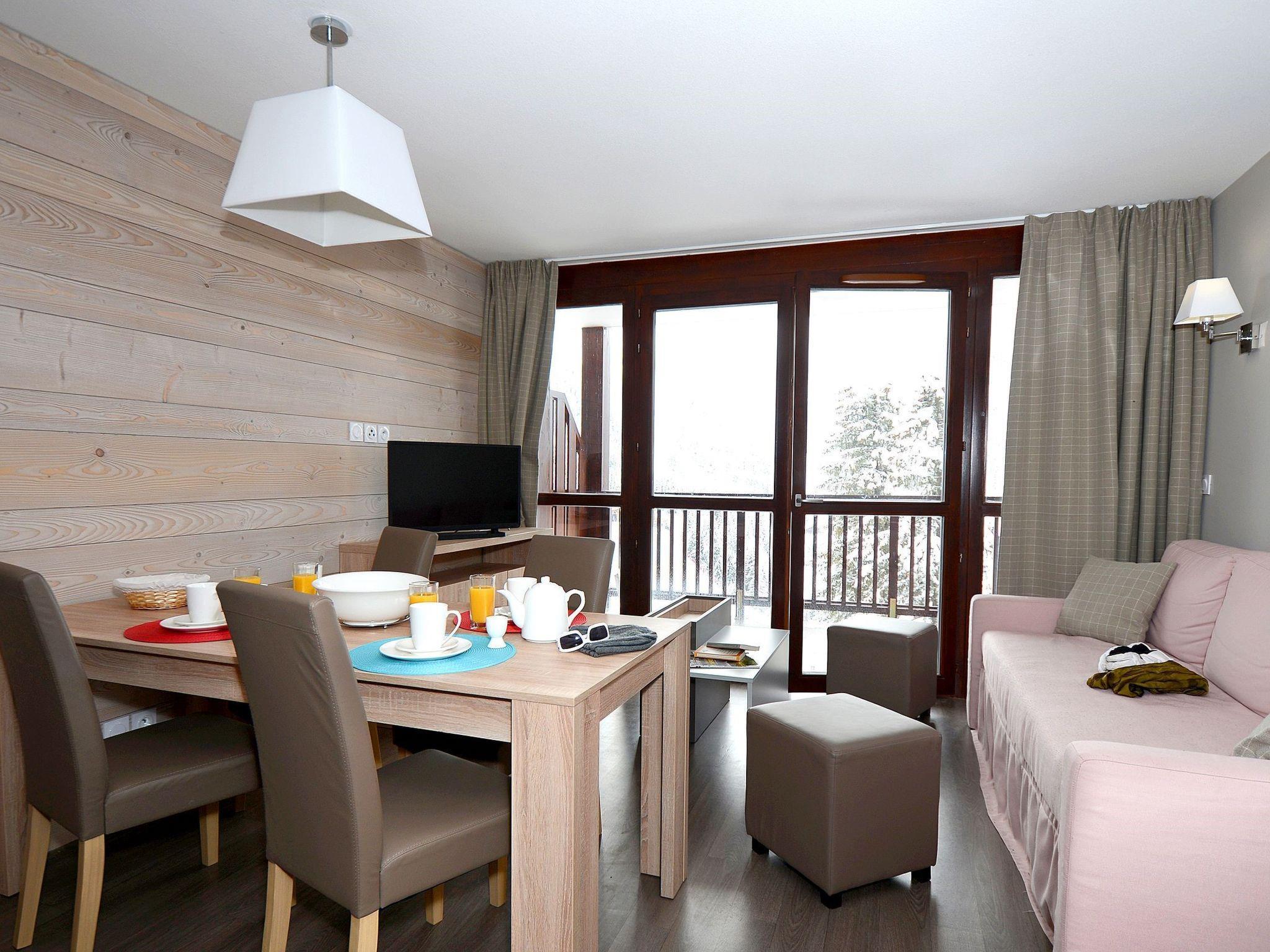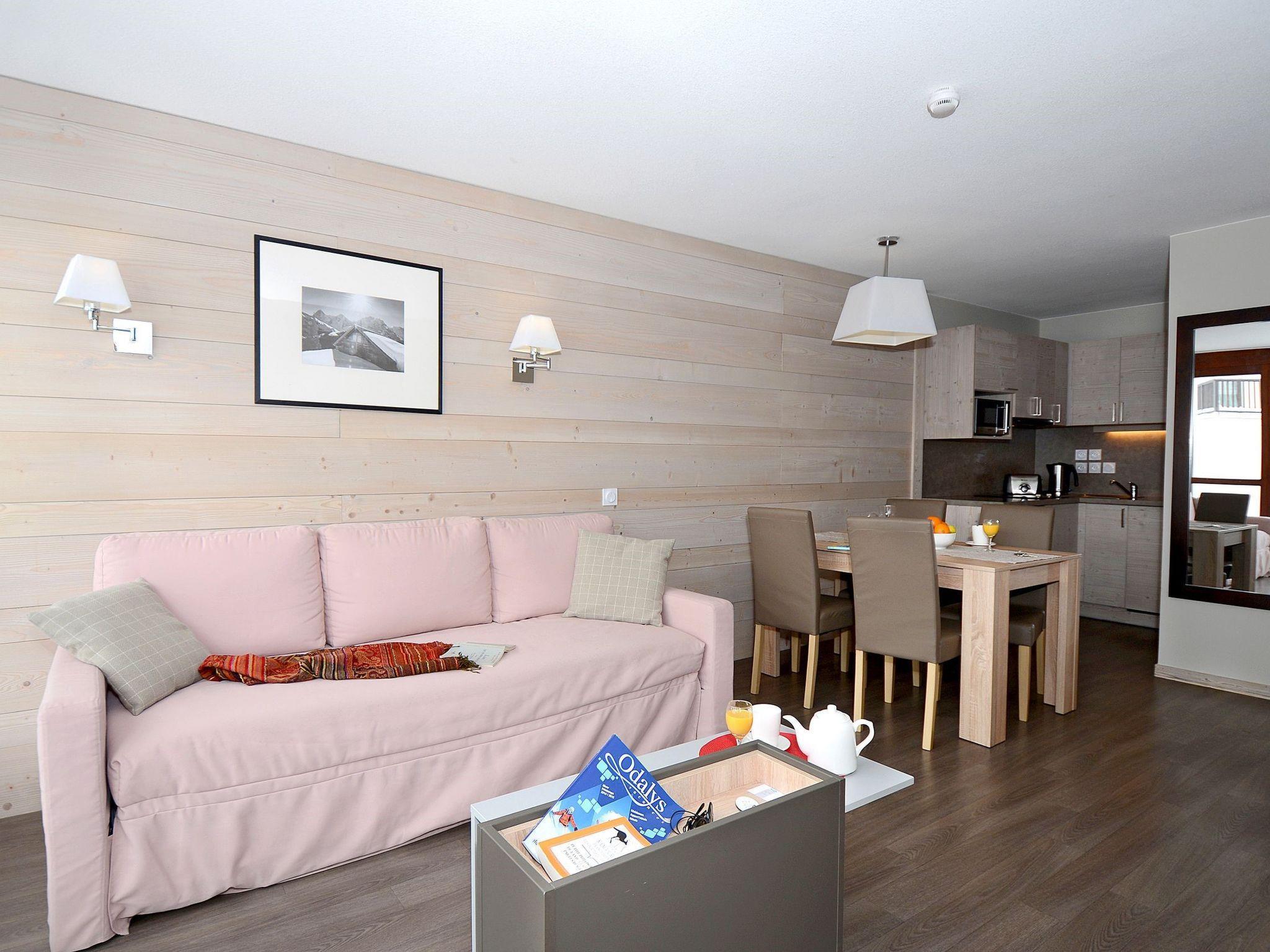 "Résidence Odalys Référence Le Panoramic", 2-room apartment 34 m2. Modern and stylish furnishings: living/sleeping room with 2 sleeping facilities, dining table and TV. Exit to the balcony. 1 room with 1 french bed. Small, open kitchen (dishwasher, 2 ceramic glass hob hotplates, toaster, kettle, microwave, electric coffee machine). Bath/WC or shower/WC. Electric heating. Balcony. Facilities: Internet (WiFi, free). Parking (roofed, 1 car). Maximum 1 pet/ dog allowed.