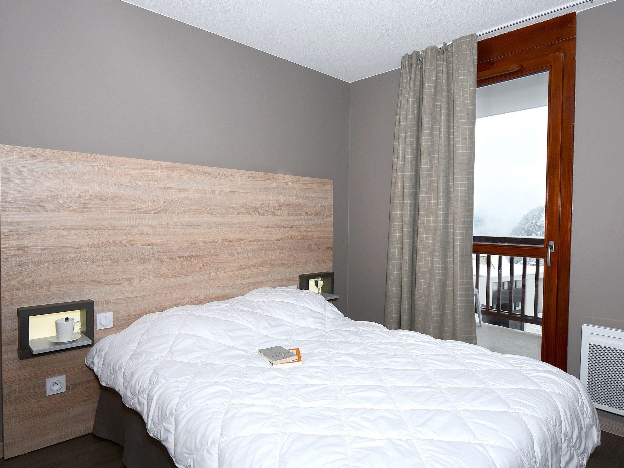 "Résidence Odalys Référence Le Panoramic", 2-room apartment 42 m2, on the ground floor. Tasteful furnishings: living/sleeping room with 2 sleeping facilities, dining table and TV. Exit to the balcony. 1 room with 1 french bed. Alcove with 1 x 2 bunk beds. Small, open kitchen (dishwasher, 2 ceramic glass hob hotplates, toaster, kettle, microwave, electric coffee machine). Bath/WC. Electric heating. Balcony. Facilities: Internet (WiFi, free). Parking (roofed, 1 car). Maximum 1 pet/ dog allowed. Instead of an enclosed bedroom, some sleeping areas are located in an open-plan area (gallery, alcove, etc.).