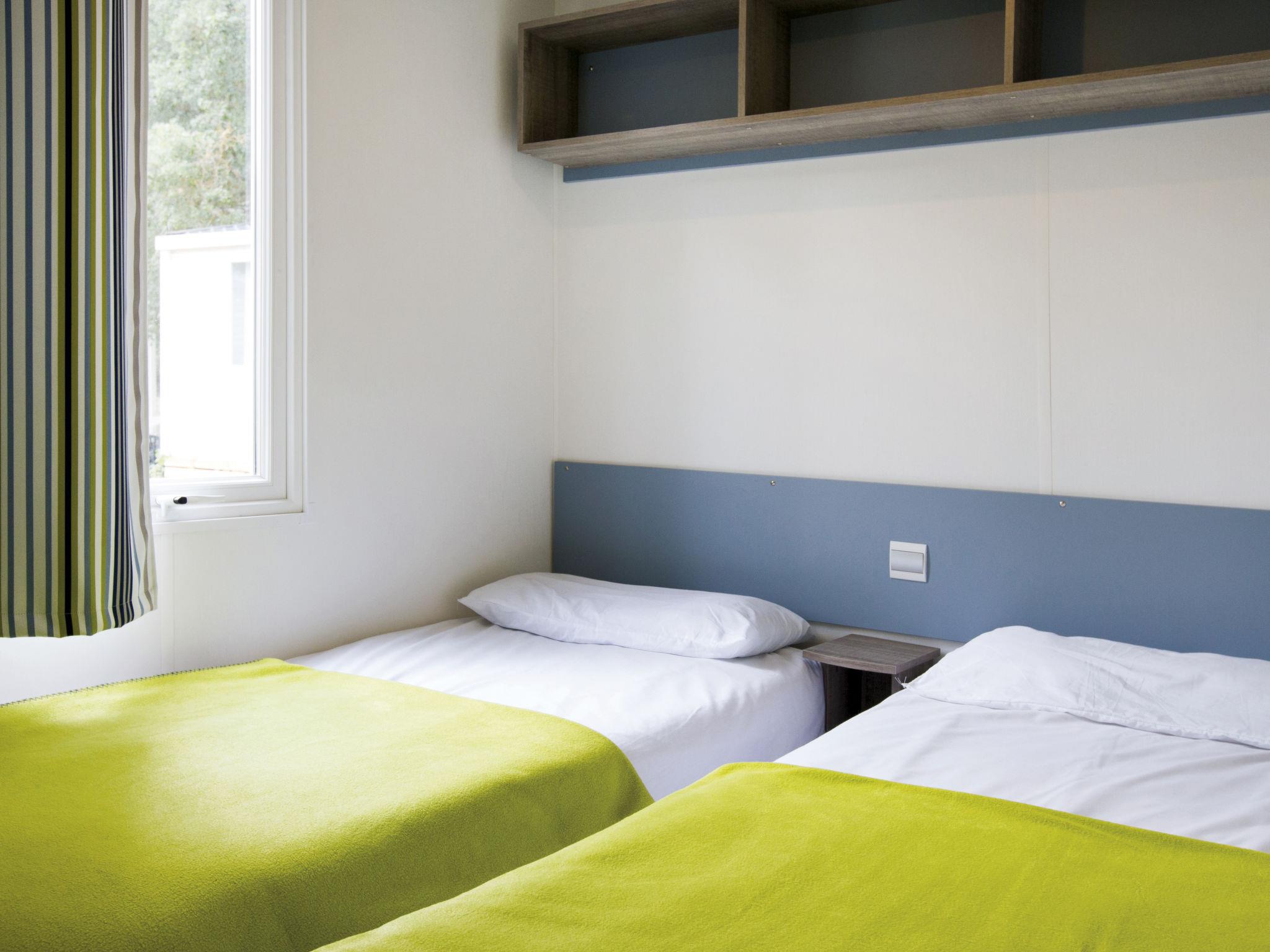 "Domaine de Château Laval", 3-room mobile home 31 m2. Practical furnishings: living/dining room with dining table and TV. Exit to the terrace. 1 room with 1 french bed. 1 room with 2 beds. Kitchenette (4 gas rings, microwave, freezer, electric coffee machine). Shower, sep. WC. Electric heating. Terrace roofed. Terrace furniture. Facilities: children's high chair, baby cot. Please note: non-smoking house. Maximum 1 small pet/ dog allowed. Smoke alarm.