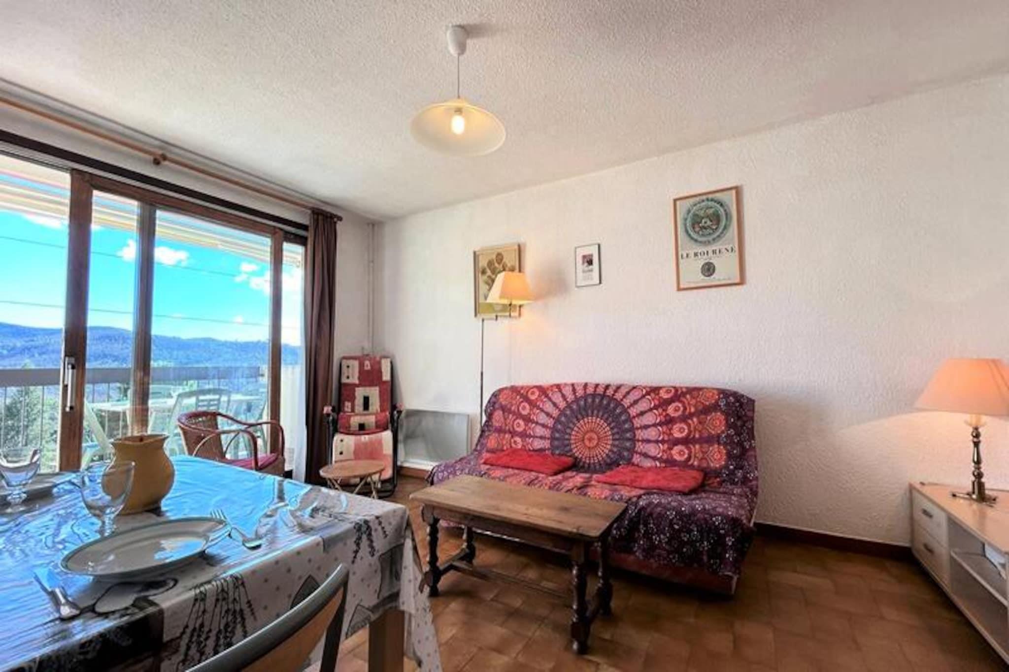 Højt over den charmerende landsby tilbyder denne dejlige toværelseslejlighed et roligt tilflugtssted med en fantastisk udsigt fra den sydvestvendte terrasse. Beliggende på øverste etage i 'Le SAN BASTIAN'-residensen, tilgængelig med elevator, kombinerer denne ejendom komfort og bekvemmelighed i rolige omgivelser. Uanset om du søger en fredelig flugt eller en base for at udforske regionen, er denne lejlighed det perfekte valg til din ferie. Forestil dig at nippe til din morgenkaffe på terrassen, mens solen bader landskabet i gyldent lys og skaber et øjeblik med ren afslapning. \n\nIndenfor kan lejligheden prale af en veldesignet planløsning med et fuldt udstyret køkken med ovn, mikrobølgeovn og elektrisk kaffemaskine, hvilket gør det nemt at tilberede måltider under dit ophold. Den primære opholdsstue er rummelig og indbydende, mens soveværelset tilbyder to hyggelige enkeltsenge til afslappende nætter. Et separat brusebad og toilet sikrer privatliv og praktisk anvendelighed. Residensen tilbyder også bekvem parkering, så du nemt kan udforske det omkringliggende område. Slutrengøring er inkluderet, så du kan fokusere helt på at nyde din tid her. \n\nBeliggenheden er ideel til at opdage regionens skønhed. Fra maleriske landsbyer til naturskønne stier byder området på uendelige muligheder for eventyr. Uanset om du vandrer gennem lavendelmarker, udforsker historiske steder eller blot nyder den provencalske charme, fungerer denne lejlighed som en indbydende base. Med sin fredelige atmosfære og gennemtænkte faciliteter er det et sted, hvor uforglemmelige minder skabes.