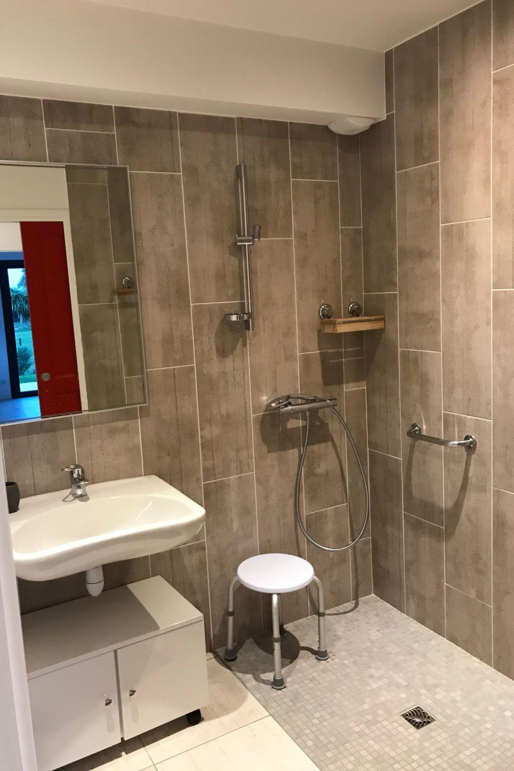 Practical double garage for 2 cars, bicycles, sailing, surfing, kite-surfing, golfing equipment, etc. Hard-surface access to the house (scraped concrete) and pathway suitable for wheelchairs Ground floor accessible to People with Reduced Mobility (PRM) Wide doors on the ground floor to make it easier to move a wheelchair On the ground floor, a private area comprising a separate toilet, a bedroom and a shower room with walk-in shower has been designed to allow wheelchair access.