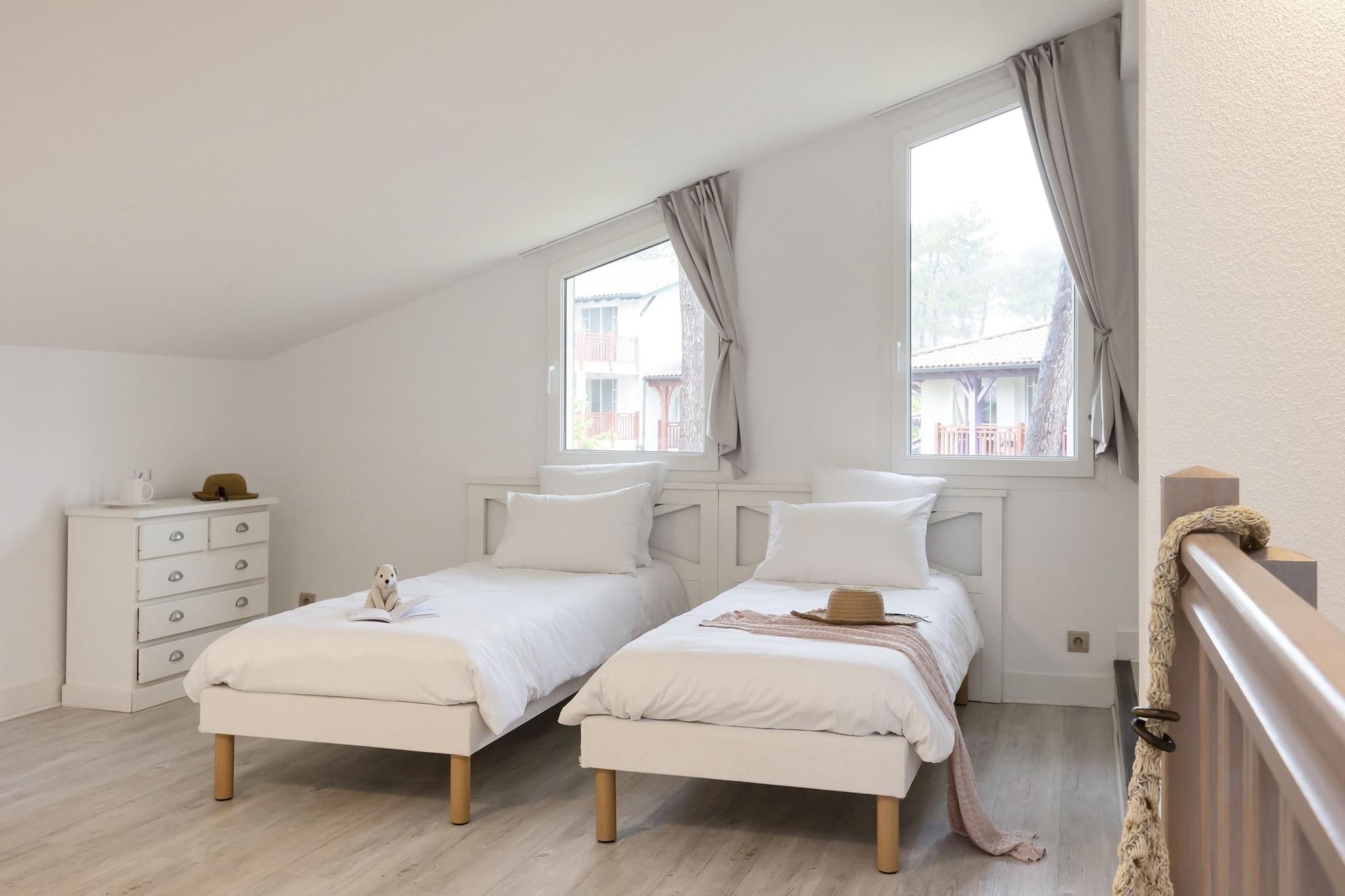 Charmerende Landaise-stil komfort ved kysten Beliggende ved siden af de frodige fairways på Gujan-Mestras golfbanen, blander dette lyse og rummelige feriehus lokal charme med moderne bekvemmelighed. Det er indrettet i traditionel Landaise-arkitektur og har et komfortabelt opholdsområde med en dobbelt sovesofa, et fuldt udstyret tekøkken og store vinduer, der åbner ud til en privat terrasse - perfekt til udendørs måltider. Ovenpå finder du to hyggelige soveværelser, mens en sjov soveniche med køjesenge eller enkeltsenge er ideel til de mindste. Uanset om du er her for afslapning eller kysteventyr, er dette hjem din ideelle base. Uovertruffen beliggenhed i hjertet af Arcachon Bay Beliggende i det fredfyldte feriested Les Villas des Greens du Bassin, er du kun få minutter fra Arcachons berømte strande, fyrreskove og den maleriske Dune du Pilat. Udforsk nærliggende østershavne, cykl gennem skyggefulde naturstier, eller slap af ved den fælles swimmingpool (åben april til september). Med rigelig parkering og fredelige omgivelser er det en stressfri flugt for både par, familier og venner. Kæledyrsvenligt ophold med kystsjov for alle Medbring din lodne ledsager! Gåture i snor rundt om golfbanens stier er velkomne, og den nærliggende La Hume-strand byder på kæledyrsvenlige områder at plaske og lege. Lokale caféer med udendørs siddepladser, som La Petite Cuillère, byder velkommen til kæledyr, så ingen bliver efterladt. Uanset om det er et morgenløb med din hund eller en afslappet solnedgangstur, byder dette sted på glædelige øjeblikke for enhver gæst - to- eller fireben.