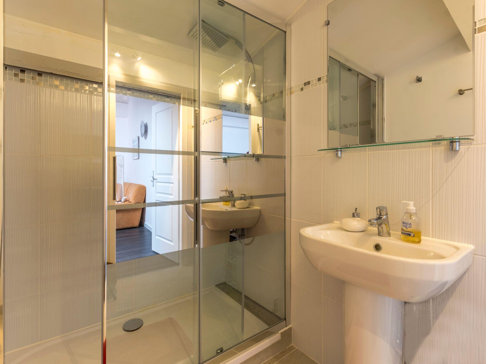 a corner lounge with television a dining area an office area (desk + small bookcase)an alcove with a sofa bed (160 cm) protected by a folding screen for greater privacyAt the back of this large room is a shower room with a walk-in shower.