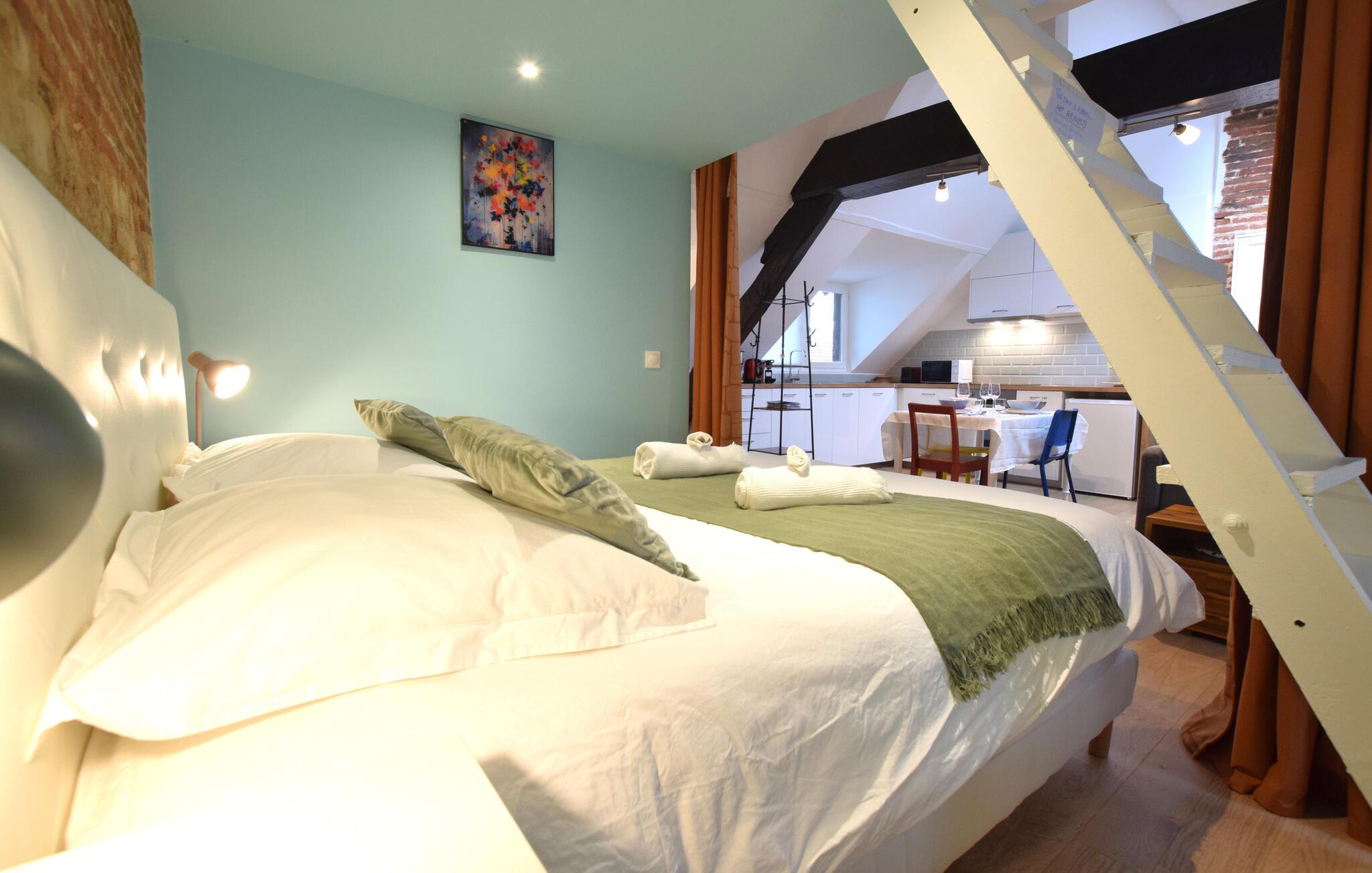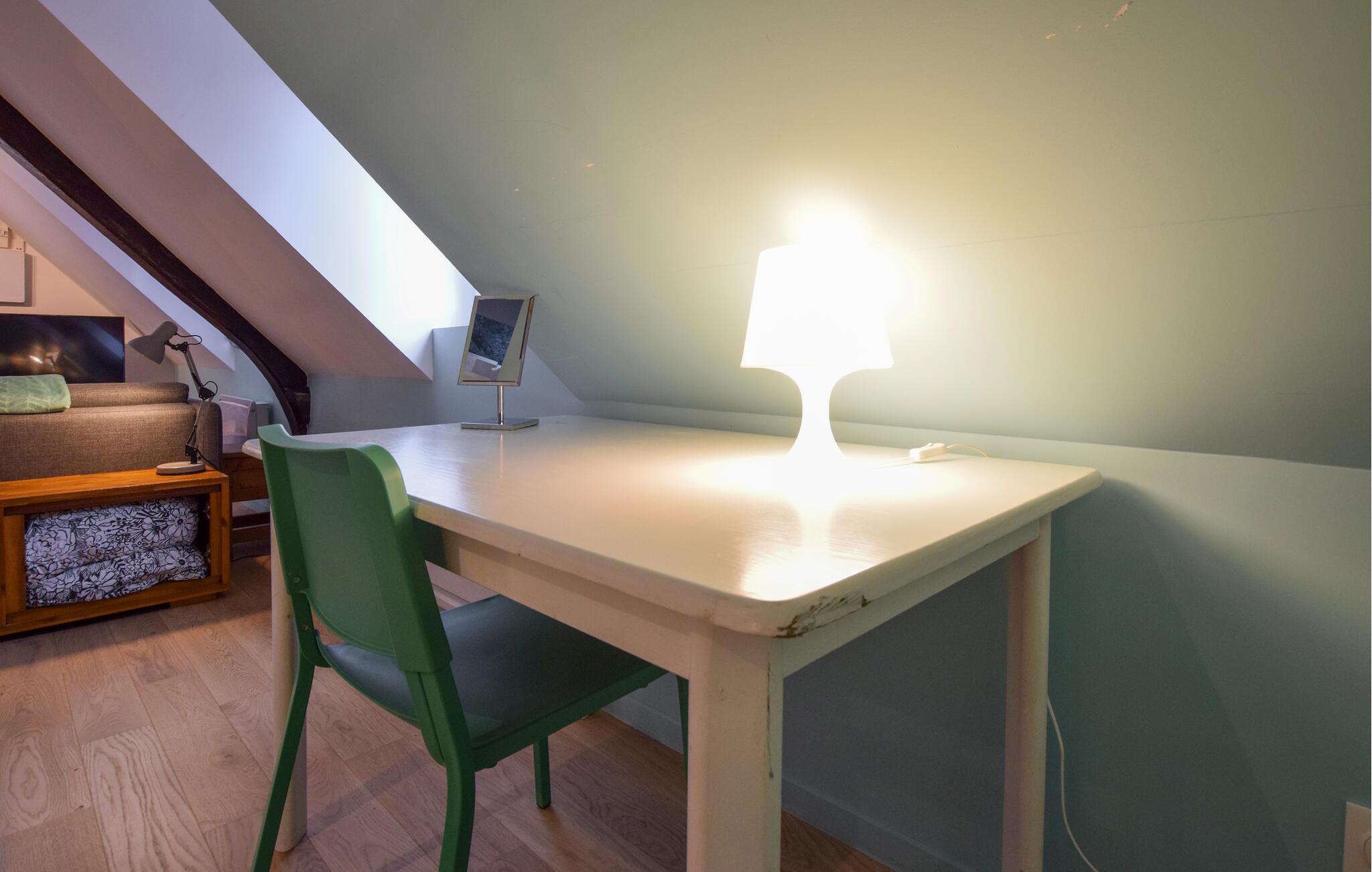 Denne smukke ferielejlighed byder jer velkommen i et kærligt renoveret bindingsværkshus fra 1800-tallet og ligger i gåafstand fra de charmerende historiske seværdigheder i korsarbyen Honfleur. Nyd den hyggelige atmosfære, mens I tilbereder lækre måltider med friske råvarer fra markedet, planlæg jeres aktiviteter ved spisebordet og slap af på sofaen med en god film efter en lang dag.