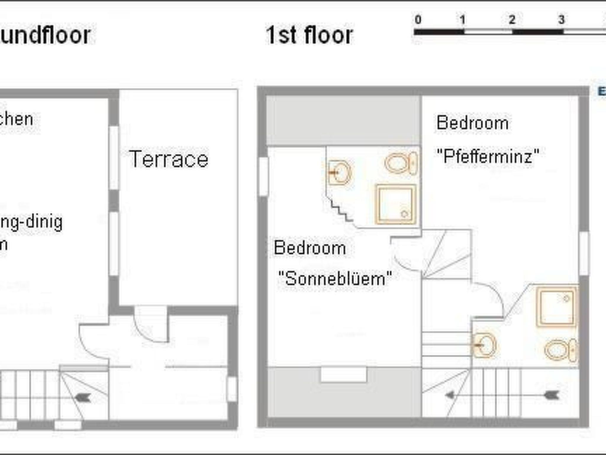 This charming traditional half-timbered house has 43 m² of living space (not including the eaves) and can sleep four people. The former 18th-century barn has been completely converted. As a result, the house now offers all modern comforts while retaining its typical features. The living room with its open-plan kitchen has a comfortable sofa and armchair, as well as cable TV. The kitchen with dining area is modern and fully equipped with cooker, oven, coffee maker, toaster, fridge-freezer, washing machine and microwave. The two bedrooms and two bathrooms are on the upper floor. The first bedroom has a double bed, the other has two single beds which can be joined together (please inform the owners if this is your wish). Both bathrooms are equipped with washbasin, shower and WC.