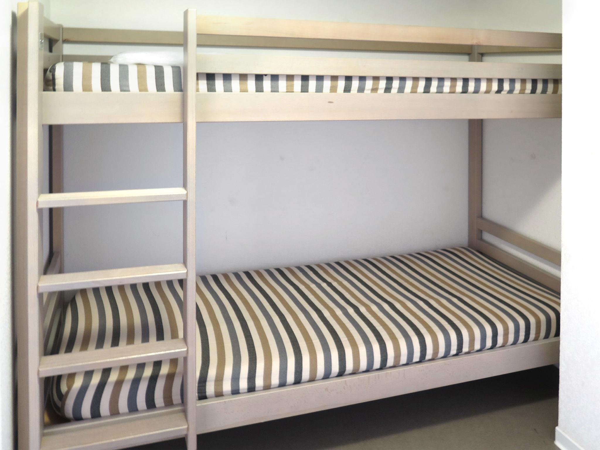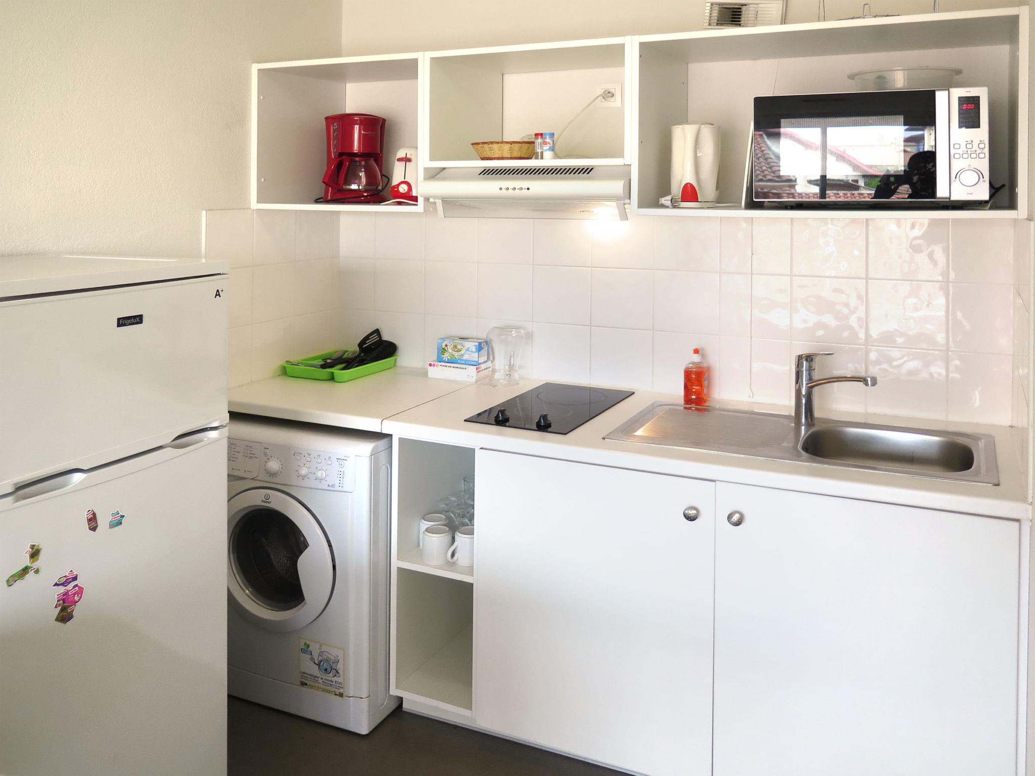 "Résidence Plage Centrale T2 Cab", 2-room apartment 38 m2. Object suitable for 2 adults + 2 children. Bright, practical furnishings: living/sleeping room with 1 double sofabed, dining table and TV. Exit to the balcony. 1 room with 1 french bed (160 cm, length 200 cm). Entrance hall with 1 x 2 bunk beds (80 cm, length 180 cm). Open kitchen (2 ceramic glass hob hotplates, toaster, kettle, freezer, electric coffee machine, combination microwave). Shower/WC. Electric heating. Small balcony. Deck chairs (2). Facilities: washing machine, iron, children's high chair, baby cot (extra). Internet (WiFi, free). Parking (1 car). Please note: non-smokers only. Smoke alarm.