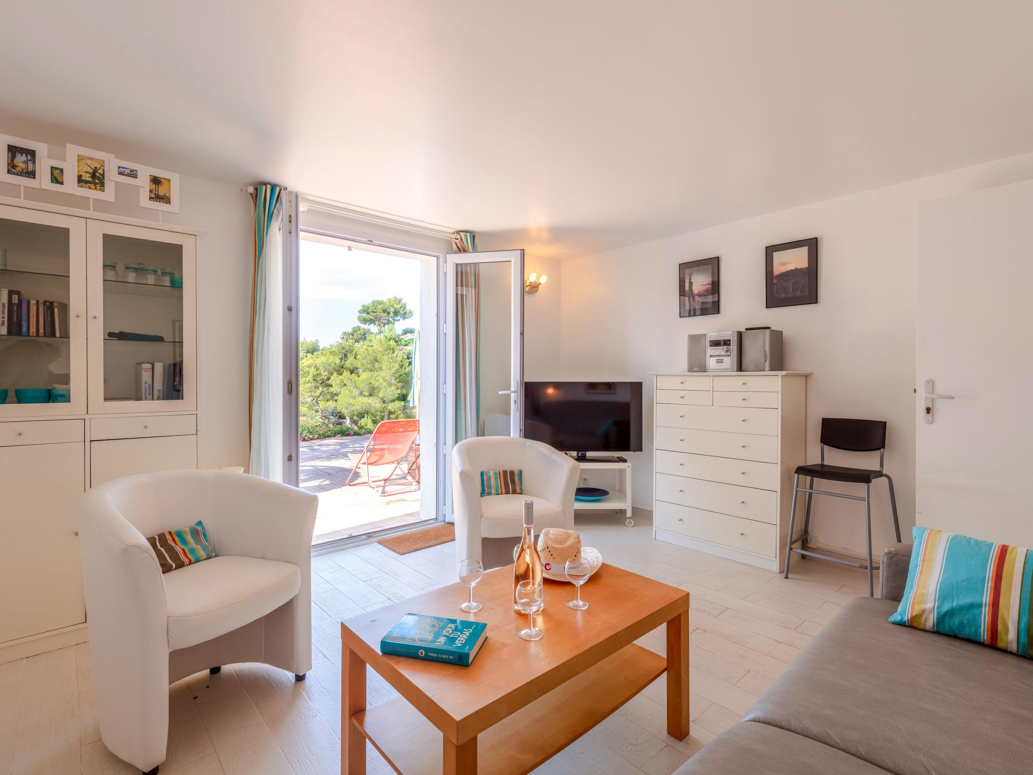 3-room apartment 80 m2, on the ground floor. Comfortable and beautiful furnishings: living room with TV (flat screen). Exit to the terrace. 1 room with 1 french bed (160 cm, length 200 cm). 1 room with 2 beds (90 cm, length 190 cm). Kitchen (dishwasher, 2 ceramic glass hob hotplates, freezer, electric coffee machine, combination microwave) with dining table. Shower, sep. WC. Large terrace 150 m2, south facing position. Terrace furniture, deck chairs. Beautiful view of the sea and the countryside. Facilities: washing machine, baby cot. Internet (WiFi, free). Parking. Please note: TV only FR. Smoke alarm. Offer by a commercial proprietor according to Art. 155, IV, CGI