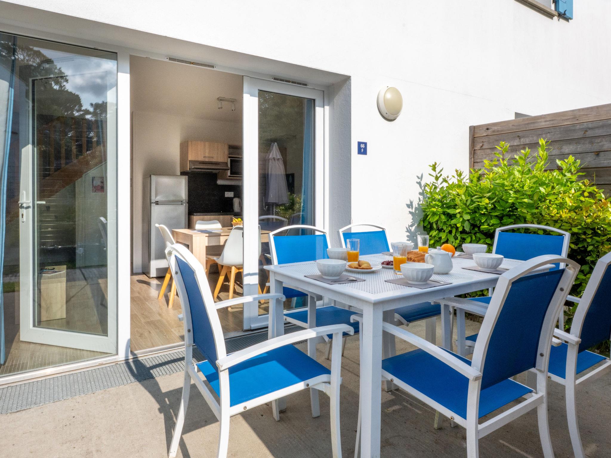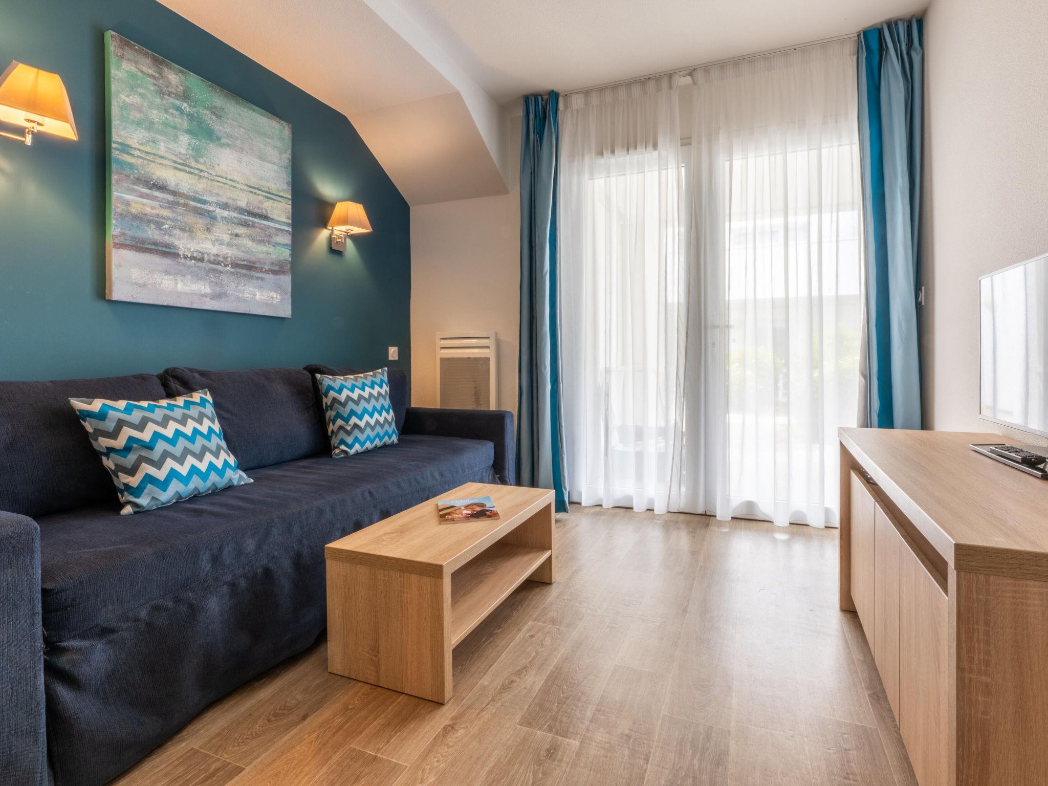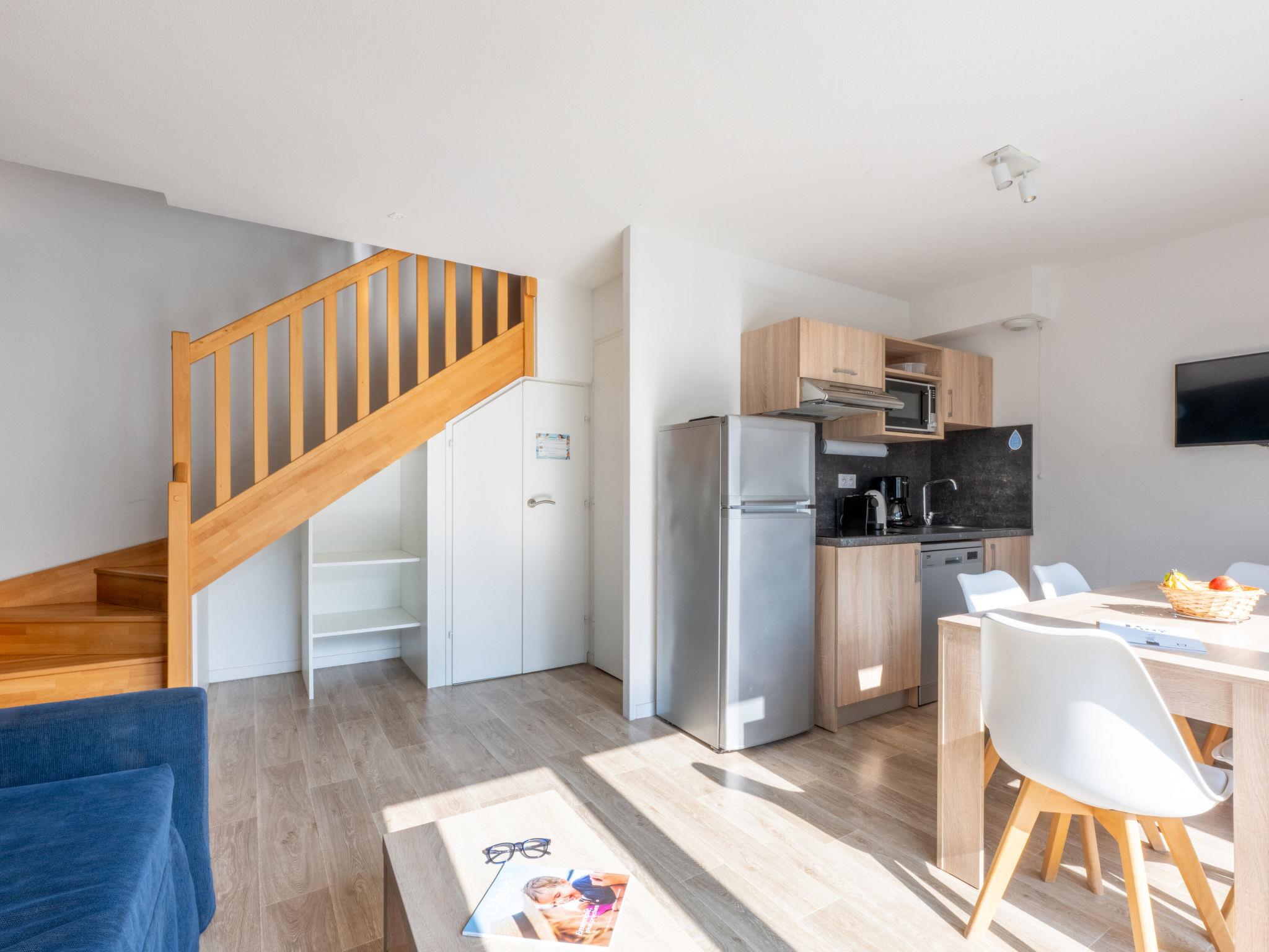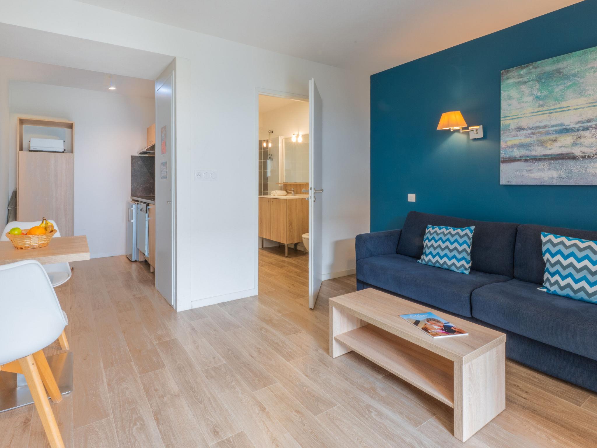 " Odalys Collection Le Domaine des Pins", 2-room apartment 34 m2, on the ground floor. Modern furnishings: living/sleeping room with 1 double sofabed, dining table and satellite TV (flat screen). Exit to the terrace. 1 double bedroom. Small, open kitchen (dishwasher, 2 ceramic glass hob hotplates, toaster, kettle, freezer, electric coffee machine, combination microwave). Bath/WC. Electric heating. Terrace. Terrace furniture. Facilities: children's high chair, baby cot, hair dryer. Internet (WiFi, free). Parking. Please note: non-smokers only. Maximum 2 pets/ dogs allowed. Smoke alarm, fire extinguisher.
