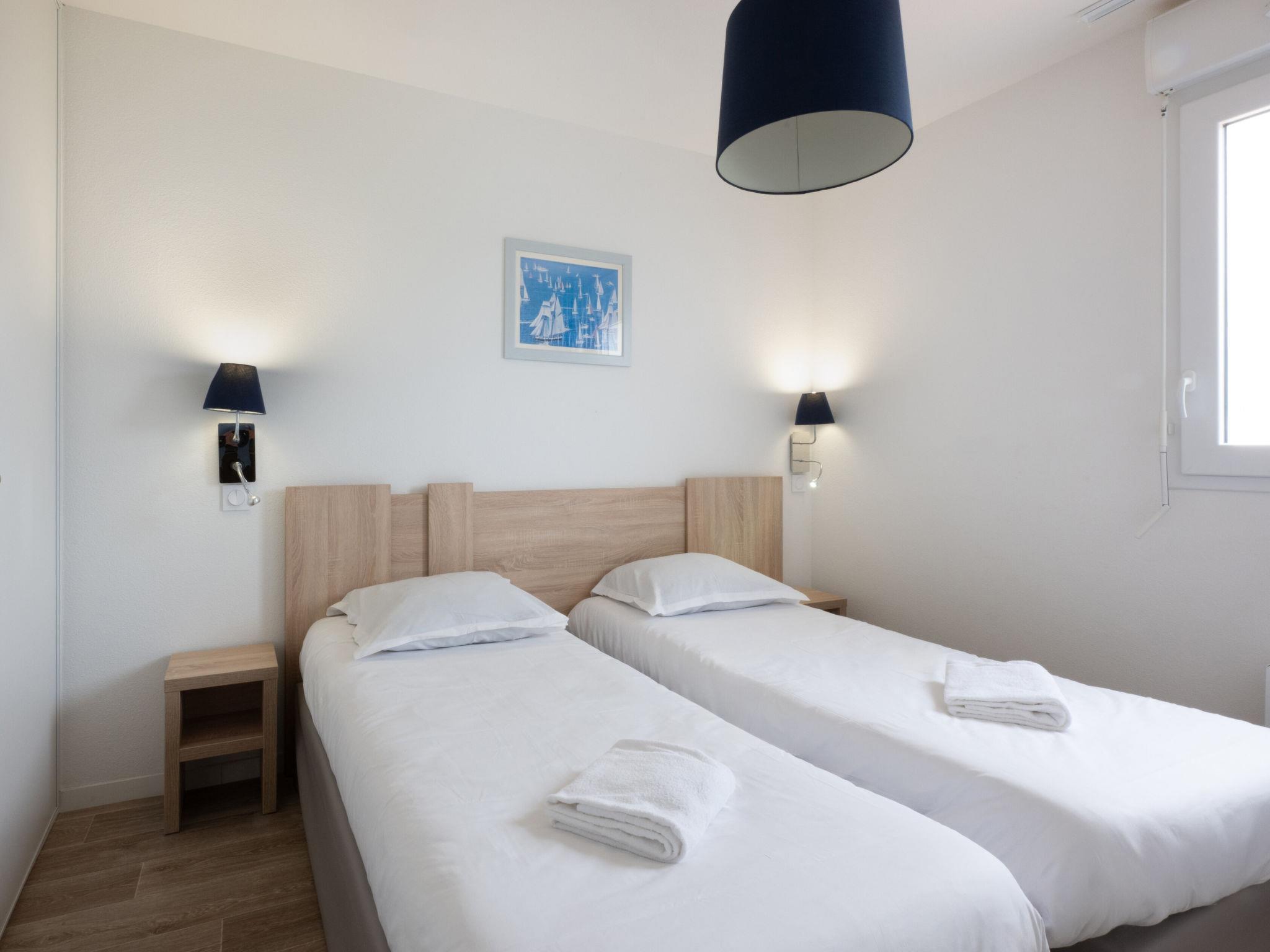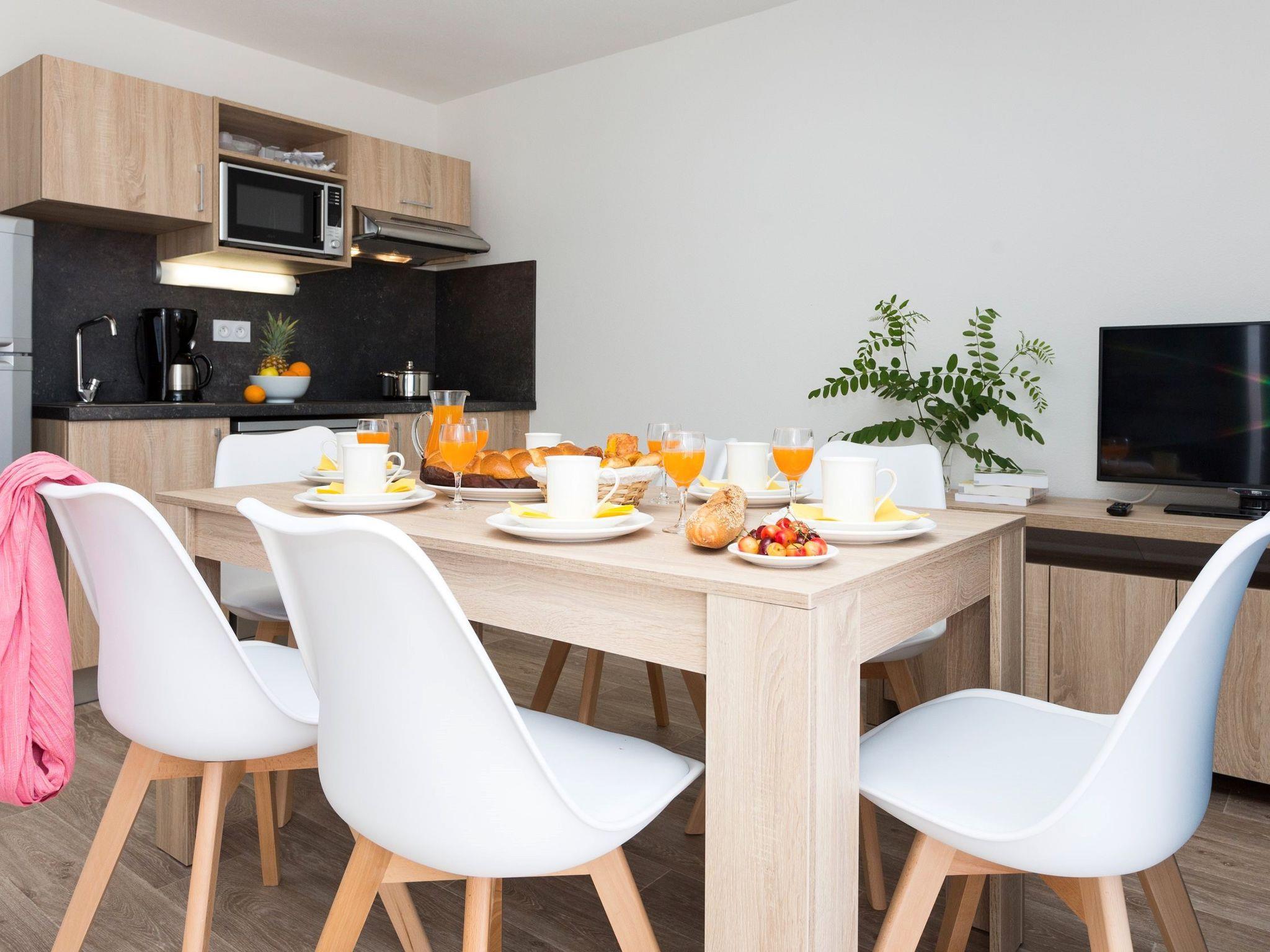 " Odalys Collection Le Domaine des Pins", 3-room apartment 47 m2 on 2 levels. Modern furnishings: living/sleeping room with 1 bed, 1 double sofabed, dining table and satellite TV (flat screen). Exit to the balcony. Open kitchen (dishwasher, 4 ceramic glass hob hotplates, toaster, kettle, electric coffee machine, combination microwave). Upper floor: 1 room with 1 french bed. 1 room with 2 beds. Bath/WC. Electric heating. Balcony. Balcony furniture. Facilities: children's high chair, baby cot, hair dryer. Internet (WiFi, free). Please note: non-smokers only. Maximum 2 pets/ dogs allowed. Smoke alarm, fire extinguisher.