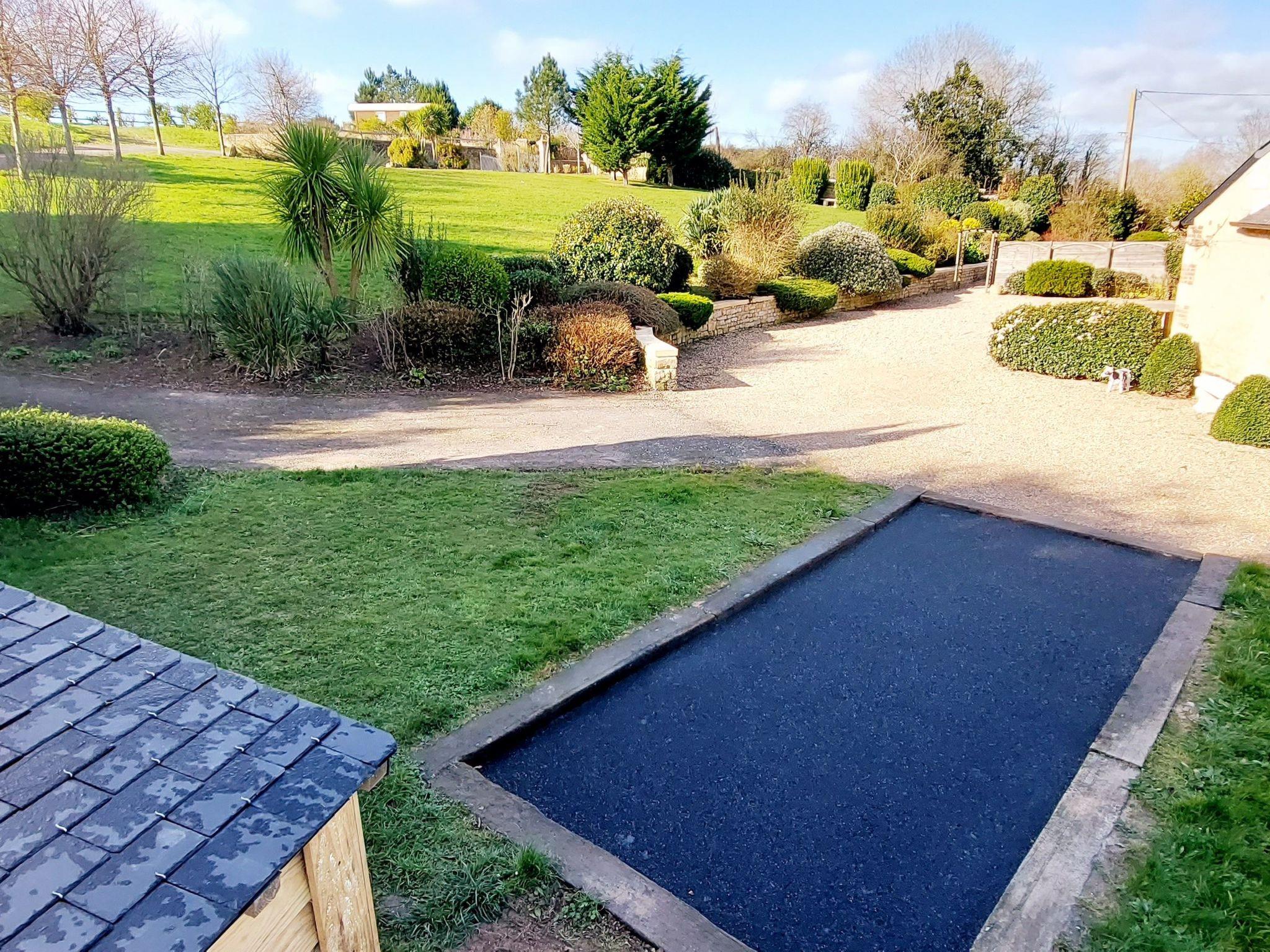 Petanque court and closed bicycle garage.