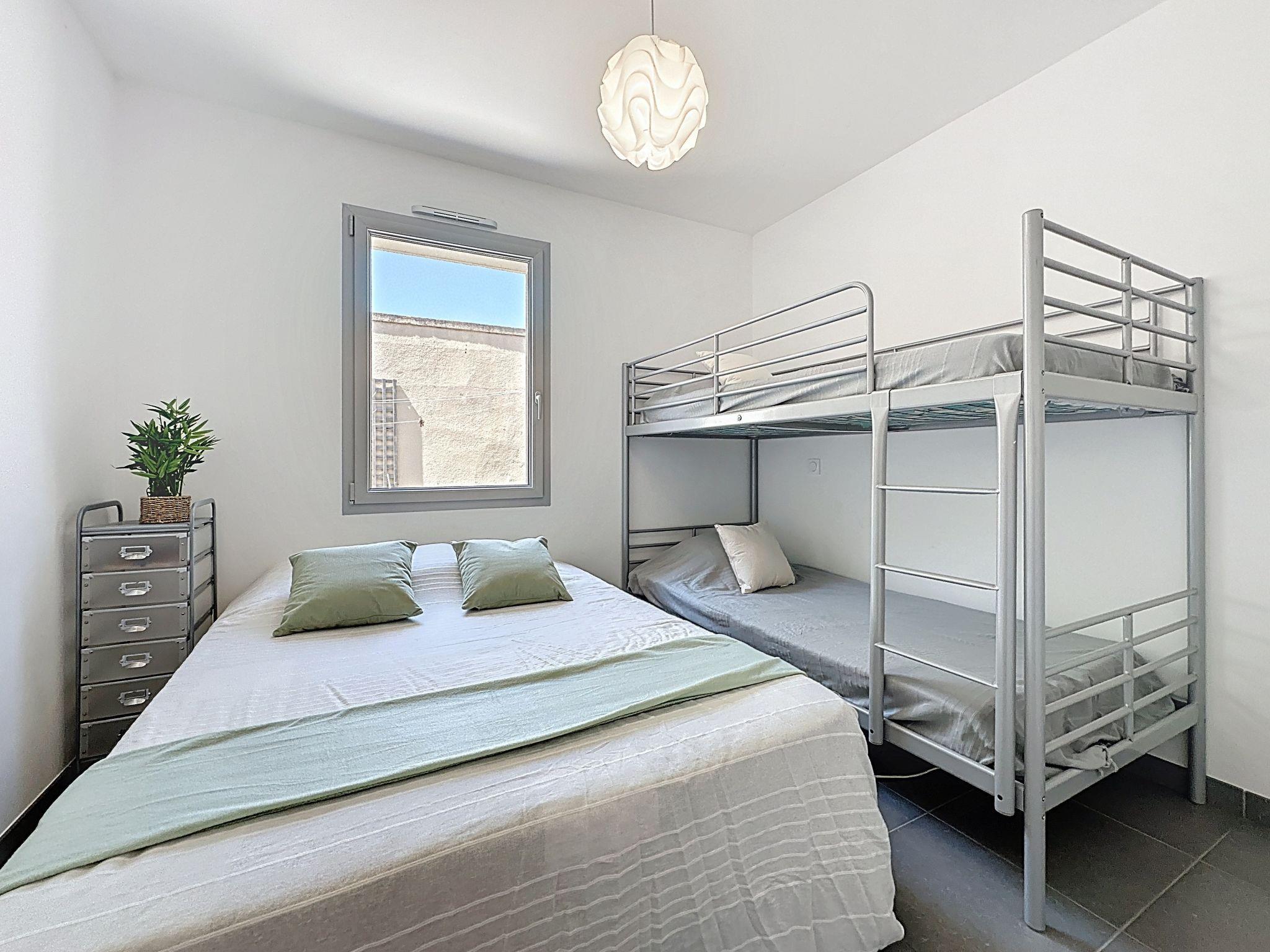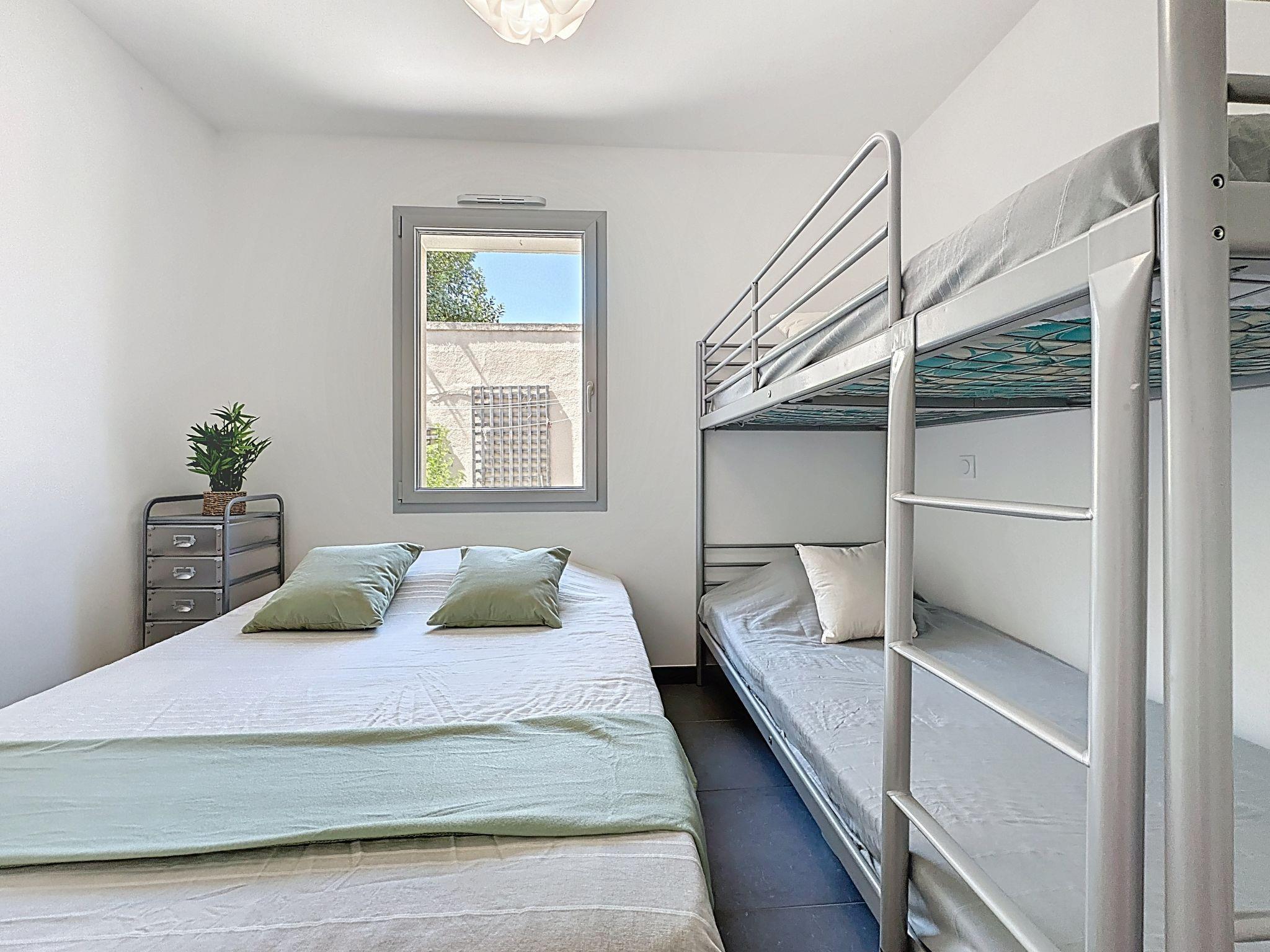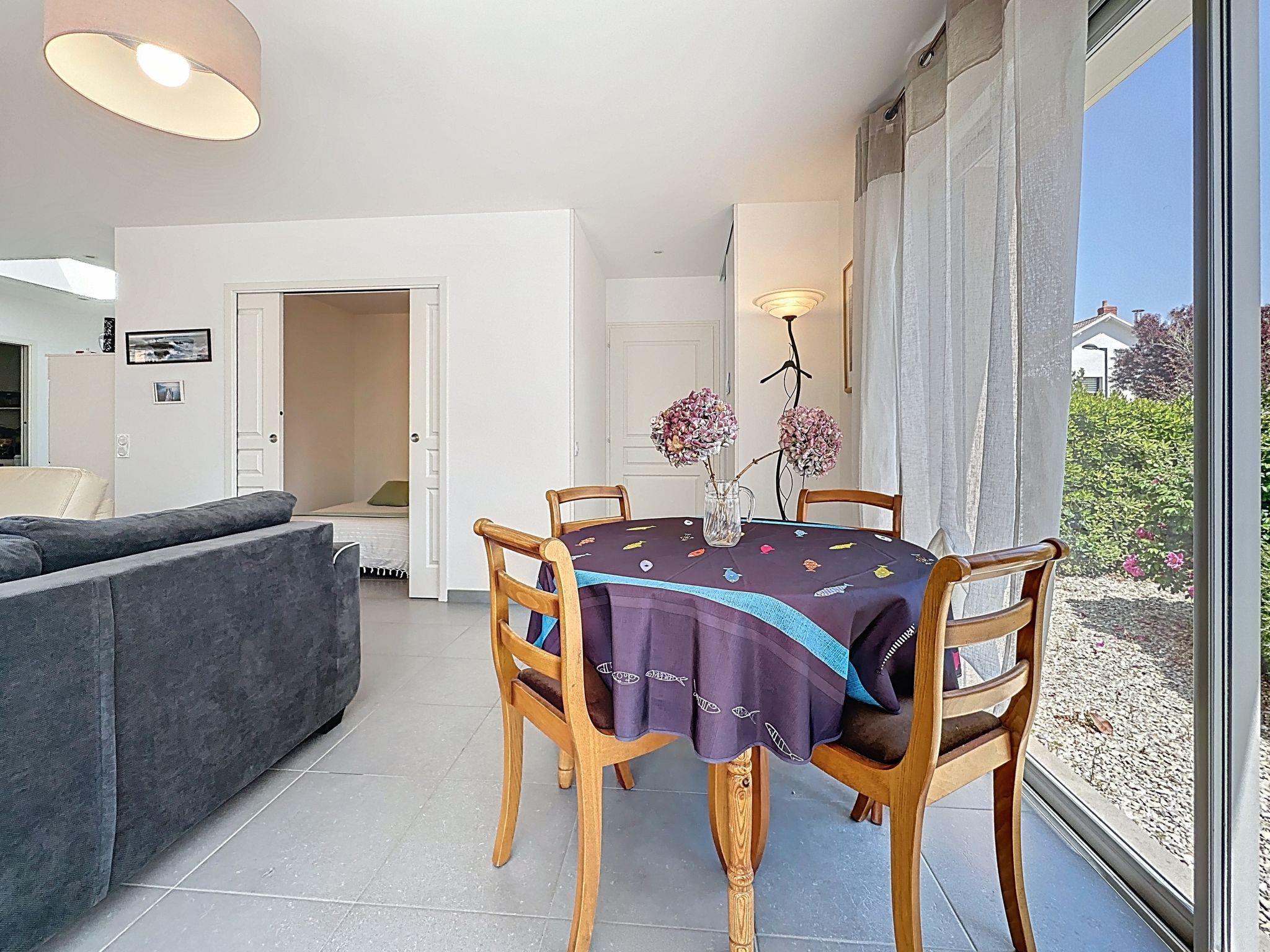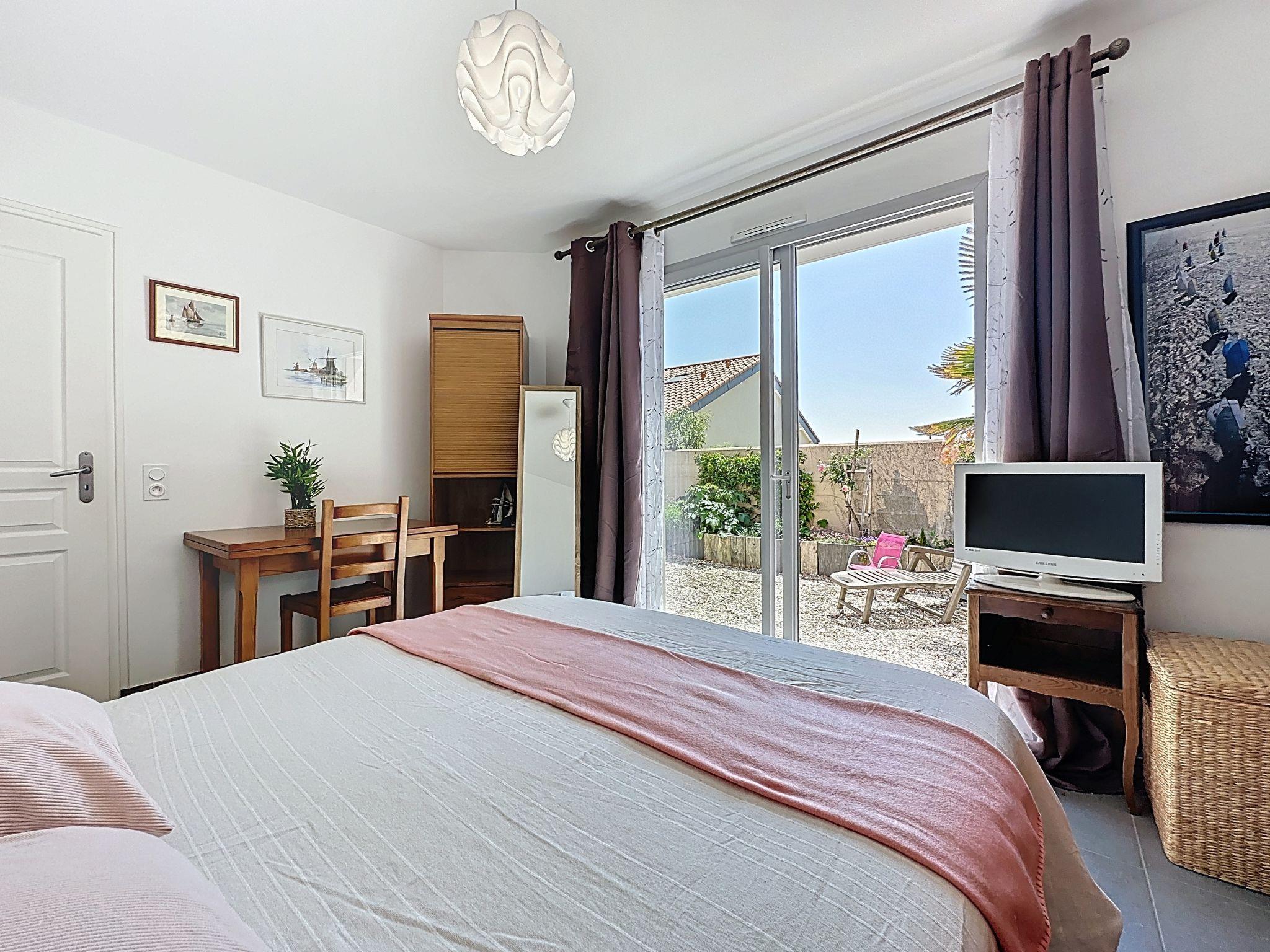 "Les Embruns", 4-room house 90 m2, south-west facing position. Simple furnishings: living/dining room with TV (flat screen). Exit to the garden, to the terrace, south facing position and west facing position. 1 large room with 1 french bed (1 x 140 cm, length 190 cm), TV (flat screen). Exit to the garden. 1 room with 1 x 2 bunk beds (90 cm, length 190 cm), 1 french bed (1 x 140 cm, length 190 cm). 1 room, without window with 1 double wall-trunk bed (1 x 140 cm, length 190 cm). Open kitchen (oven, dishwasher, 1 induction hot plates, 3 gas rings, toaster, kettle, microwave, freezer, electric coffee machine) with dining table. Shower/WC, sep. WC, double hand-basin. Floor heating. Terrace furniture, barbecue. Facilities: washing machine, dryer, iron, hair dryer. Internet (WiFi, extra). Parking (fenced), garage. Please note: non-smoking house. Maximum 1 small pet/ dog allowed. Smoke alarm. Offer by a private individual according to Art. 155, IV of CGI. 44012000279EA