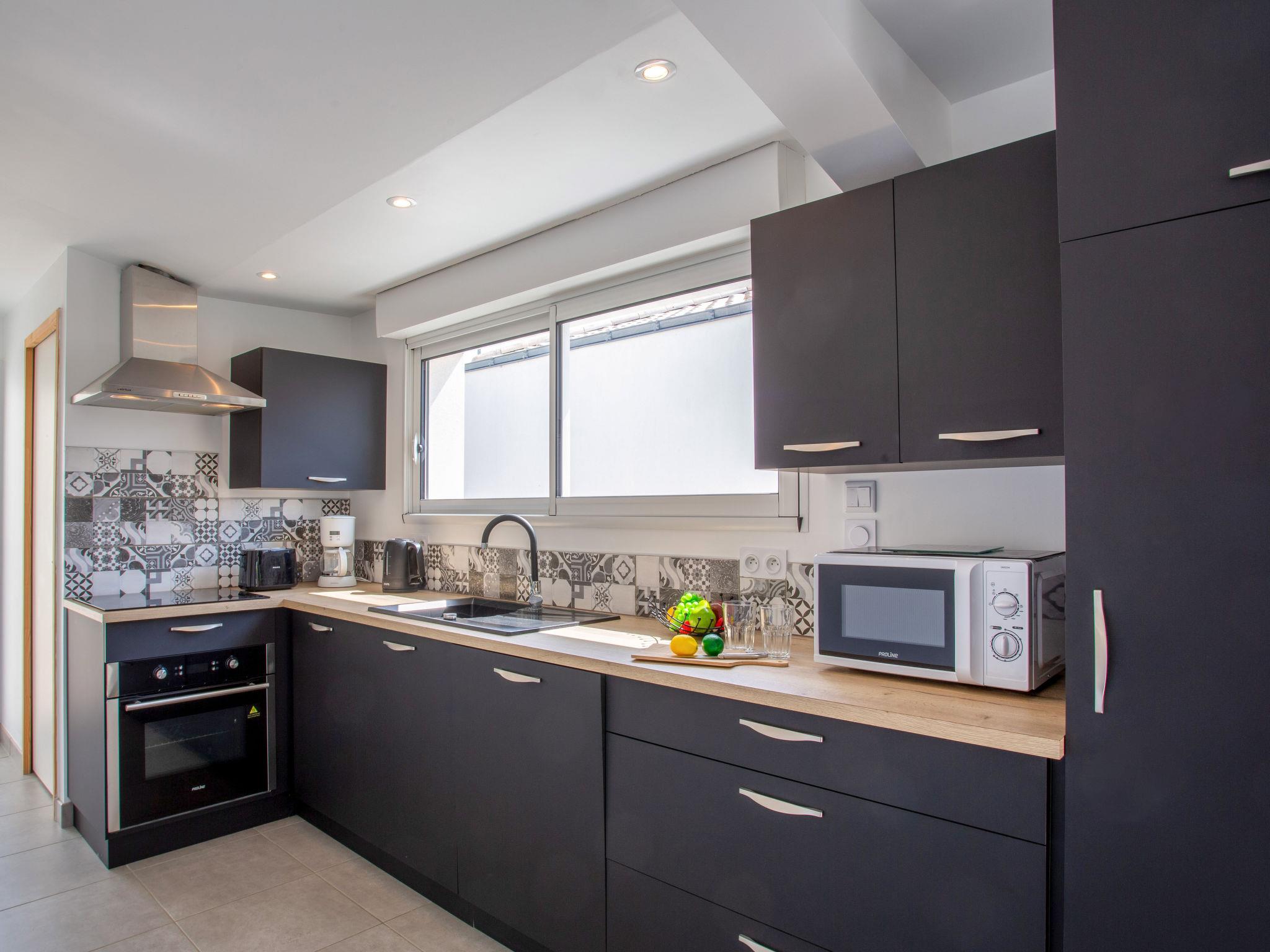 "L'Effet Mer", 2-room house 46 m2. Modern and cosy furnishings: living/dining room with 2 double sofabeds (2 x 140 cm, length 190 cm), TV (flat screen). 1 room with 2 beds (140 cm, length 190 cm). Open kitchen (oven, dishwasher, 3 induction hot plates, toaster, kettle, microwave, electric coffee machine). Shower, sep. WC. Electric heating. Terrace 21 m2, south facing position terrace 11 m2, east facing position. Terrace furniture, barbecue. Facilities: washing machine, iron, hair dryer. Internet (WiFi, free). Parking (fenced 1 car). Please note: non-smoking house. 1 small pet/ dog allowed. Smoke alarm. Offer by a private individual according to Art. 155, IV of CGI. 44012000034HH