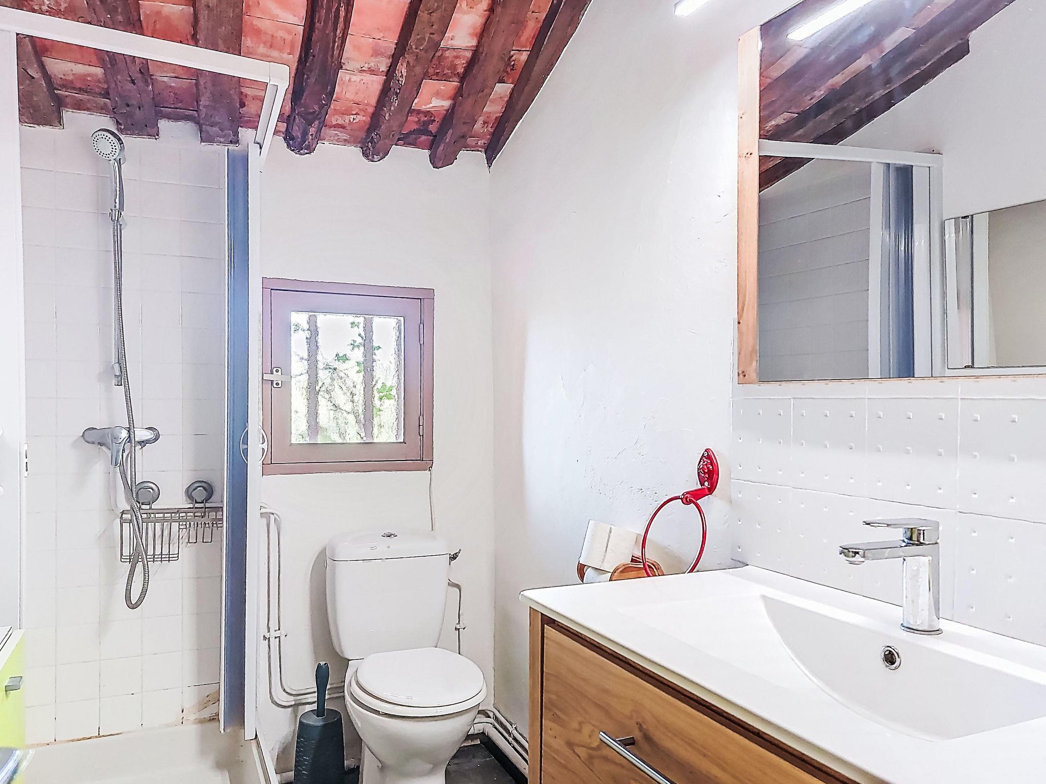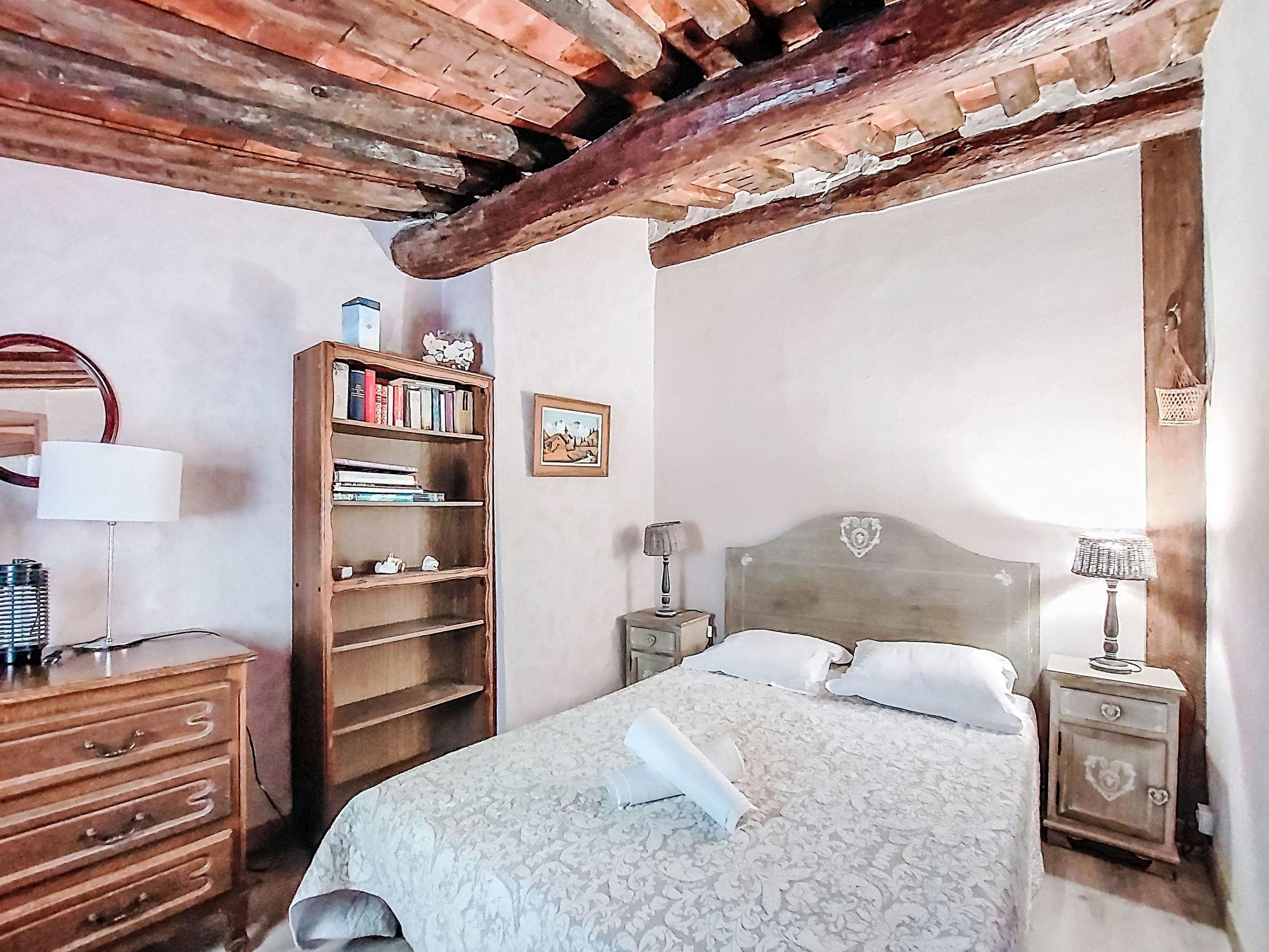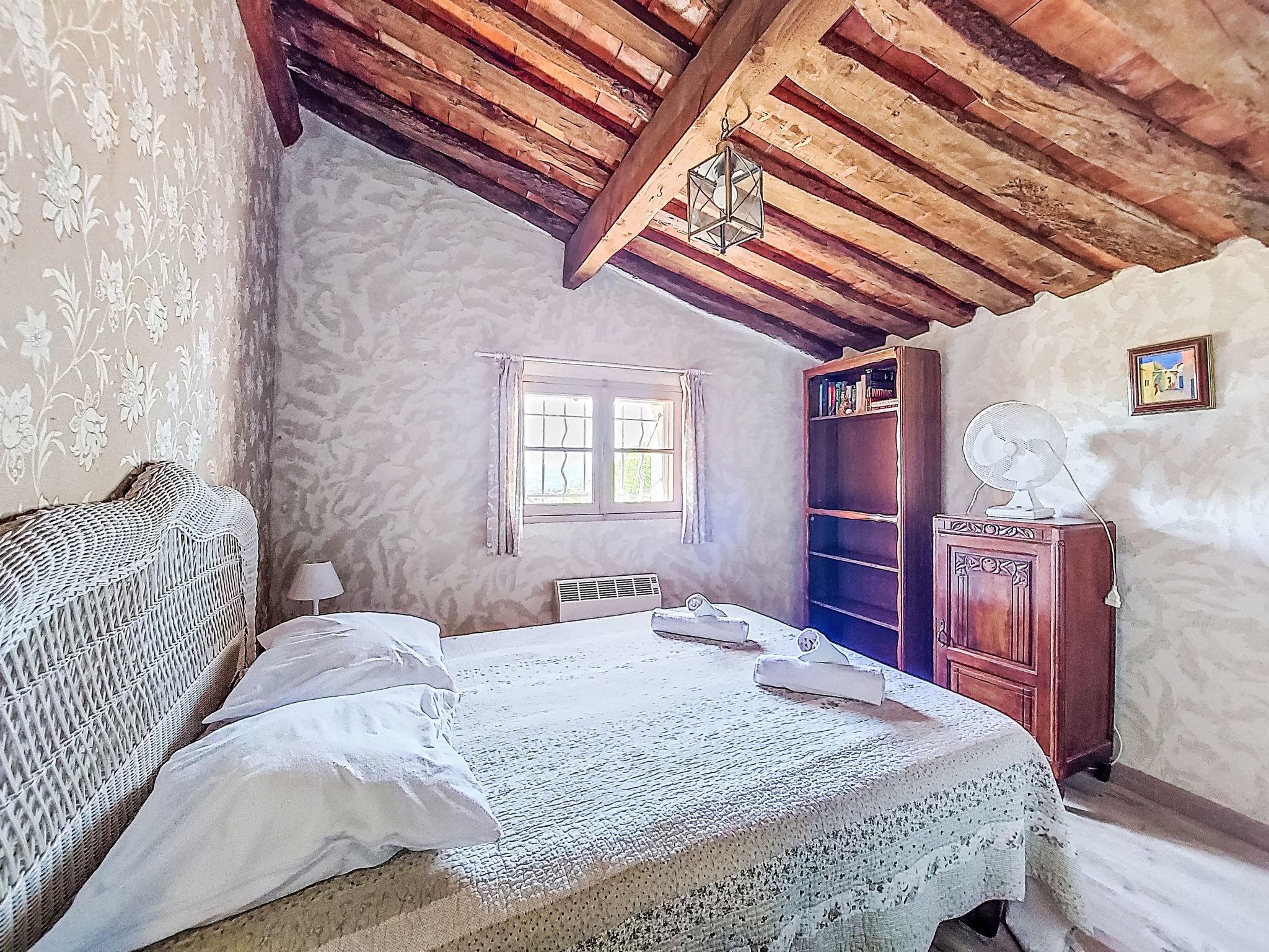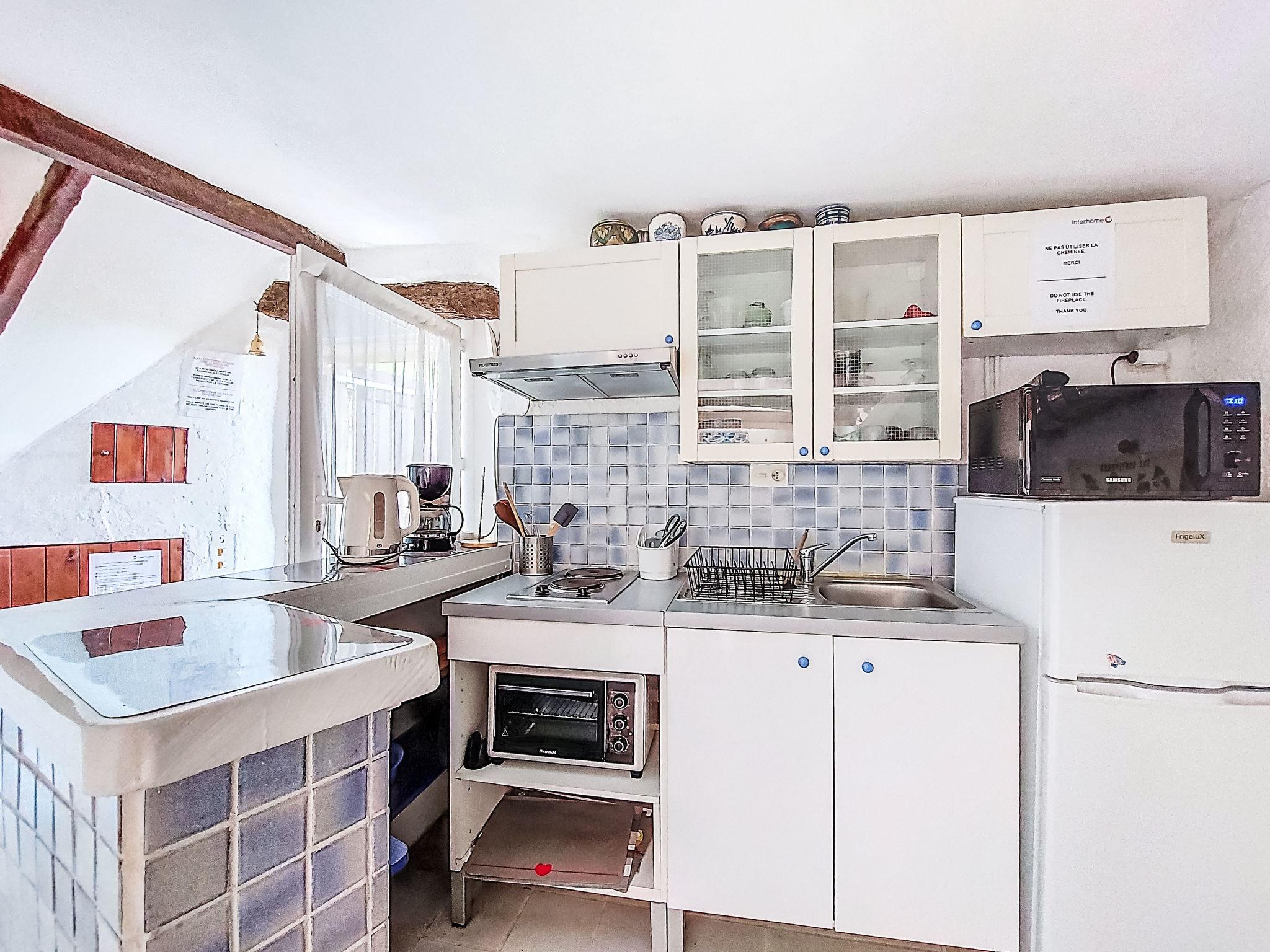 3-room house 70 m2 on 2 levels. Antique furnishings: living/dining room with TV, radio, CD-player and DVD. Small, open kitchen (2 hot plates, mini-oven, toaster, kettle, microwave, freezer, electric coffee machine). Upper floor: (open staircase), 1 room with 1 french bed (140 cm, length 190 cm). 1 room with 1 french bed (140 cm, length 190 cm). Shower/WC. Electric heating. Terrace 30 m2, south-west facing position. Terrace furniture, electric barbecue. Marvellous panoramic view of the sea and the countryside. Facilities: iron. Internet (WiFi, extra). Please note: maximum 1 small pet/ dog allowed. TV only FR. Smoke alarm.
