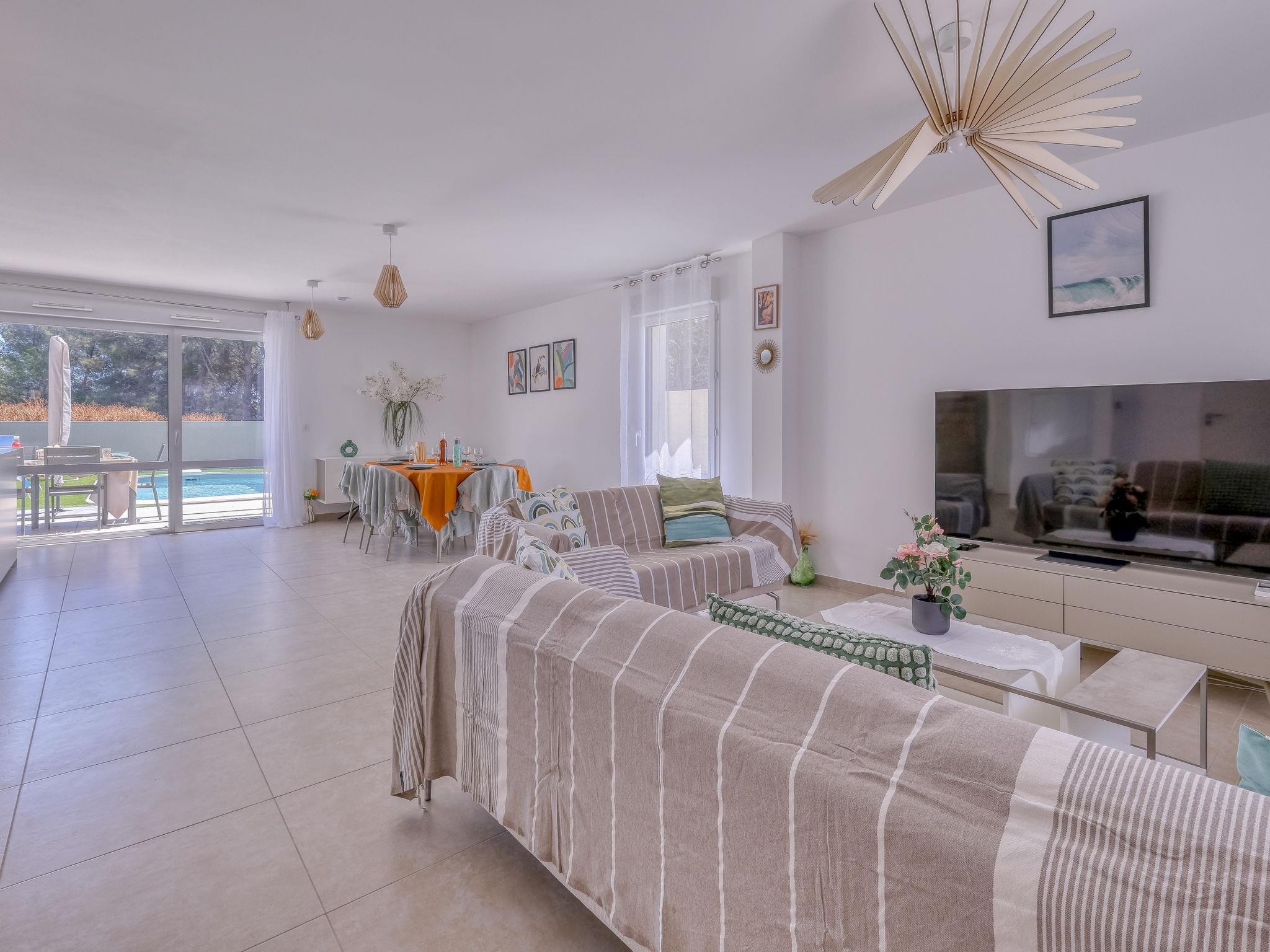 La Ciotat: Modern, beautiful, comfortable house "Villas Indigo", 2 storeys, terraced, built in 2022. 4.2 km from the centre of de la Ciotat, in a quiet position in the residential district, 2.2 km from the sea. Private: property (fenced), well-kept garden 150 m2, swimming pool angular (3 x 6 m, depth 120 - 160 cm, seasonal availability: 01.Jun. - 01.Oct.) with internal staircase and alarm system. Terrace (20 m2), garden furniture, parking (for 2 cars). Supermarket 1.2 km, restaurant 2.3 km, bus stop "Maurelle Nord" 600 m, railway station "La Ciotat - Ceyreste" 2.2 km, sandy beach "La Ciotat" 2.2 km, park "Du Domaine de la Tour" 2 km. Sports harbour 4.3 km, golf course (18 hole) 14 km, tennis 2.1 km. Nearby attractions: Aqualand à St Cyr sur mer 9 km, Zoa à Bandol 26 km, Bowling à Bandol 26 km, OK Corral à Cuges les Pins 18 km. Hiking paths: Sainte Baume, Sainte Victoire, Calanques Port-Cros, Porquerolles, Ile verte, Embiez, Figuerolles, Cassis. The owner does not accept any youth groups. The keys‘ handover takes place by the agency INTERHOME in St Cyr sur mer, 11 km.