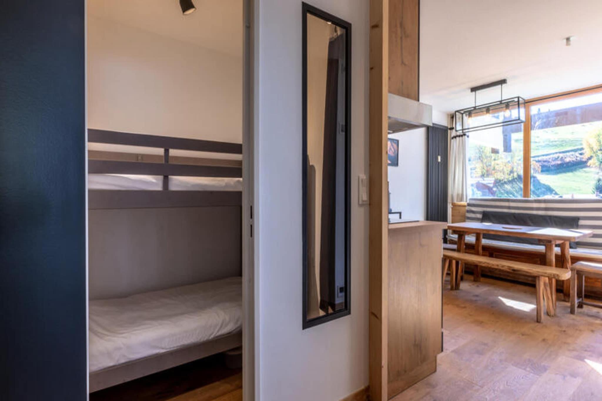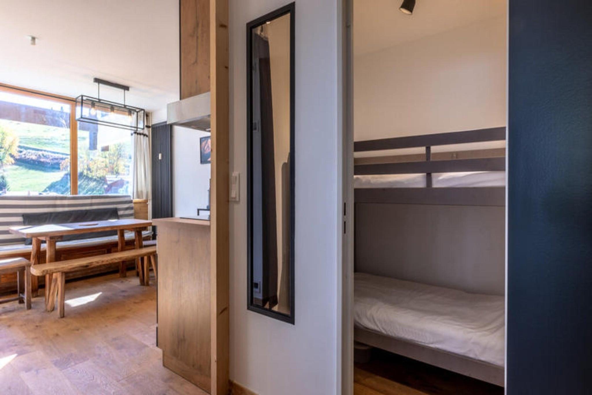 Ejendommen tilbyder sammen med en funktionel indretning et hyggeligt rum for op til 6 gæster. Denne lejlighed på 53 m² har to separate værelser, et bjerghjørne med dobbeltseng og et soveværelse med to køjesenge og en ekstra enkeltseng. I stuen er der en udtrækssovesofa og et fladskærms-tv, der byder på masser af siddepladser til afslapning. Gæsterne kan også nyde en sydvendt balkon med udsigt over det omkringliggende område. Mens kæledyr ikke er tilladt, tilbyder lejligheden dynebetræk, lagner og pudebetræk. Yderligere tjenester såsom rengøring og udlejning er tilgængelige efter anmodning, selvom kæledyr er forbudt. Bekvemt beliggende i Upper Village, er boligen kun 300 meter fra Telemix stoleliften og skileleskopet i Bossonnet, hvilket gør det til et ideelt valg for skientusiaster. Lejligheden ligger også tæt på en legeplads og en sportsplads, som giver sæsonbestemte rekreative muligheder. Et shuttlestop, som ligger kun 100 meter væk om vinteren og 140 meter om sommeren, giver nem adgang til andre dele af resortet. Nærliggende butikker samt transportmuligheder som La Clusaz busstation og Annecy SNCF togstation forbedrer lejlighedens tilgængelighed for besøgende. Tekøkkenet er udstyret med væsentlige apparater, herunder køleskab, glaskeramisk kogeplade, ovn, mikroovn og opvaskemaskine, hvilket sikrer, at gæsterne nemt kan tilberede deres måltider. En Nespresso kaffemaskine tilføjer et ekstra strejf af komfort. Lejligheden har desuden vaskemaskine i brusebadet, samt dekorativ pejs i stuen for at give en hyggelig atmosfære. Et skiskab er tilgængeligt på stedet for gæsternes bekvemmelighed, og centralvarmesystemet sikrer varme i de koldere måneder.