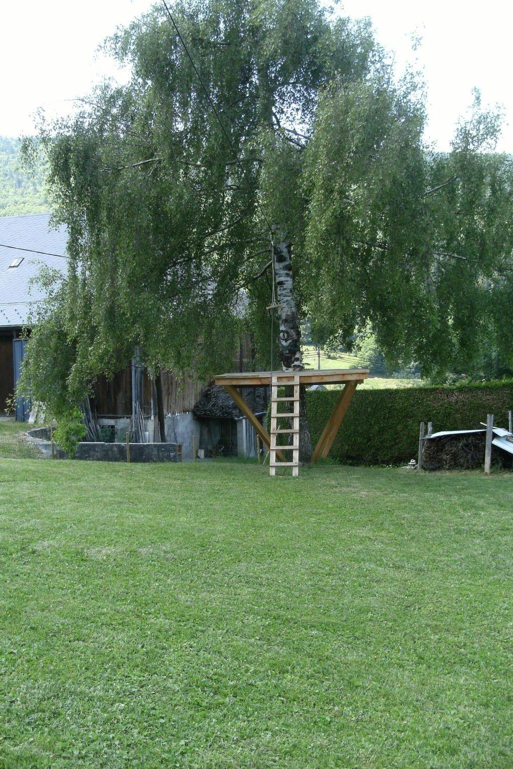 There is a balcony on the kitchen side. The terrace, with two garden chairs, leads down a few steps to the garden. Your children will be delighted: there's a large trampoline, a 60-metre-long zip line, a swing and an above-ground swimming pool (5.50 m in diameter and 1.20 m deep). Meanwhile, adults can relax on three sun loungers and admire the mountain scenery. There is also a seating area with a large wooden table and two 2.5-metre benches, as well as a parasol and a brick barbecue.