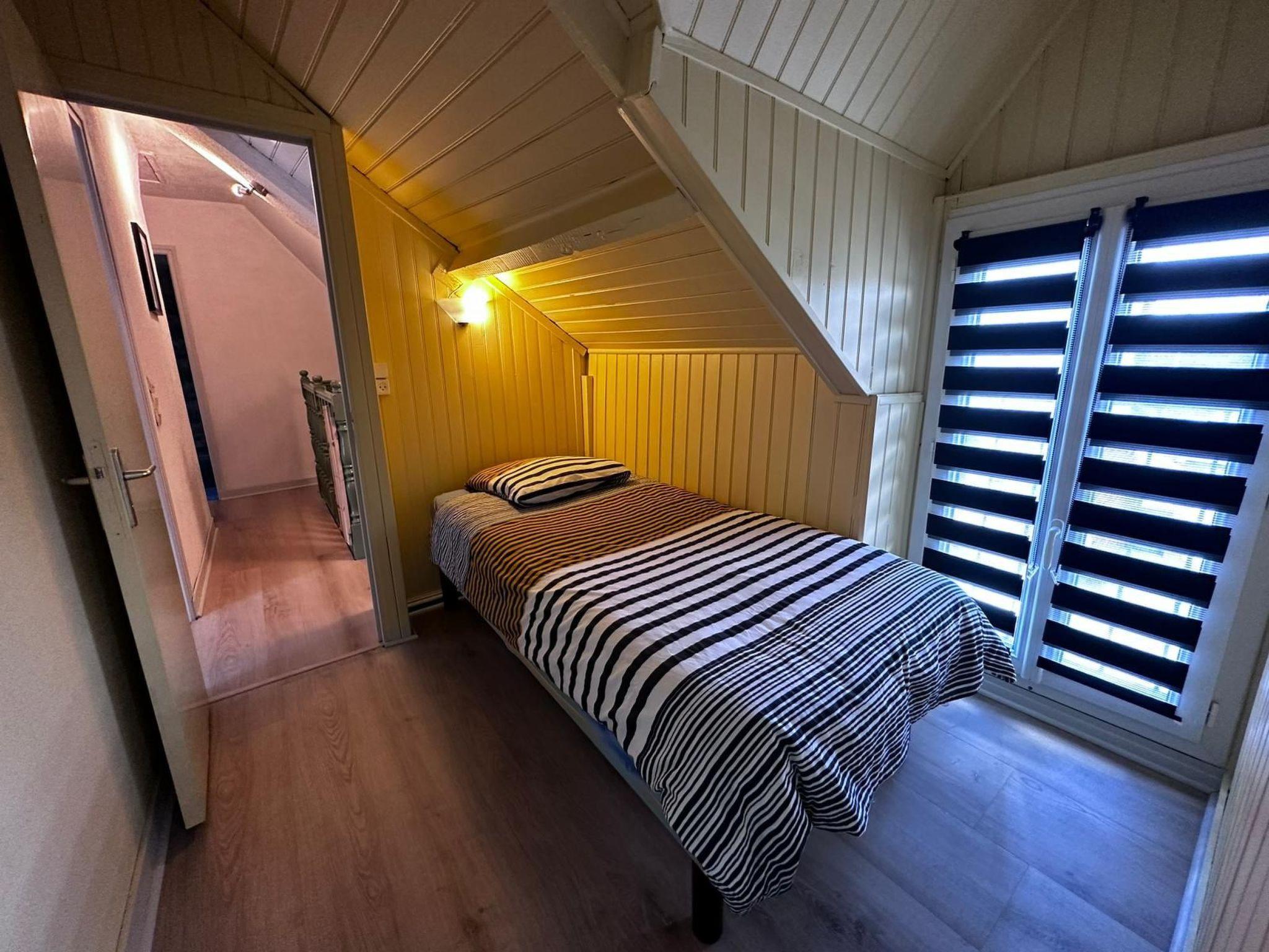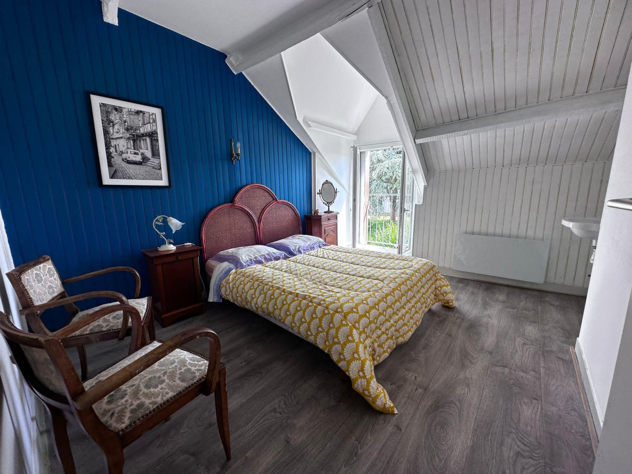 On the ground floor there is a fully equipped kitchen with a dining area. The living room is furnished with a comfortable lounge set with television around the fireplace. In the dining room with its large table, the wide window offers a lovely view of the garden. There is also a bathroom with bath and WC on this level. The three bedrooms are on the upper floor. The first bedroom is furnished with two single beds and a double bed. The other two have a double bed each and one bedroom has a water point and toilet. The outside areas, available exclusively to guests, include a parking space, a terrace with a large barbecue, a garden and a swimming pool.