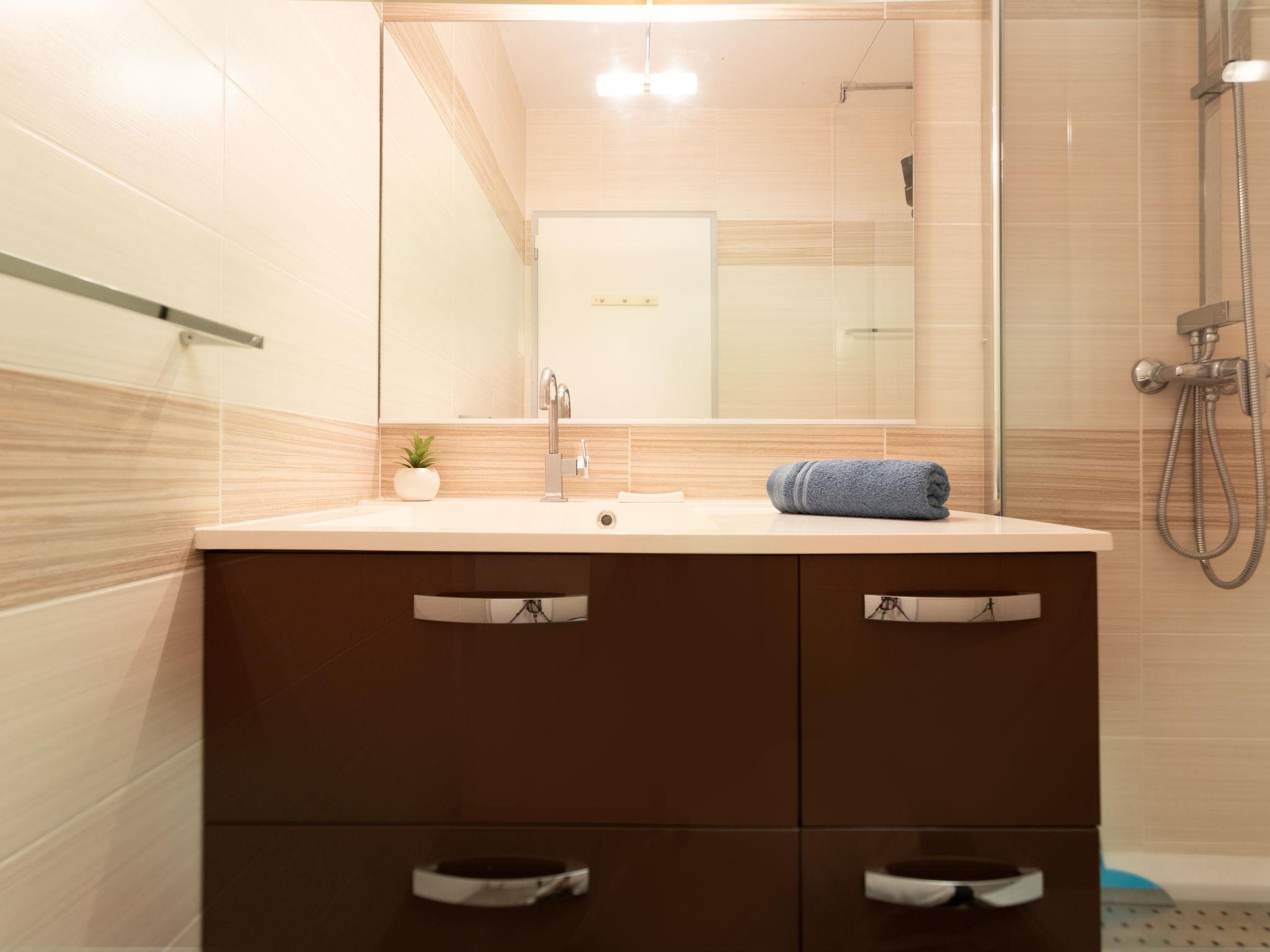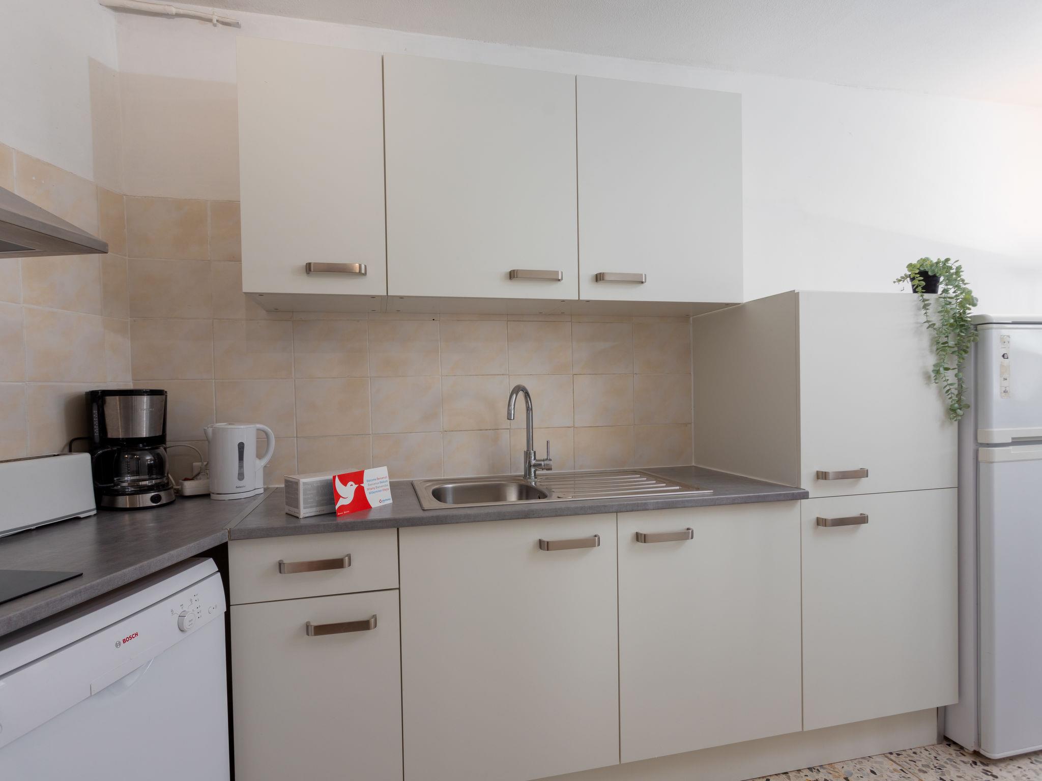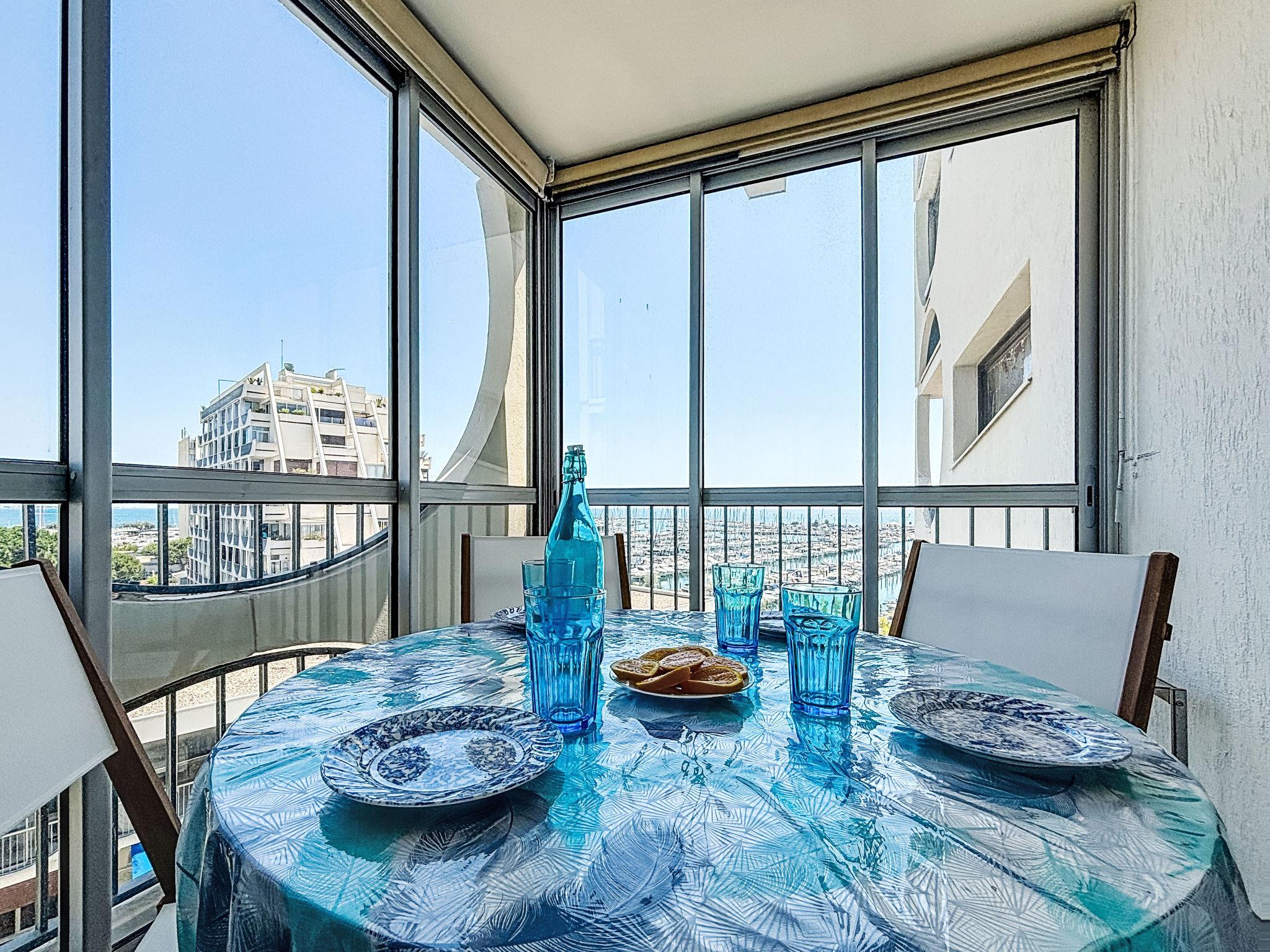 2-room apartment 48 m2 on 5th floor. Comfortable and beautiful furnishings: living/dining room with 1 double sofabed (140 cm, length 190 cm), TV (flat screen), electric heating and air conditioning. 1 room with 2 beds (90 cm, length 190 cm). Open kitchen (mini-oven, dishwasher, 2 ceramic glass hob hotplates, toaster, kettle, microwave, freezer, electric coffee machine). Shower, sep. WC. Terrace roofed, south-east facing position. Terrace furniture. Beautiful panoramic view of the sea and the port. Facilities: washing machine. Internet (WiFi, free). Parking at the house. Please note: smoke alarm.