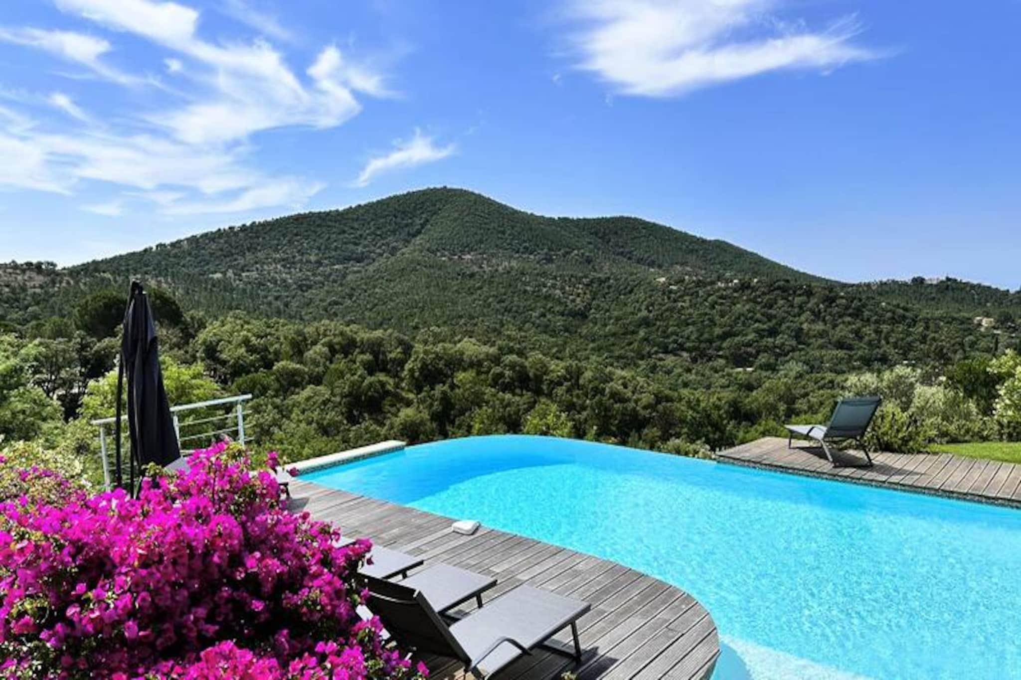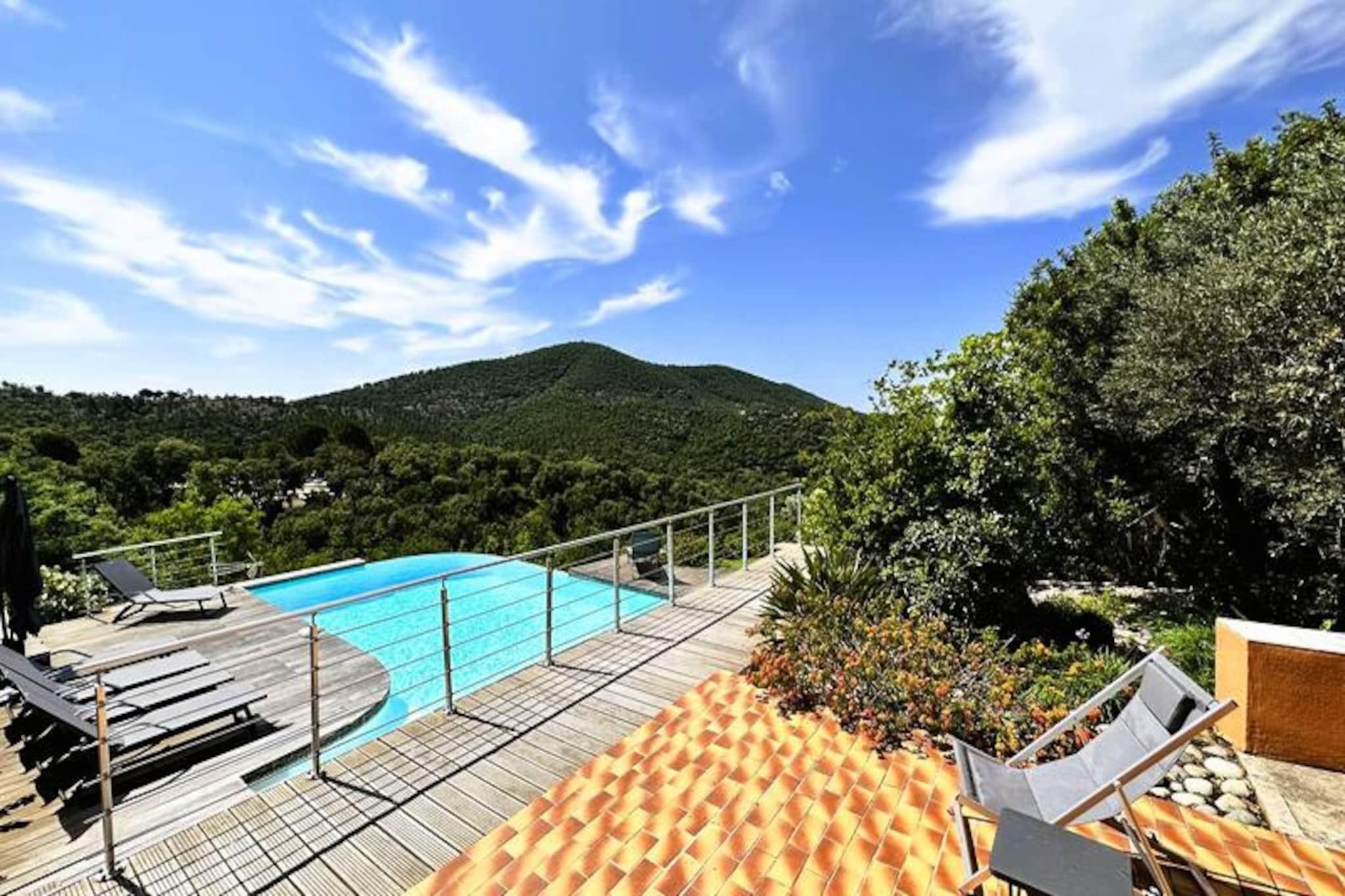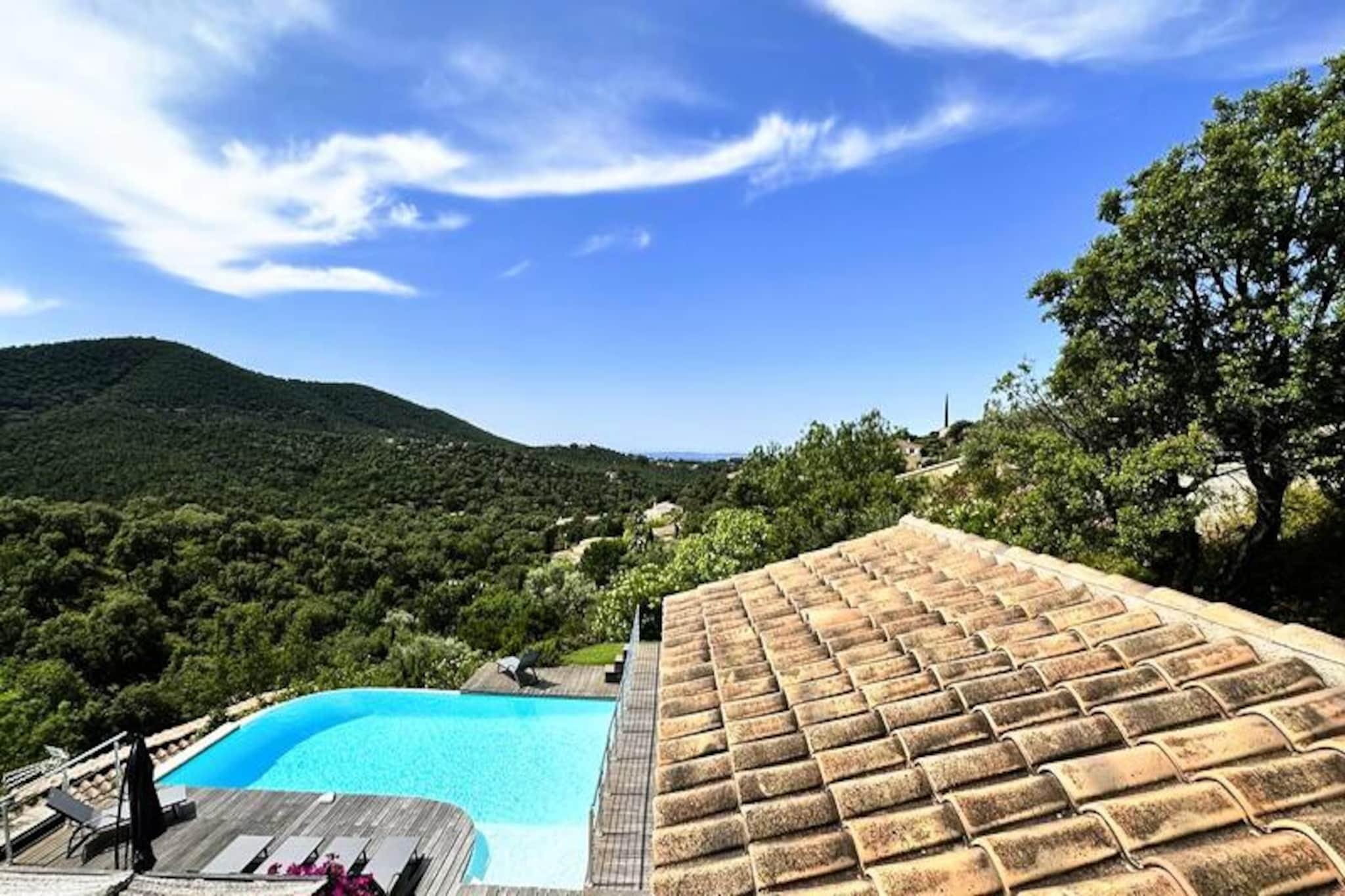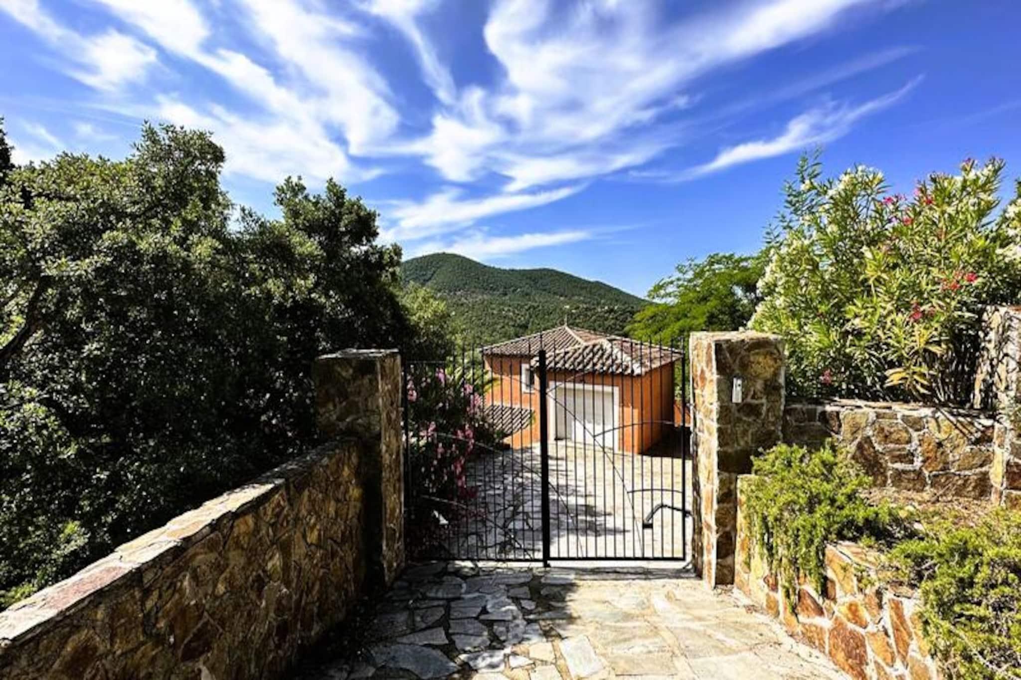 Beliggende i hjertet af Maures-massivet tilbyder denne luksuriøse villa en uforglemmelig flugt omgivet af frodige grønne bakker og en betagende havudsigt. Ejendommen har fuldt aircondition, en rummelig stue med udgang til træterrasser og en indbydende infinity-pool. Plads til op til ti gæster, det inkluderer en master suite med en queensize seng og privat terrasse adgang, to soveværelser ovenpå (en dobbeltseng og en tvilling), der deler et brusebad, og et selvstændigt anneks med to ekstra soveværelser, hver med en en -suite badeværelse. Denne ejendom er ikke-ryger, ikke kæledyrsvenlig og uegnet til små børn eller personer med nedsat mobilitet. Beliggende i det fredfyldte Domaine de Valcros, er denne villa kun en kort køretur fra de uberørte sandstrande i La Londe-les-Maures, med panoramaudsigt over De Gyldne Øer og de omkringliggende vinmarker. Nyd nærheden til en international golfbane, duftende maquis-dækkede bakker og turkisblåt middelhavsvand. I nærheden kan du udforske de charmerende byer Bormes-les-Mimosas og Hyères eller besøge travle markeder, cafeer ved havet og lokale attraktioner. Villaen er designet til ultimativ komfort og byder på et fuldt udstyret køkken med opvaskemaskine, vaskemaskine, tørretumbler og elektrisk Weber-grill. Slap af med Wi-Fi, et tilsluttet tv og rummelige udendørs terrasser perfekt til spisning eller afslapning. Parkering på stedet til to køretøjer er inkluderet sammen med valgfri leje af sengetøj og slutrengøring. Nyd et roligt tilflugtssted i dette fantastiske tilflugtssted på en bjergskråning.