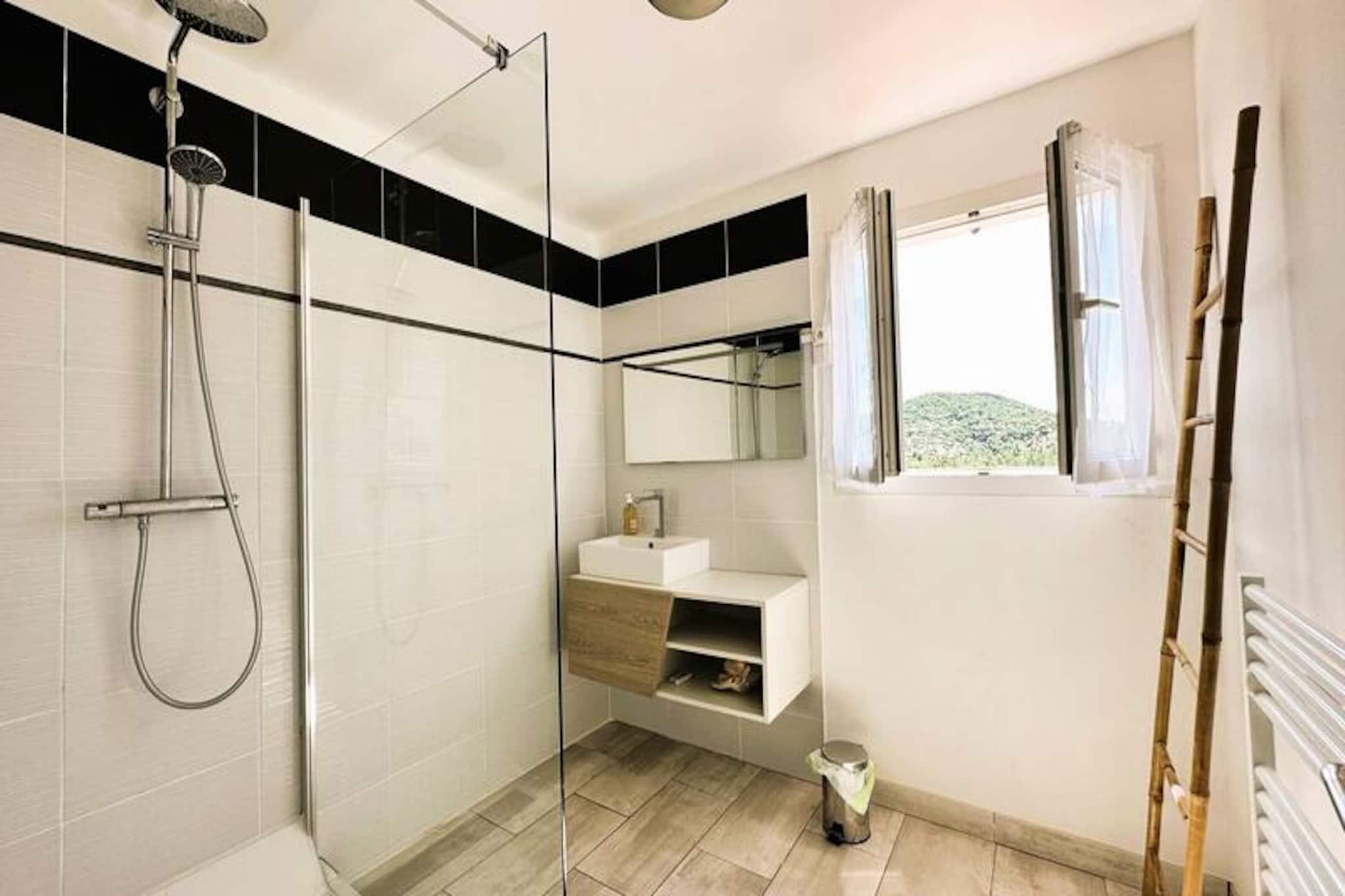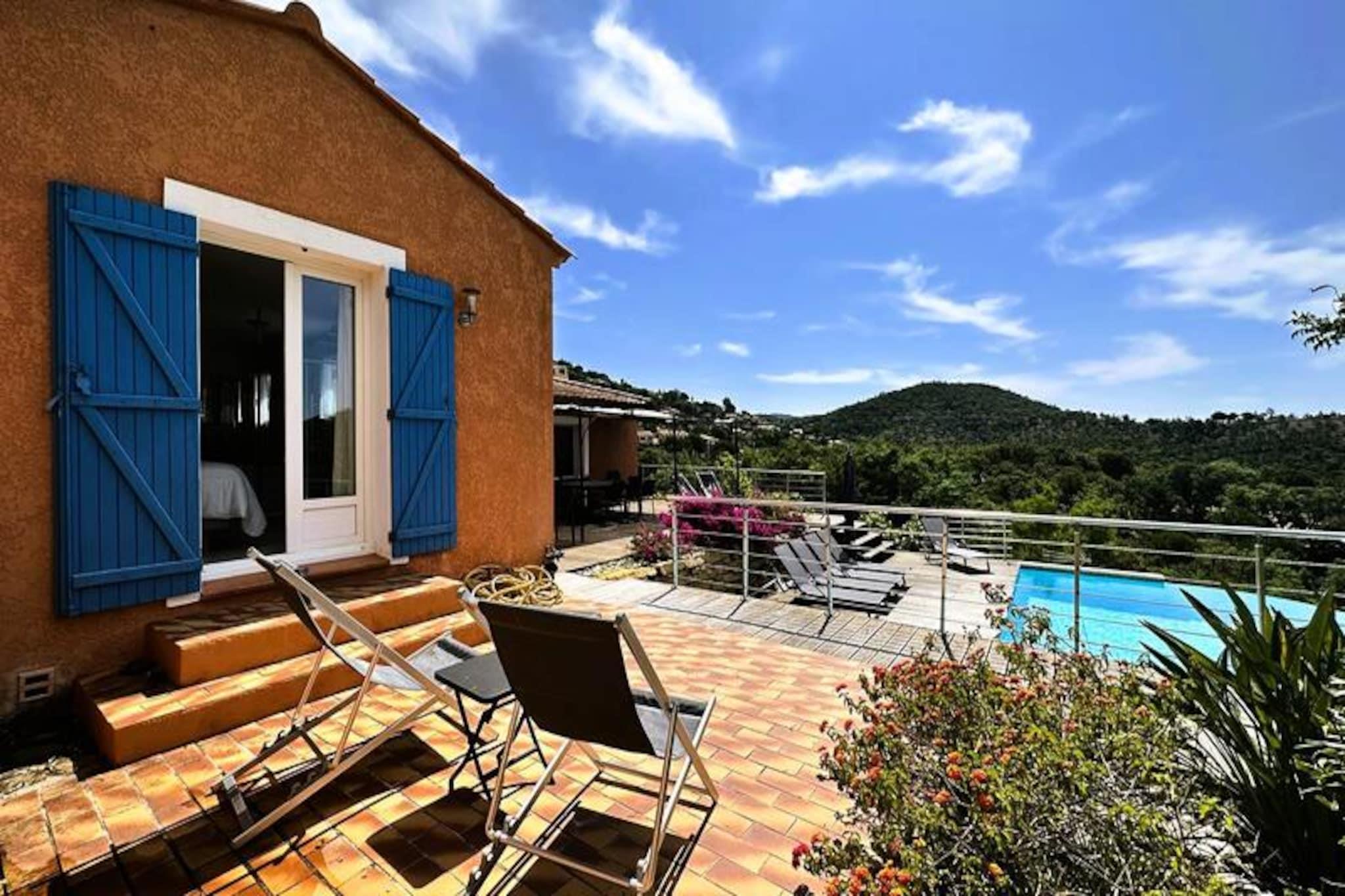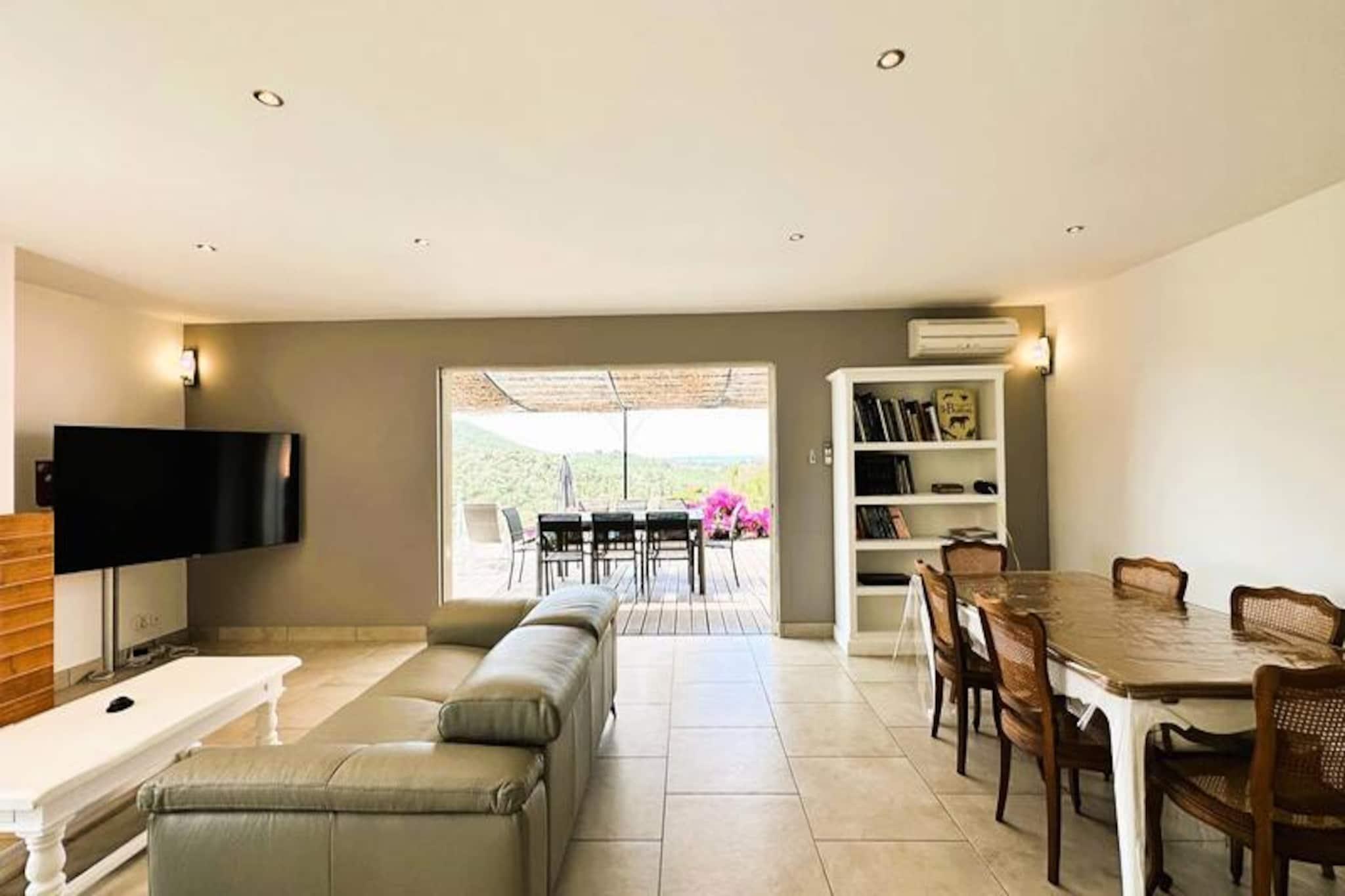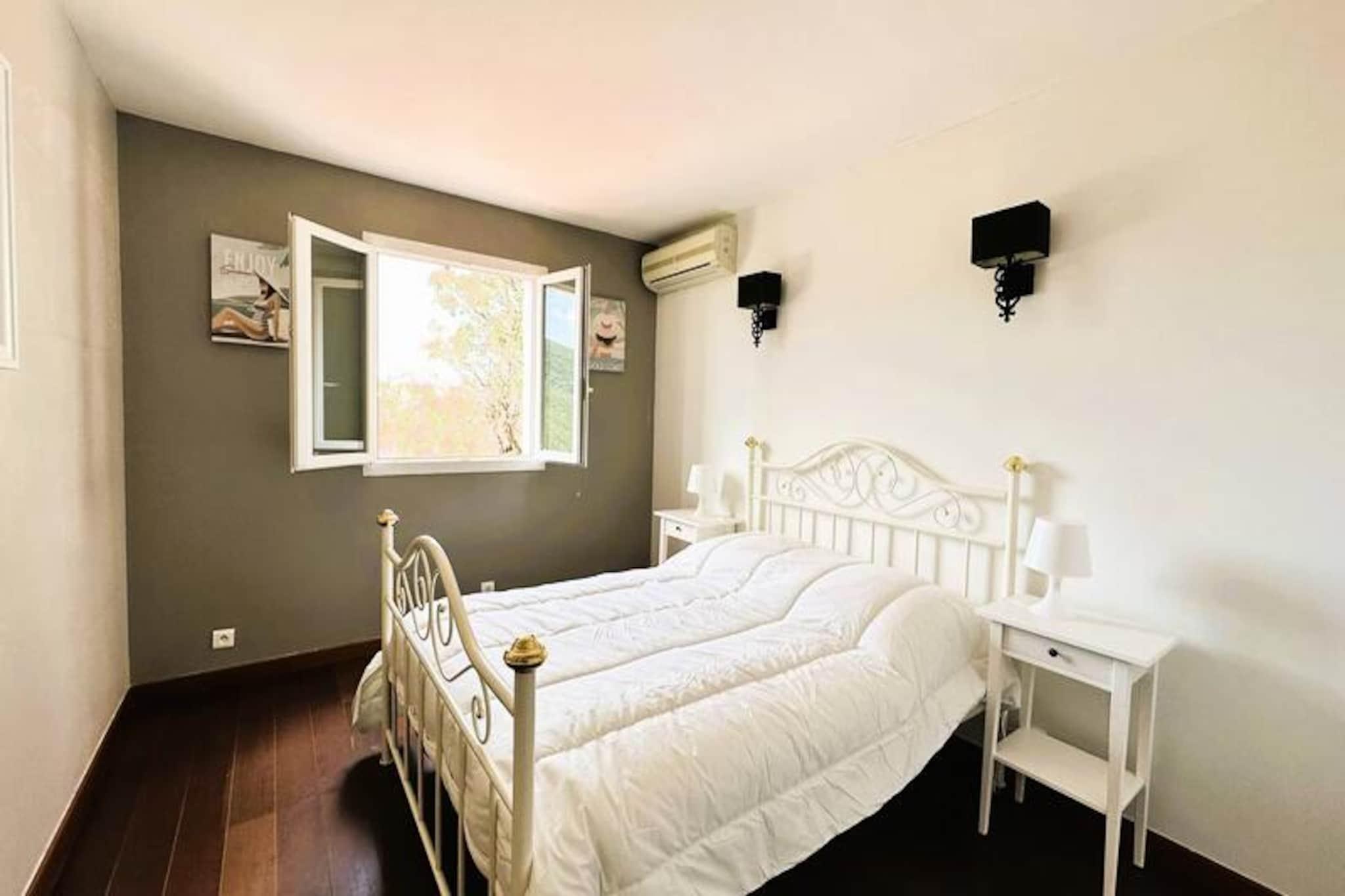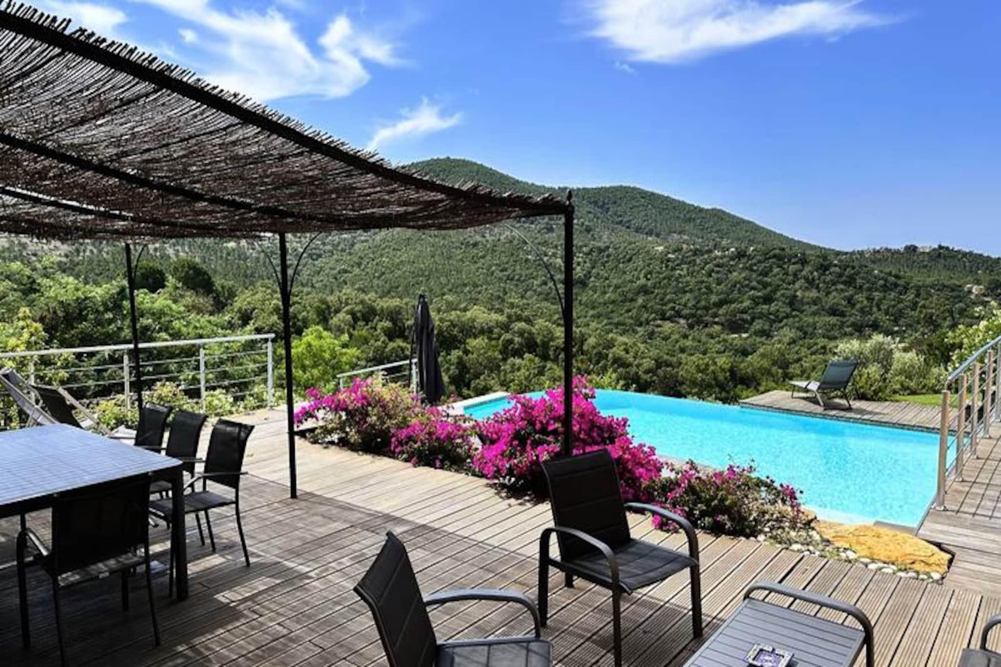 Beliggende i hjertet af Maures-massivet tilbyder denne luksuriøse villa en uforglemmelig flugt omgivet af frodige grønne bakker og en betagende havudsigt. Ejendommen har fuldt aircondition, en rummelig stue med udgang til træterrasser og en indbydende infinity-pool. Plads til op til ti gæster, det inkluderer en master suite med en queensize seng og privat terrasse adgang, to soveværelser ovenpå (en dobbeltseng og en tvilling), der deler et brusebad, og et selvstændigt anneks med to ekstra soveværelser, hver med en en -suite badeværelse. Denne ejendom er ikke-ryger, ikke kæledyrsvenlig og uegnet til små børn eller personer med nedsat mobilitet. Beliggende i det fredfyldte Domaine de Valcros, er denne villa kun en kort køretur fra de uberørte sandstrande i La Londe-les-Maures, med panoramaudsigt over De Gyldne Øer og de omkringliggende vinmarker. Nyd nærheden til en international golfbane, duftende maquis-dækkede bakker og turkisblåt middelhavsvand. I nærheden kan du udforske de charmerende byer Bormes-les-Mimosas og Hyères eller besøge travle markeder, cafeer ved havet og lokale attraktioner. Villaen er designet til ultimativ komfort og byder på et fuldt udstyret køkken med opvaskemaskine, vaskemaskine, tørretumbler og elektrisk Weber-grill. Slap af med Wi-Fi, et tilsluttet tv og rummelige udendørs terrasser perfekt til spisning eller afslapning. Parkering på stedet til to køretøjer er inkluderet sammen med valgfri leje af sengetøj og slutrengøring. Nyd et roligt tilflugtssted i dette fantastiske tilflugtssted på en bjergskråning.