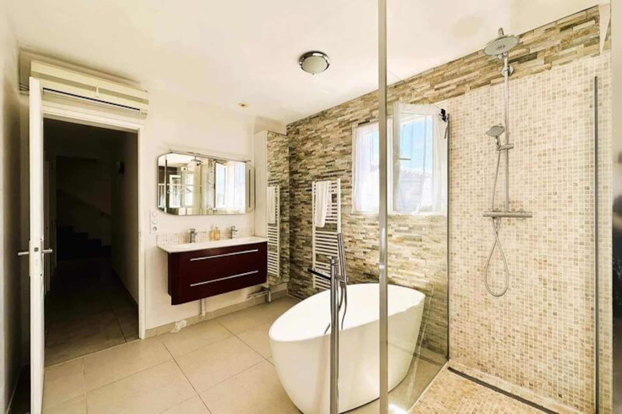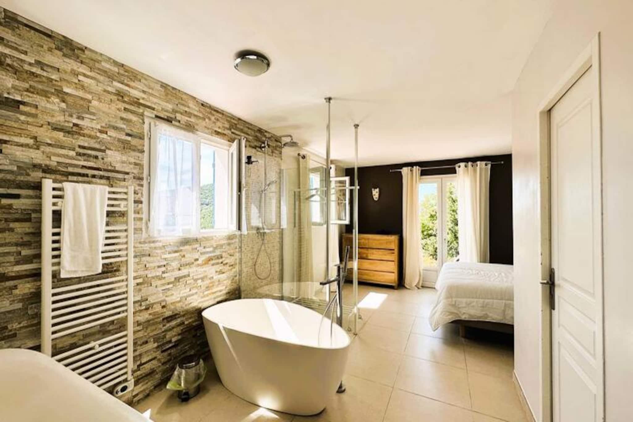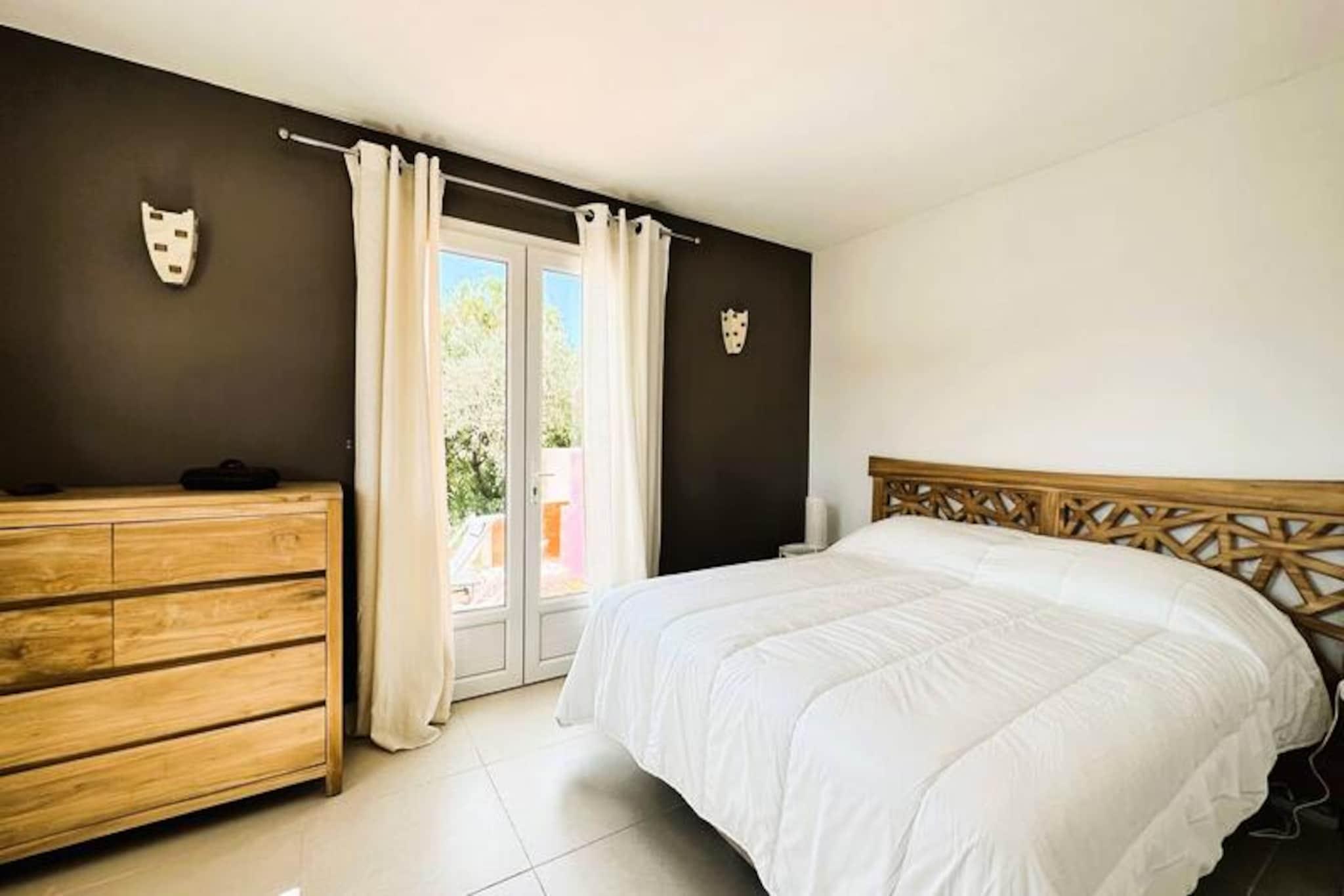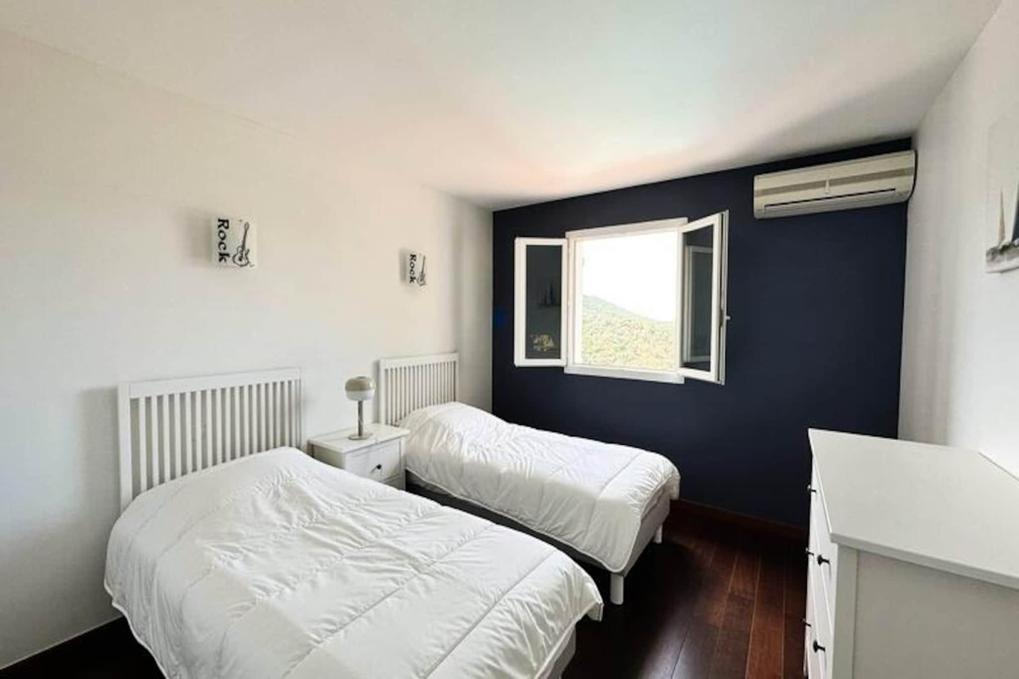 Beliggende i hjertet af Maures-massivet tilbyder denne luksuriøse villa en uforglemmelig flugt omgivet af frodige grønne bakker og en betagende havudsigt. Ejendommen har fuldt aircondition, en rummelig stue med udgang til træterrasser og en indbydende infinity-pool. Plads til op til ti gæster, det inkluderer en master suite med en queensize seng og privat terrasse adgang, to soveværelser ovenpå (en dobbeltseng og en tvilling), der deler et brusebad, og et selvstændigt anneks med to ekstra soveværelser, hver med en en -suite badeværelse. Denne ejendom er ikke-ryger, ikke kæledyrsvenlig og uegnet til små børn eller personer med nedsat mobilitet. Beliggende i det fredfyldte Domaine de Valcros, er denne villa kun en kort køretur fra de uberørte sandstrande i La Londe-les-Maures, med panoramaudsigt over De Gyldne Øer og de omkringliggende vinmarker. Nyd nærheden til en international golfbane, duftende maquis-dækkede bakker og turkisblåt middelhavsvand. I nærheden kan du udforske de charmerende byer Bormes-les-Mimosas og Hyères eller besøge travle markeder, cafeer ved havet og lokale attraktioner. Villaen er designet til ultimativ komfort og byder på et fuldt udstyret køkken med opvaskemaskine, vaskemaskine, tørretumbler og elektrisk Weber-grill. Slap af med Wi-Fi, et tilsluttet tv og rummelige udendørs terrasser perfekt til spisning eller afslapning. Parkering på stedet til to køretøjer er inkluderet sammen med valgfri leje af sengetøj og slutrengøring. Nyd et roligt tilflugtssted i dette fantastiske tilflugtssted på en bjergskråning.