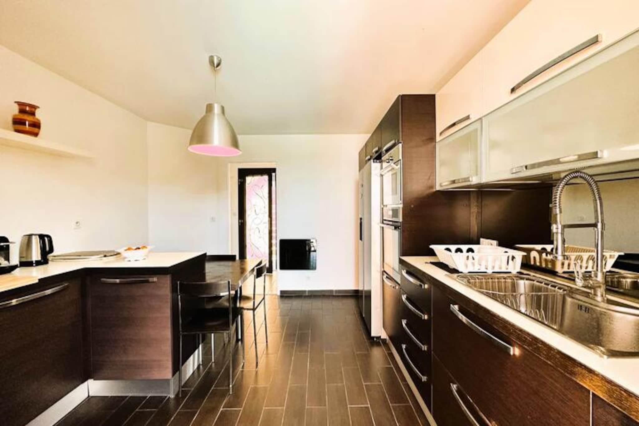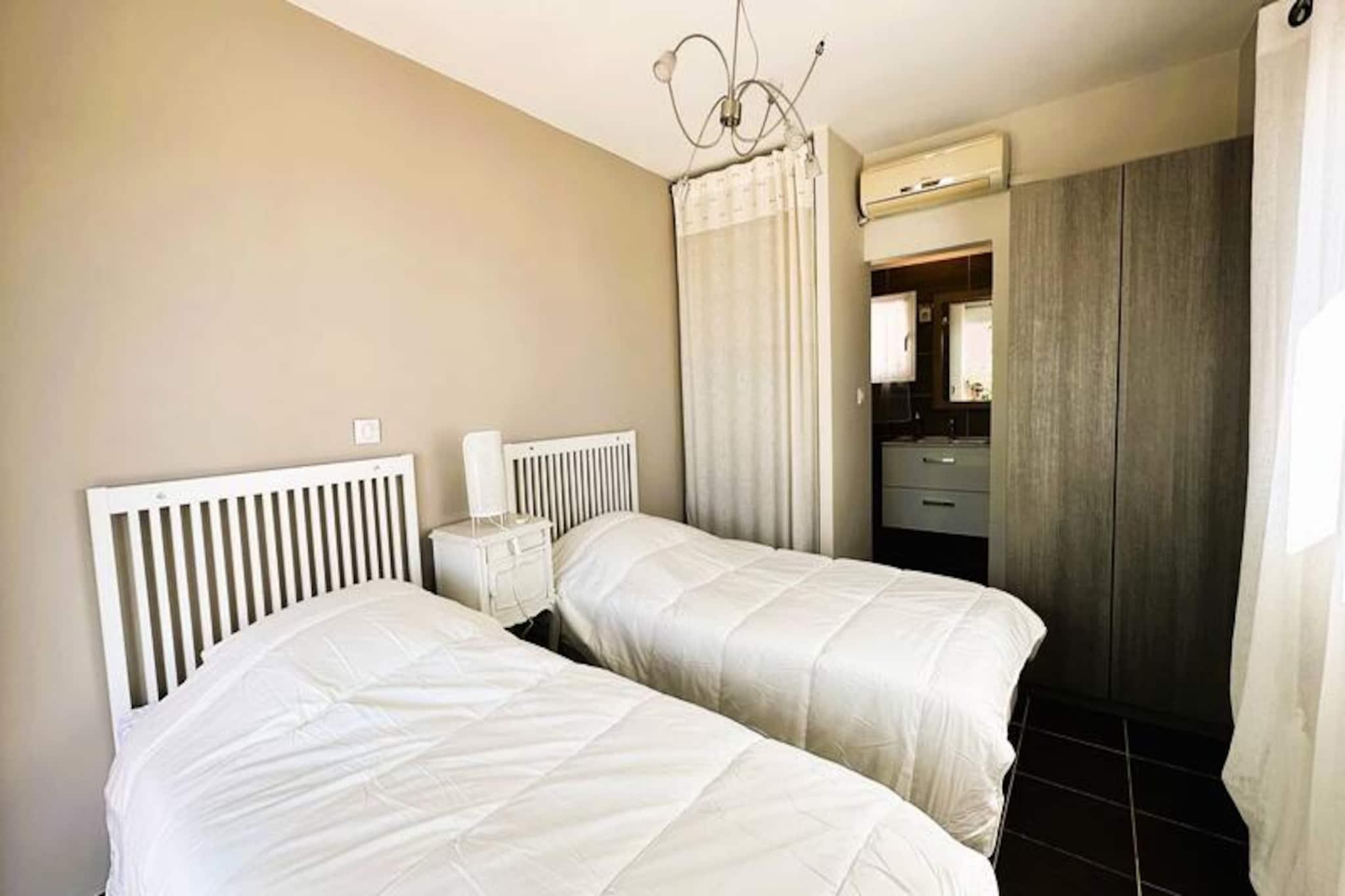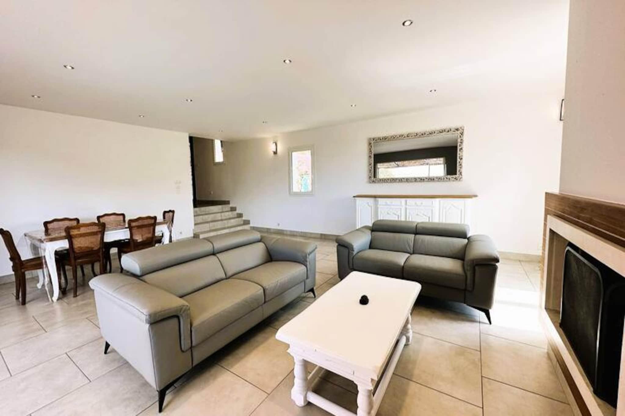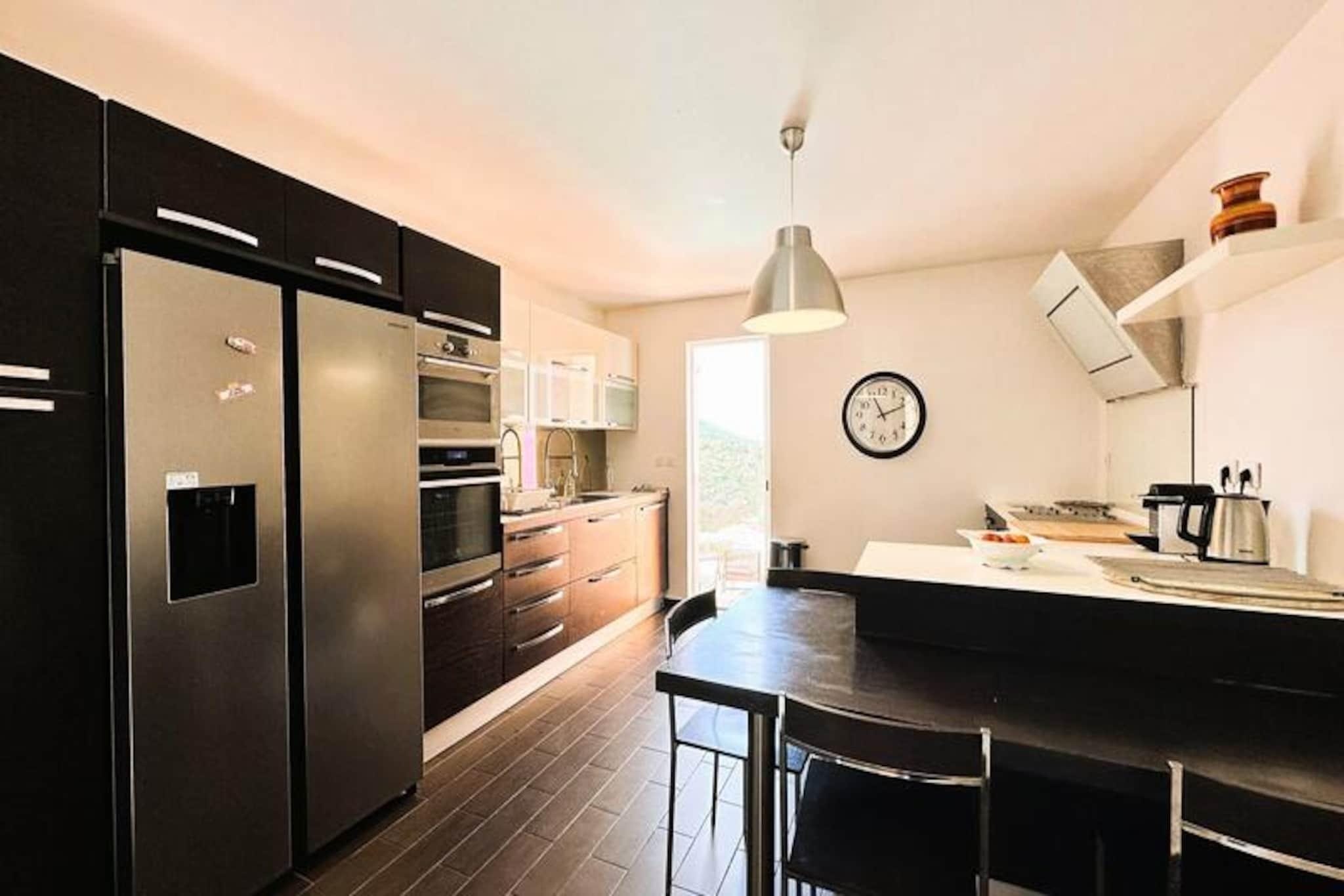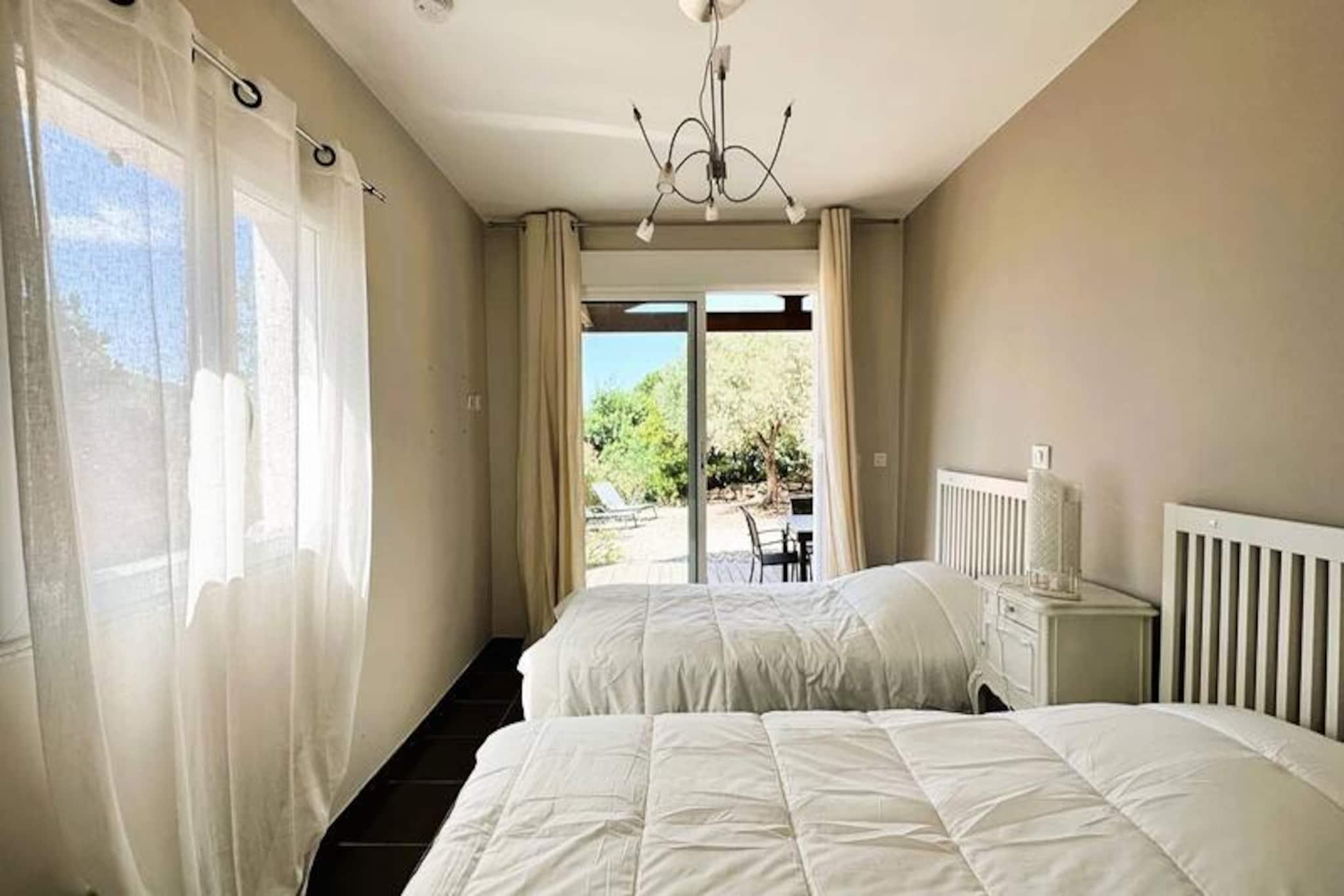 Beliggende i hjertet af Maures-massivet tilbyder denne luksuriøse villa en uforglemmelig flugt omgivet af frodige grønne bakker og en betagende havudsigt. Ejendommen har fuldt aircondition, en rummelig stue med udgang til træterrasser og en indbydende infinity-pool. Plads til op til ti gæster, det inkluderer en master suite med en queensize seng og privat terrasse adgang, to soveværelser ovenpå (en dobbeltseng og en tvilling), der deler et brusebad, og et selvstændigt anneks med to ekstra soveværelser, hver med en en -suite badeværelse. Denne ejendom er ikke-ryger, ikke kæledyrsvenlig og uegnet til små børn eller personer med nedsat mobilitet. Beliggende i det fredfyldte Domaine de Valcros, er denne villa kun en kort køretur fra de uberørte sandstrande i La Londe-les-Maures, med panoramaudsigt over De Gyldne Øer og de omkringliggende vinmarker. Nyd nærheden til en international golfbane, duftende maquis-dækkede bakker og turkisblåt middelhavsvand. I nærheden kan du udforske de charmerende byer Bormes-les-Mimosas og Hyères eller besøge travle markeder, cafeer ved havet og lokale attraktioner. Villaen er designet til ultimativ komfort og byder på et fuldt udstyret køkken med opvaskemaskine, vaskemaskine, tørretumbler og elektrisk Weber-grill. Slap af med Wi-Fi, et tilsluttet tv og rummelige udendørs terrasser perfekt til spisning eller afslapning. Parkering på stedet til to køretøjer er inkluderet sammen med valgfri leje af sengetøj og slutrengøring. Nyd et roligt tilflugtssted i dette fantastiske tilflugtssted på en bjergskråning.