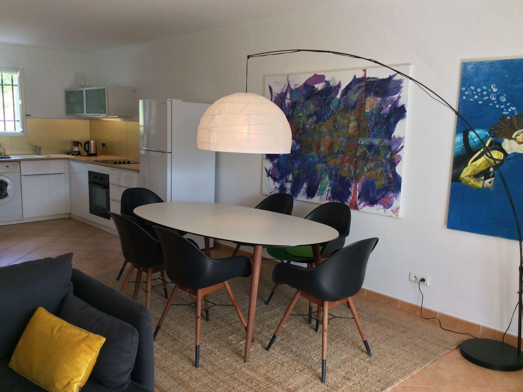 Downstairs - fully equipped open kitchen, dining table, lounge, WC.
