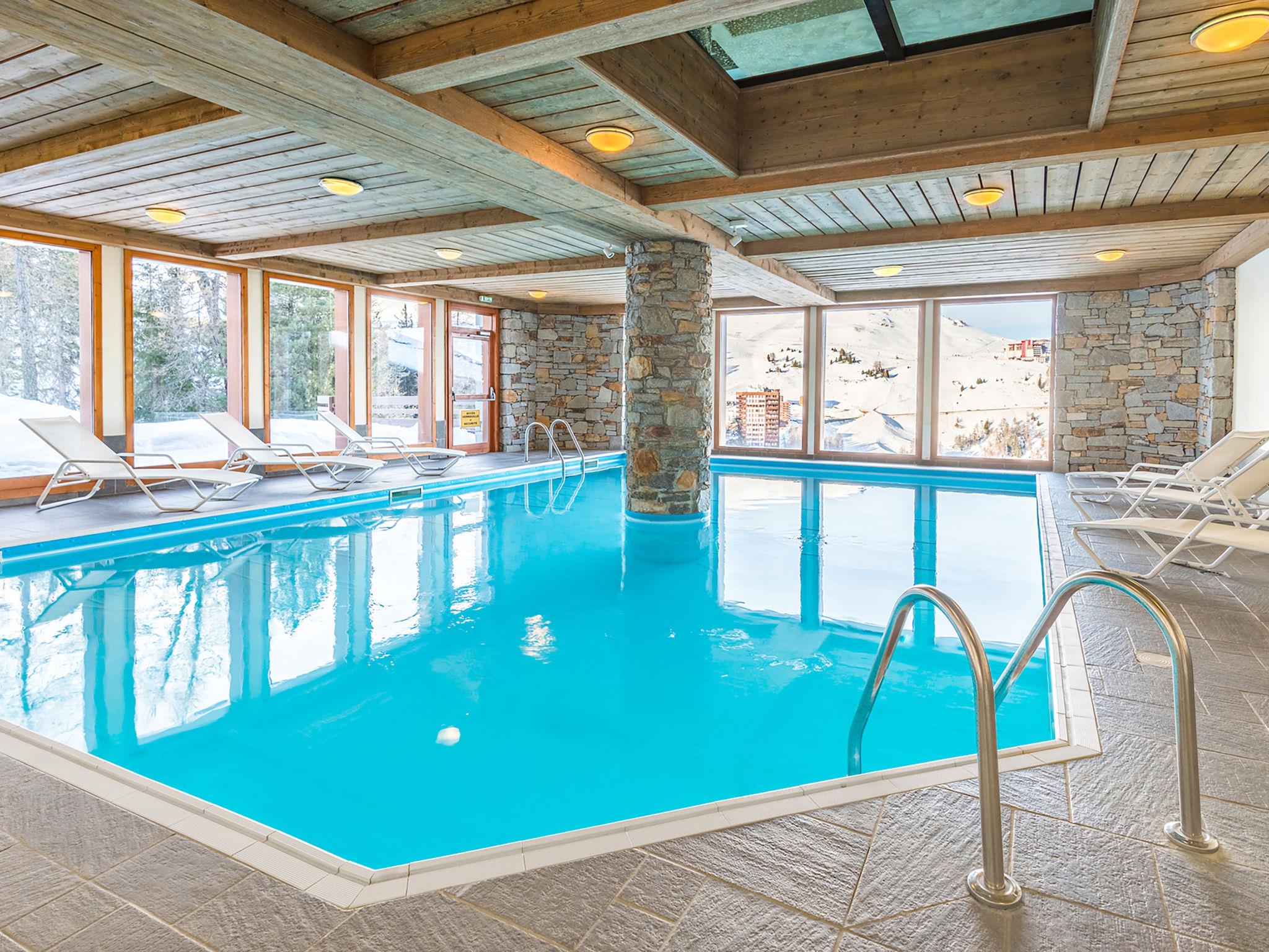 Cosy, comfortable residence "Aspen". 48 apartments in the residence. In the district of Plagne Villages. For shared use: indoor pool heated (9 x 6 m, pool opening hours: 10:00-19:30). Shower/WC in the pool area. In the complex: reception, lounge, WiFi (extra). Sauna (extra). Steam room (extra). Billiard table, lift, storage room for skis, washing machine (extra), tumble dryer (extra). Parking (extra) at 100 m. Parking space or garage only for small to medium-sized cars. Dimension: height 190 cm. Shop, restaurant 300 m, bus stop "Arret Bus Plagne 1800 Bas" 2.7 km. Ski lift 300 m, slopes 100 m. Well-known ski regions can easily be reached: Peisey-Vallandry 30 km, Montchavin 13 km. Please note: reception open 17:00-20:00 hrs. Please note: the photograph shows a typical example. The holiday properties may differ in living space, floorplan, equipment and furnishing.