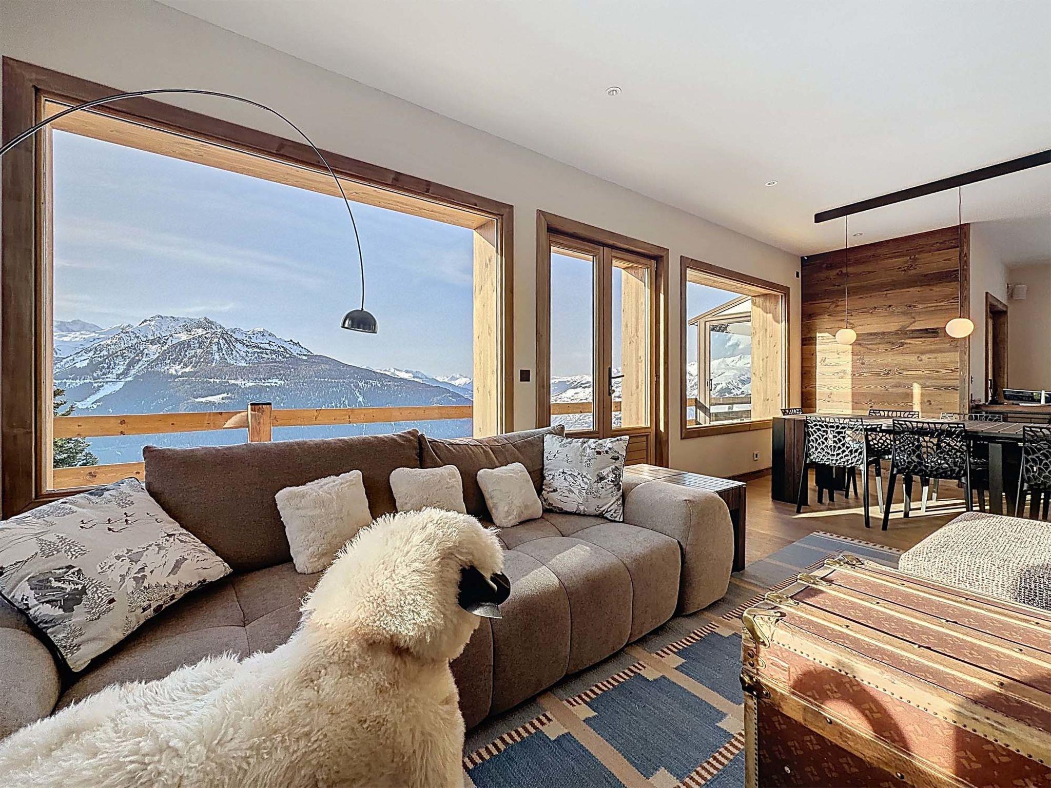 "Chalet Shangri-La", 7-room chalet 200 m2 on 2 levels. Renovated in 2025, comfortable and stylish furnishings: large living/dining room with open-hearth fireplace and dining table. Exit to the balcony. Open kitchen (oven, dishwasher, 4 ceramic glass hob hotplates, toaster, kettle, microwave, freezer, electric coffee machine). Sep. WC. On the lower ground floor: 1 room with 1 double bed (140 cm, length 200 cm), shower, double hand-basin and TV (flat screen). 1 room with 1 x 2 bunk beds, TV (flat screen). 1 room with 1 french bed (160 cm, length 200 cm), shower/WC and TV (flat screen). Bath/WC, sep. WC. Upper floor: 1 room with Dressing room with 1 french bed (160 cm, length 200 cm), bath/shower/WC, double hand-basin and TV (flat screen). 1 room with 1 double sofabed and TV (flat screen). Exit to the balcony. 1 room with Dressing room with 1 french bed (180 cm, length 200 cm), shower/WC and TV (flat screen). Shower/WC. Electric heating. Balcony. Beautiful view of the mountains. Facilities: washing machine, dryer, iron, baby cot, hair dryer, logs (free). Internet (WiFi, free). Garage. Please note: smoke alarm.