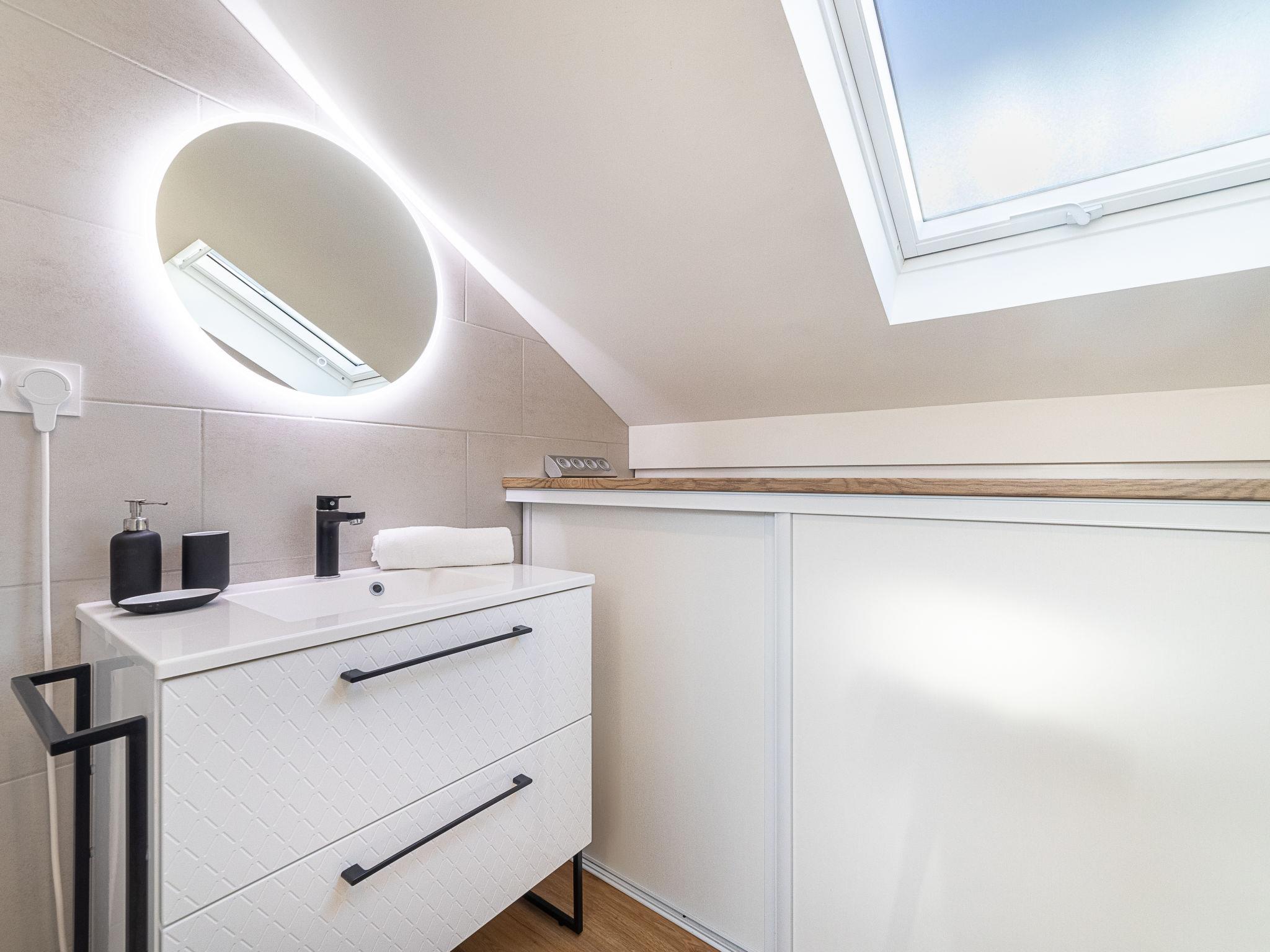 3-room terraced house 55 m2. With sloping ceilings, comfortable furnishings: living/dining room with panoramic window with 1 sofabed (140 cm, length 190 cm). 1 small room 8 m2 with Dressing room with 1 double bed (140 cm, length 190 cm). Kitchenette (4 hot plates, oven, dishwasher, toaster, kettle, microwave, electric coffee machine, Capsules for coffee machine (NESPRESSO) extra) with dining table. Shower/WC. Electric heating, air-conditioning. Upper floor: (steep stair) with sloping ceilings, 1 room 11 m2, ceiling height 130 - 210 cm with rooflight with 1 french bed (160 cm, length 190 cm). Sep. WC. Terrace 30 m2, south facing position and west facing position. Barbecue. Facilities: washing machine, dryer. Internet (WiFi, free). Please note: smoke alarm. Offer by a private individual according to Art. 155, IV of CGI.