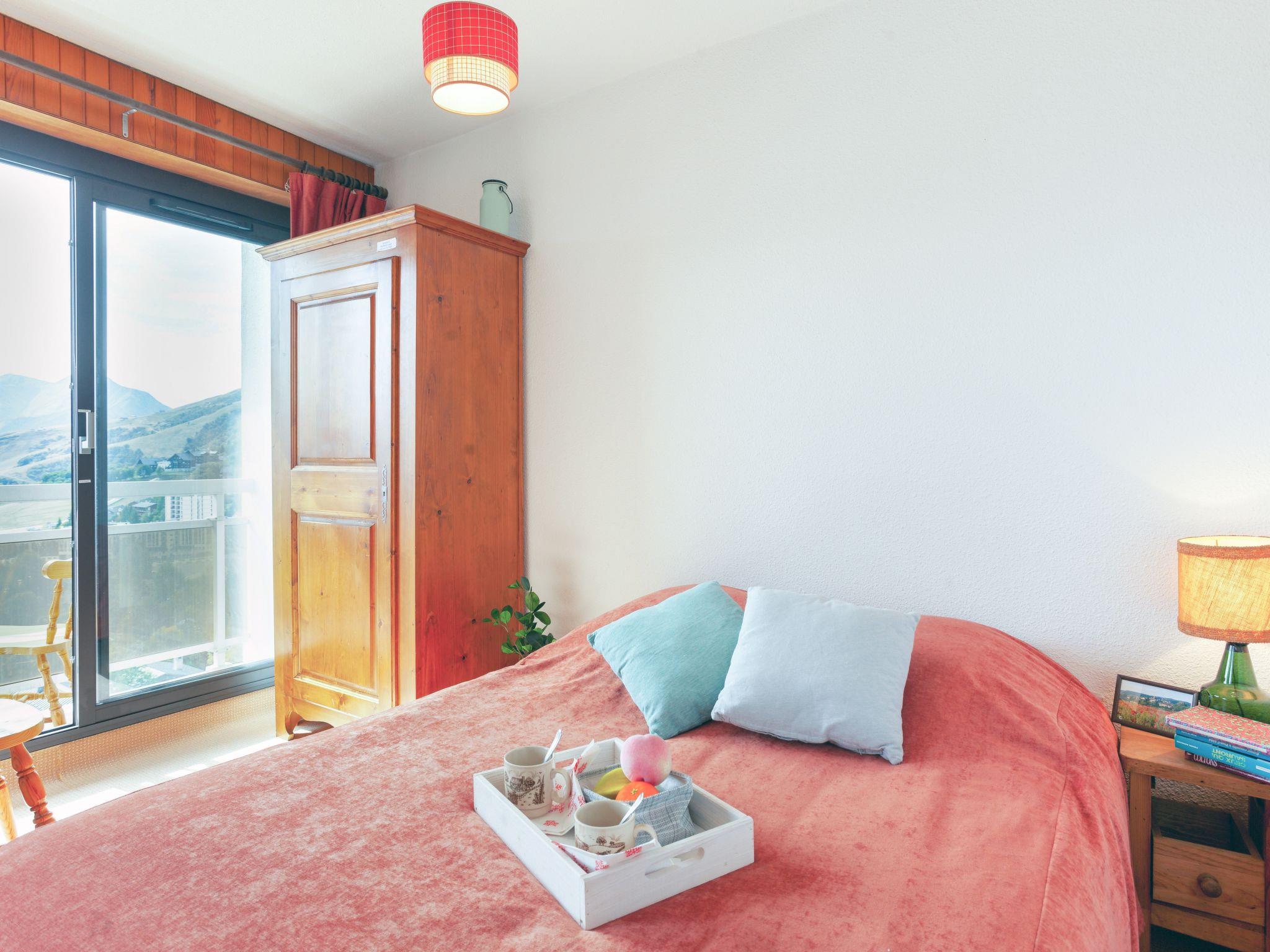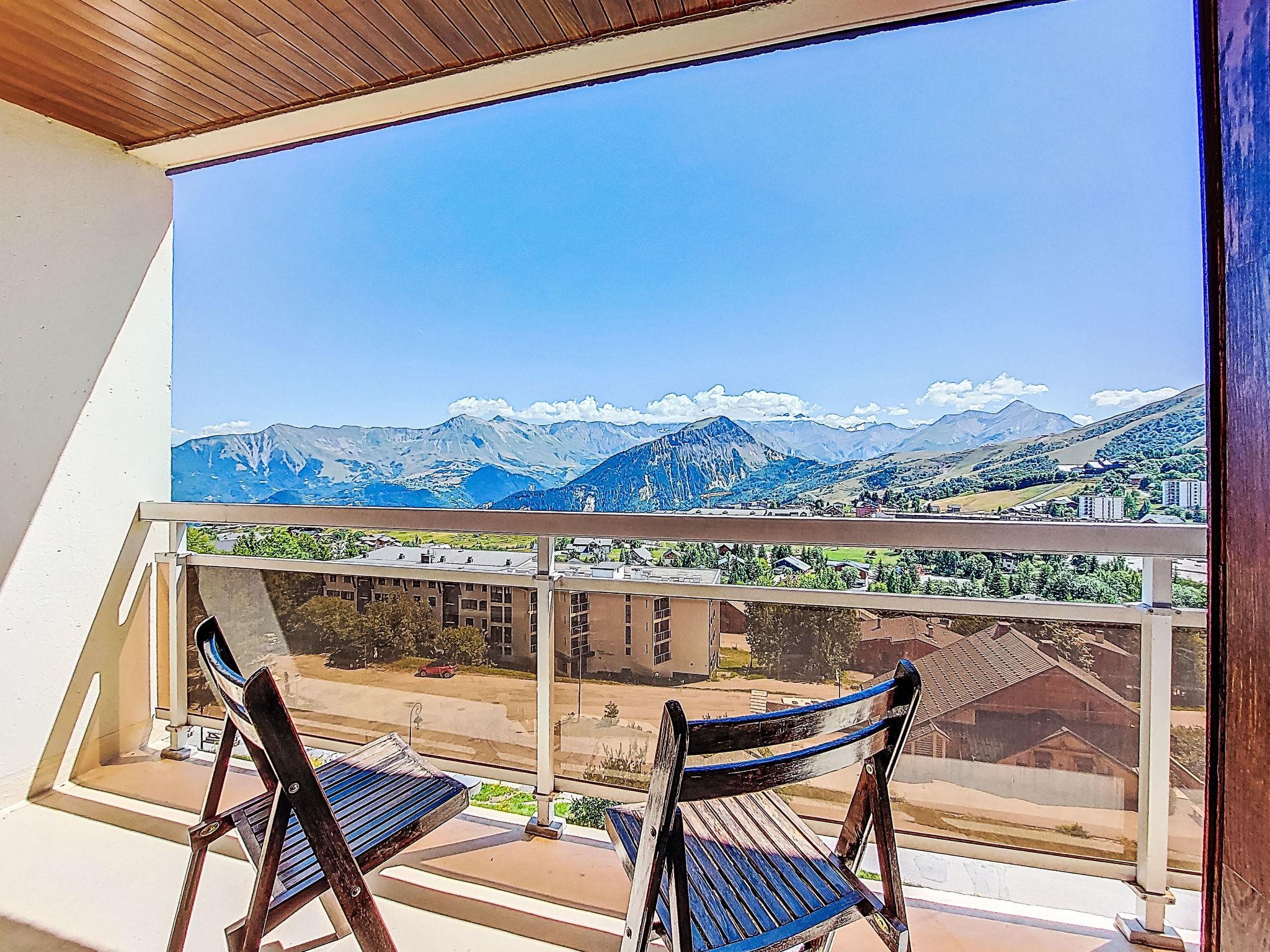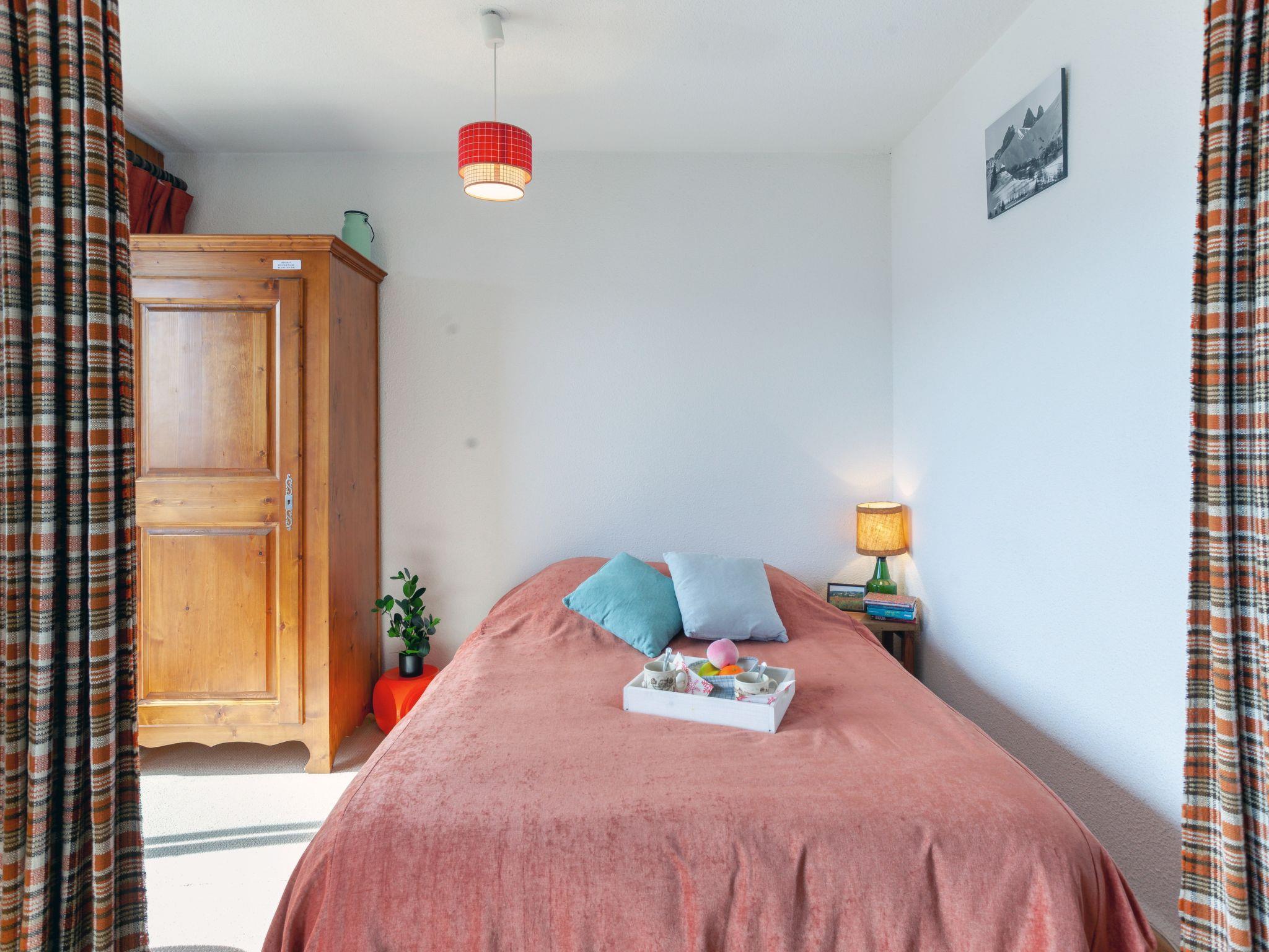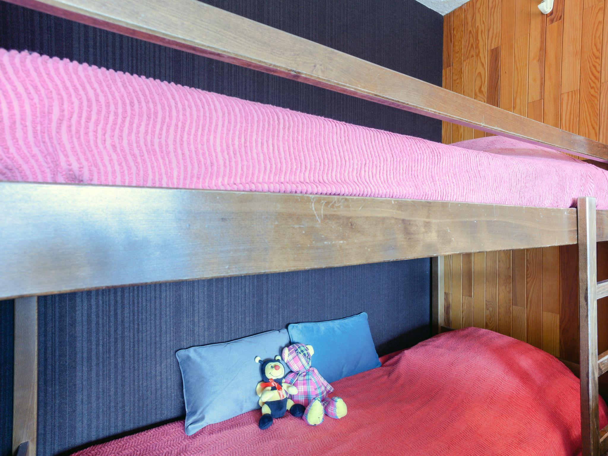 1-room apartment 32 m2 on 3rd floor, south facing position. Simple furnishings: living/dining room with curtain with 1 x 2 bunk beds (80 cm, length 190 cm), TV and DVD. Exit to the balcony, south facing position. Alcove with curtain with 1 french bed (140 cm, length 200 cm), electric shutters. Exit to the balcony, south facing position. Small kitchen (dishwasher, 2 induction hot plates, toaster, kettle, microwave, electric coffee machine, fondue Set (cheese)). Bathroom, sep. WC. Heating. Carpet. Large balcony 6 m2, south facing position. Beautiful view of the mountains and the resort. Facilities: hair dryer. Internet (WiFi, extra). Please note: non-smokers only. Smoke alarm. Instead of an enclosed bedroom, some sleeping areas are located in an open-plan area (gallery, alcove, etc.). Offer by a private individual according to Art. 155, IV of CGI.