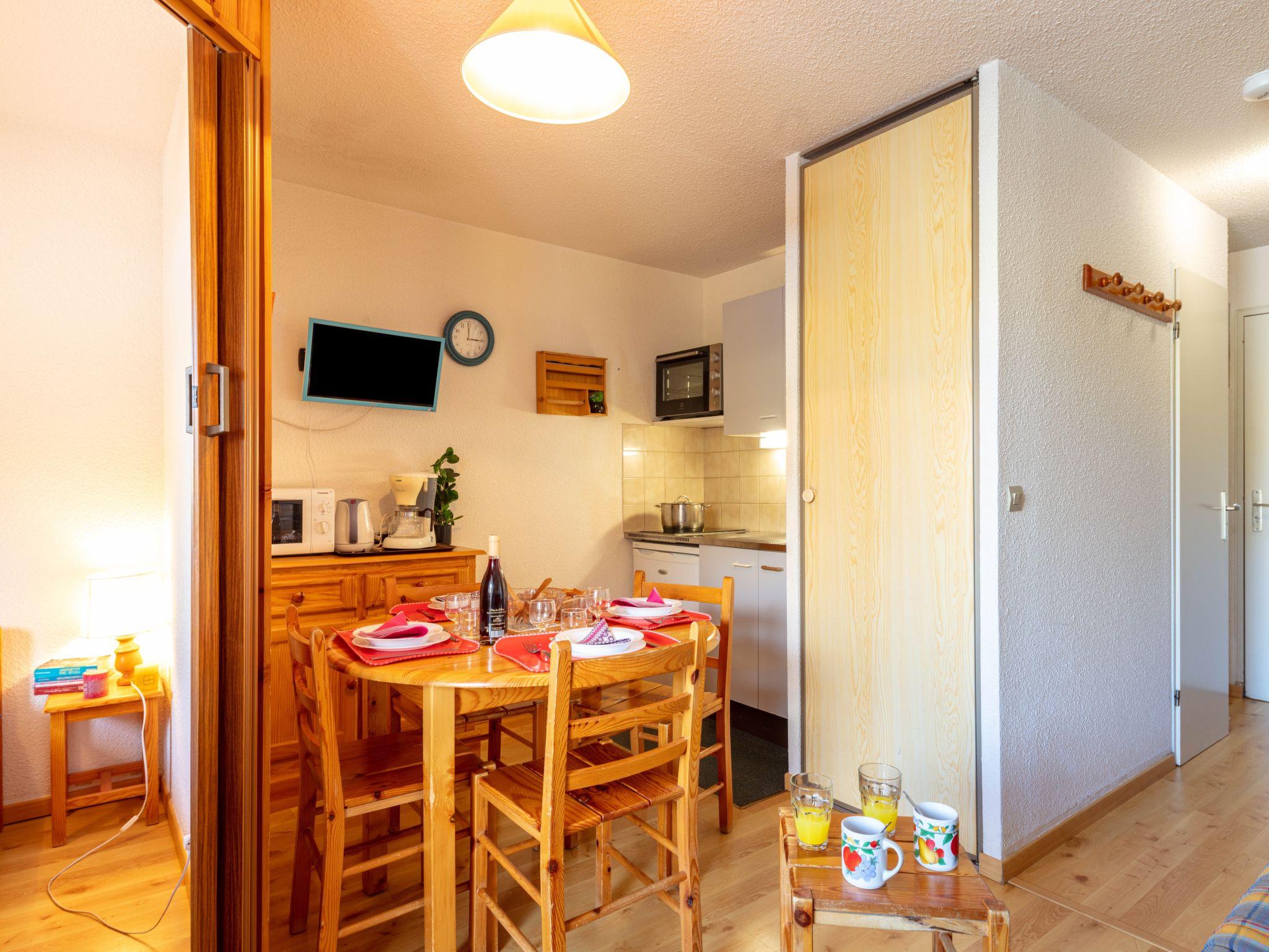 2-room apartment 25 m2 on 1st floor. Simple and practical furnishings: living/dining room with TV (flat screen). Exit to the balcony, north facing position. Entrance hall with 1 x 2 bunk beds (70 cm, length 190 cm). 1 room with sliding door with 1 french bed (140 cm, length 190 cm). Kitchenette (oven, 2 ceramic glass hob hotplates, kettle, microwave, electric coffee machine). Bathroom, sep. WC. Electric heating, boiler. Parquet floors. Balcony 3 m2, north facing position. Partial view of the mountains. Facilities: hair dryer. Internet (WiFi, extra). Please note: apartment carpark side. Non-smokers only. Maximum 1 pet/ dog allowed. Smoke alarm, no lift. Apartment in the building B. NOTE: for the Toussuire apartments, the key collection will take place in the Interhome office at Corbier, 4 km away. For the guests arriving by bus, please contact us 48 hrs in advance to arrange key collection. ADDITIONAL SERVICE FEE POSSIBLE 30 €. Instead of an enclosed bedroom, some sleeping areas are located in an open-plan area (gallery, alcove, etc.). Offer by a private individual according to Art. 155, IV of CGI. 6820A