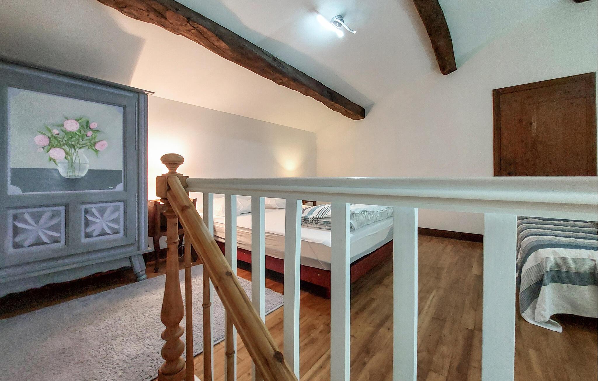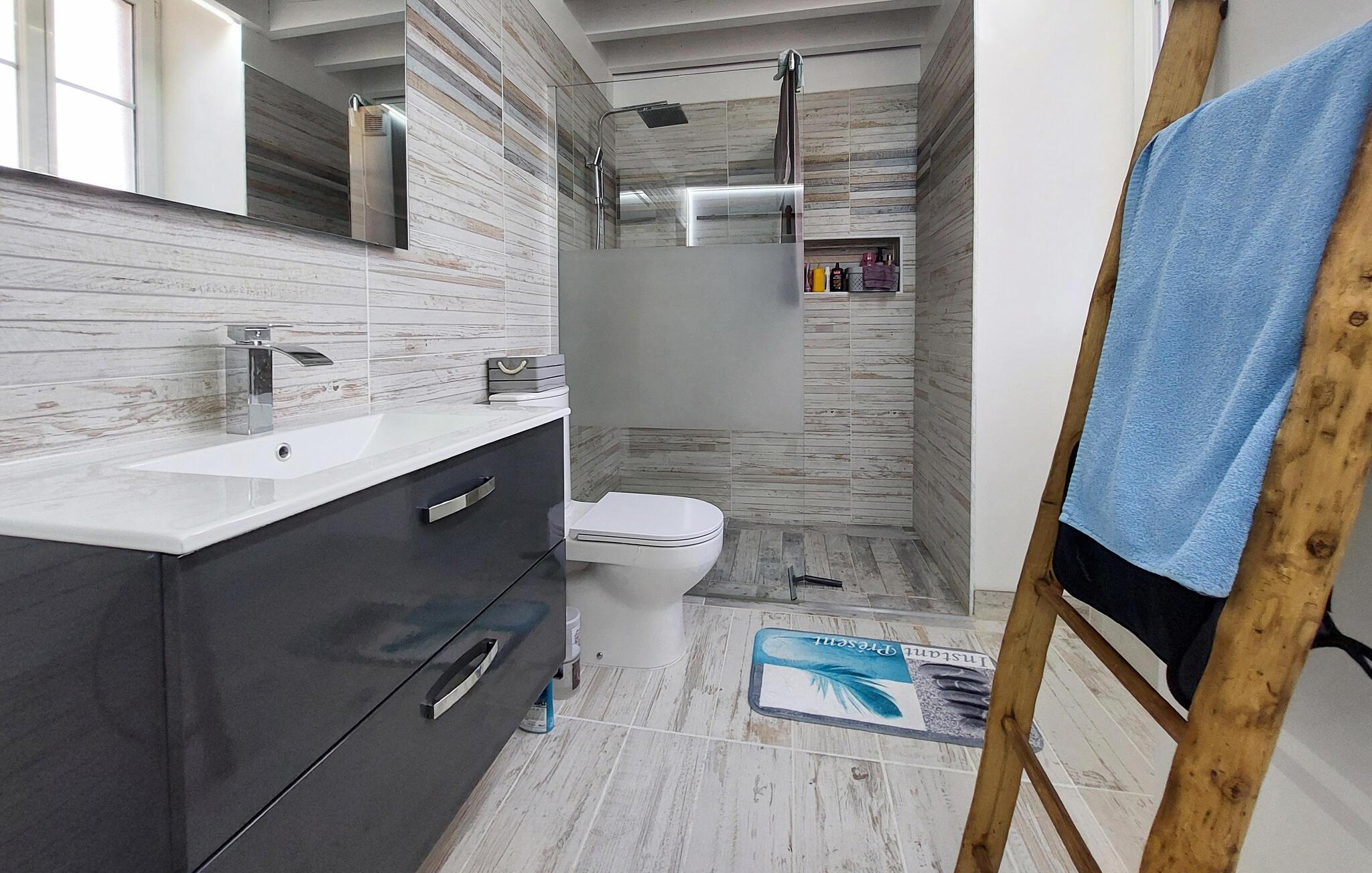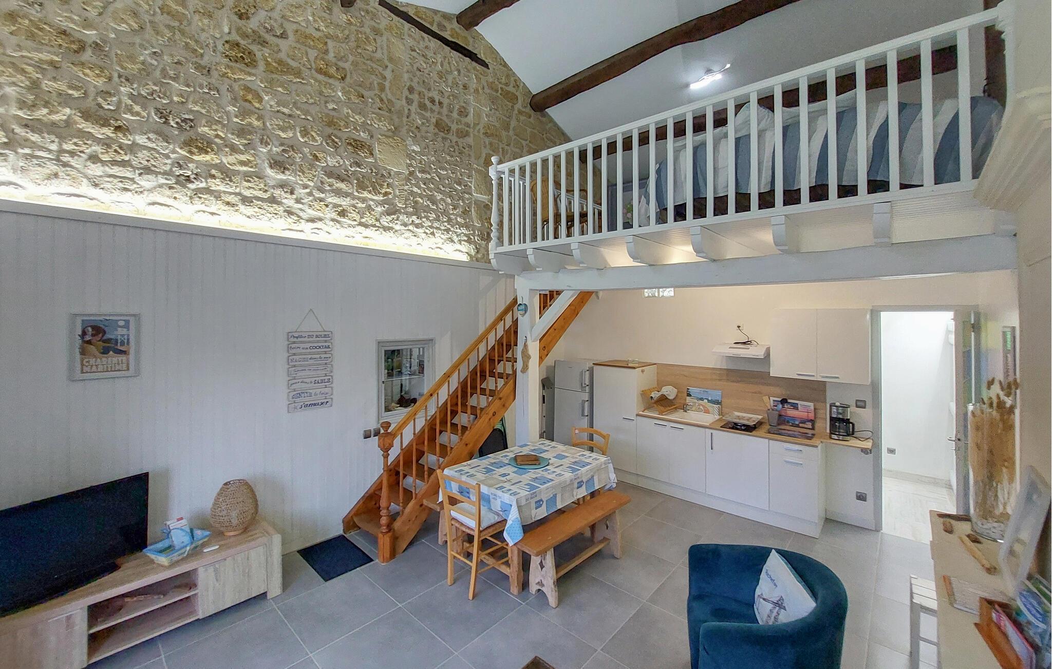 Gør det behageligt i den smukt designede stue med højt til loftet, naturstensvægge og et hyggeligt siddeområde samt adskillige smagfulde detaljer. Det åbne køkken er praktisk udstyret og giver mulighed for at lave mad sammen. Brug spisebordet til jeres feriemåltider og tilbring afslappende timer foran fjernsynet.