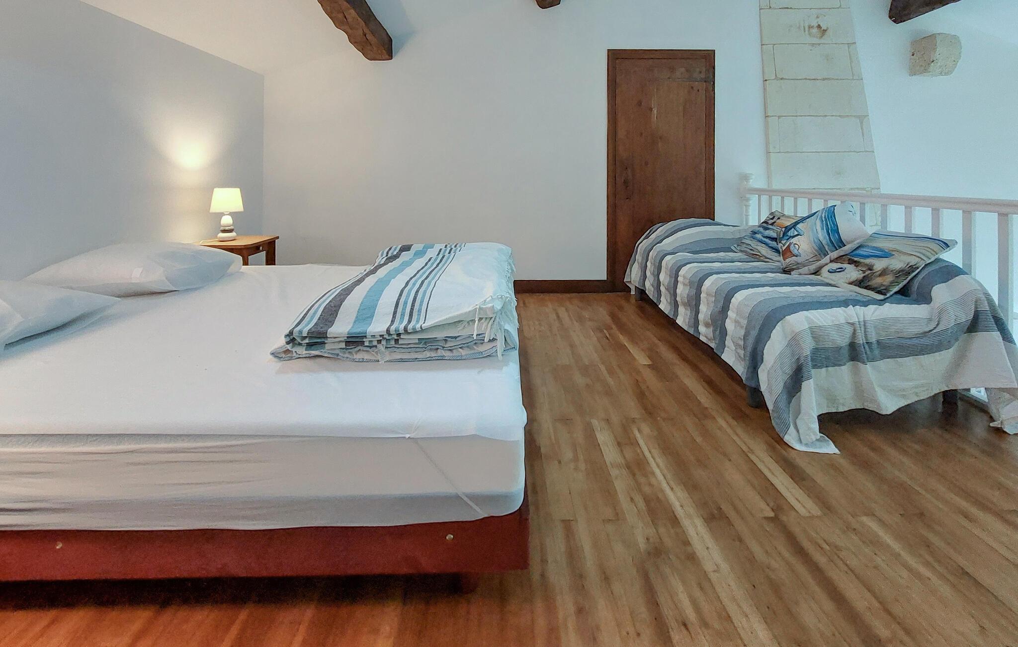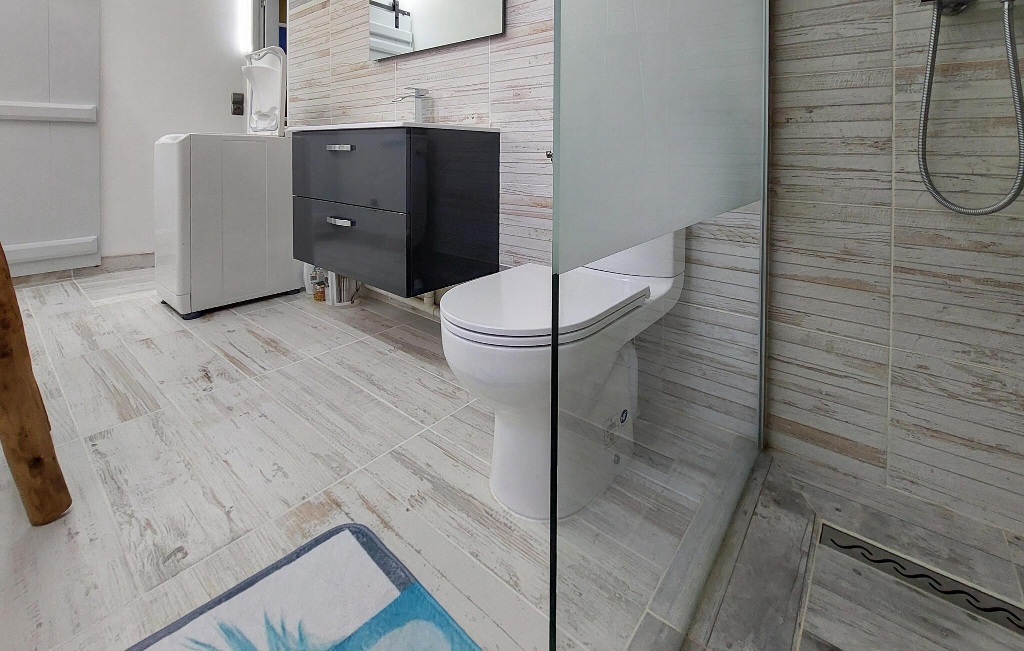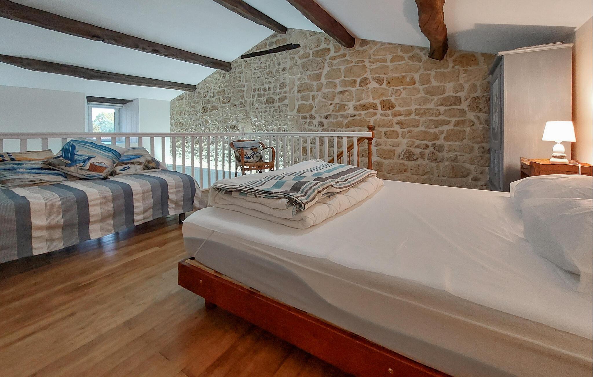 Gør det behageligt i den smukt designede stue med højt til loftet, naturstensvægge og et hyggeligt siddeområde samt adskillige smagfulde detaljer. Det åbne køkken er praktisk udstyret og giver mulighed for at lave mad sammen. Brug spisebordet til jeres feriemåltider og tilbring afslappende timer foran fjernsynet.