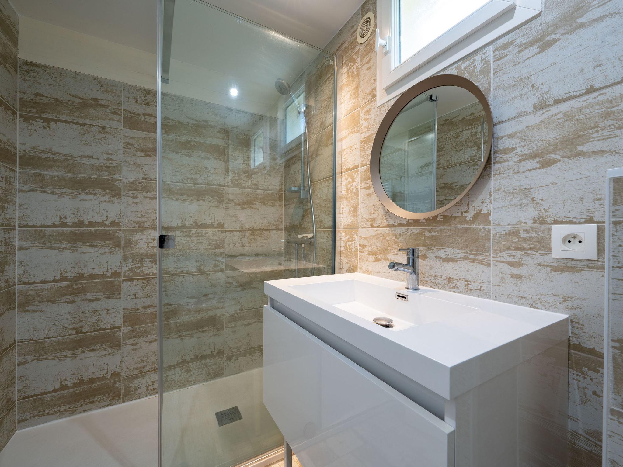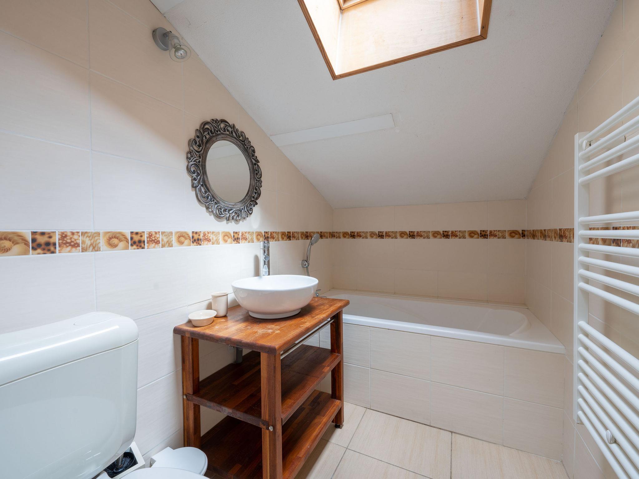 4-room terraced house 70 m2 on 2 levels. Comfortable furnishings: living/dining room with open-hearth fireplace and flat screen. 1 room with 1 french bed. Large kitchenette (4 hot plates, oven, dishwasher, 4 ceramic glass hob hotplates, electric coffee machine). Shower/WC. Upper floor: 1 room with 1 pull-out bed (2 pers.). 1 room with 1 french bed. Bath/WC. Electric heating, air-conditioning. Terrace, west facing position, patio. Terrace furniture, deck chairs. Facilities: washing machine, iron. Internet (WiFi, free). Parking space n 18 (2 cars). Please note: non-smokers only. Maximum 1 pet/ dog allowed. Smoke alarm.