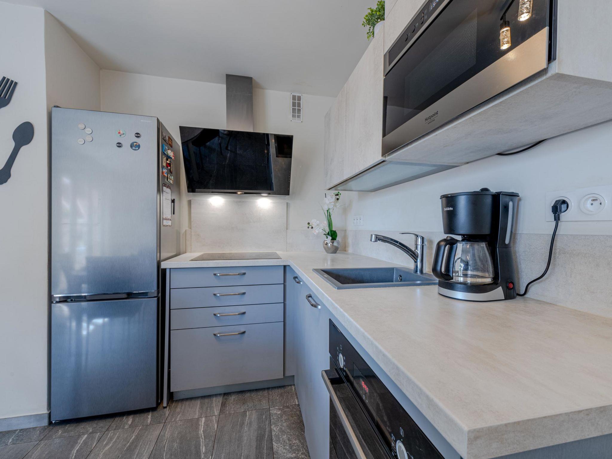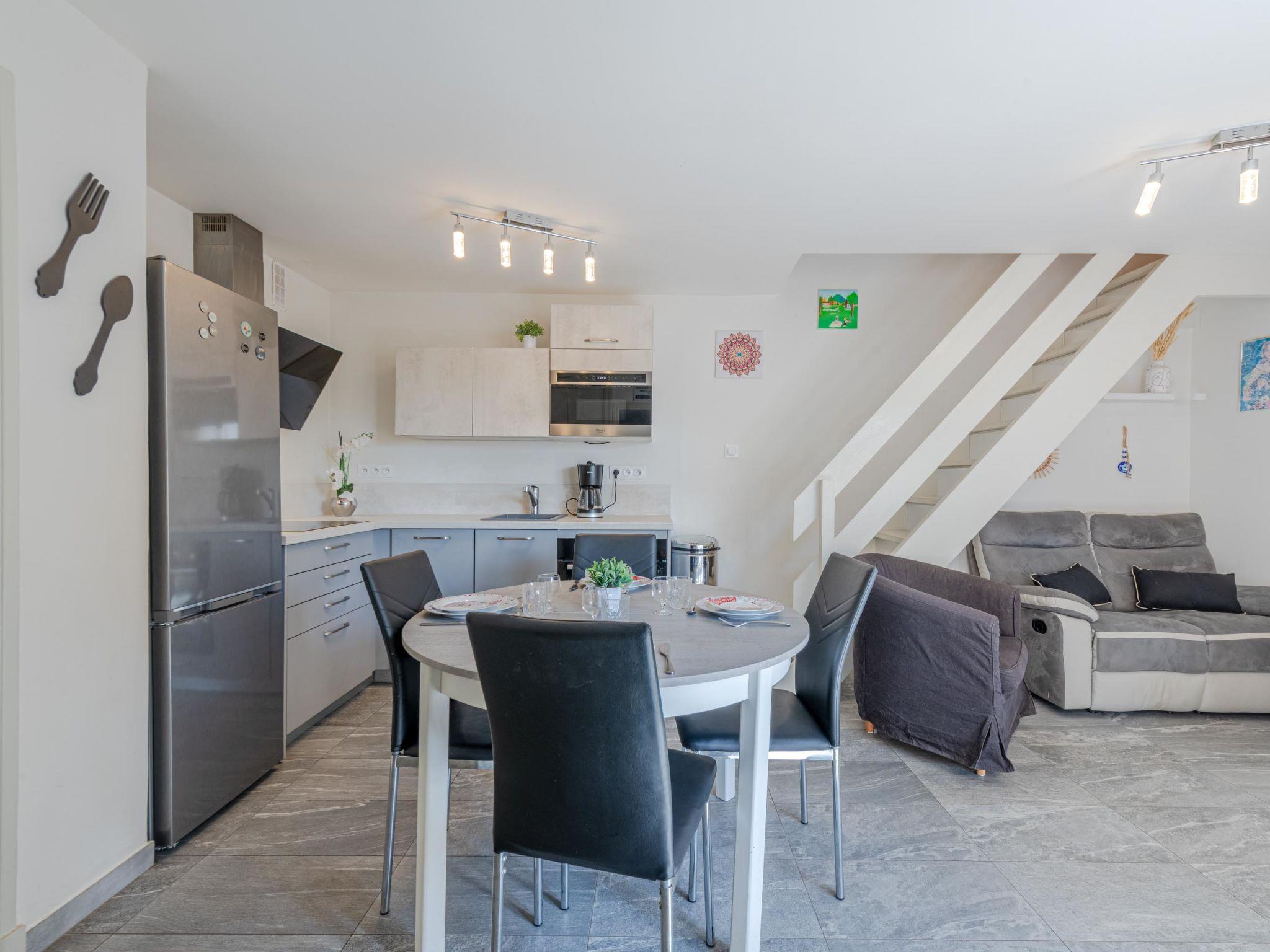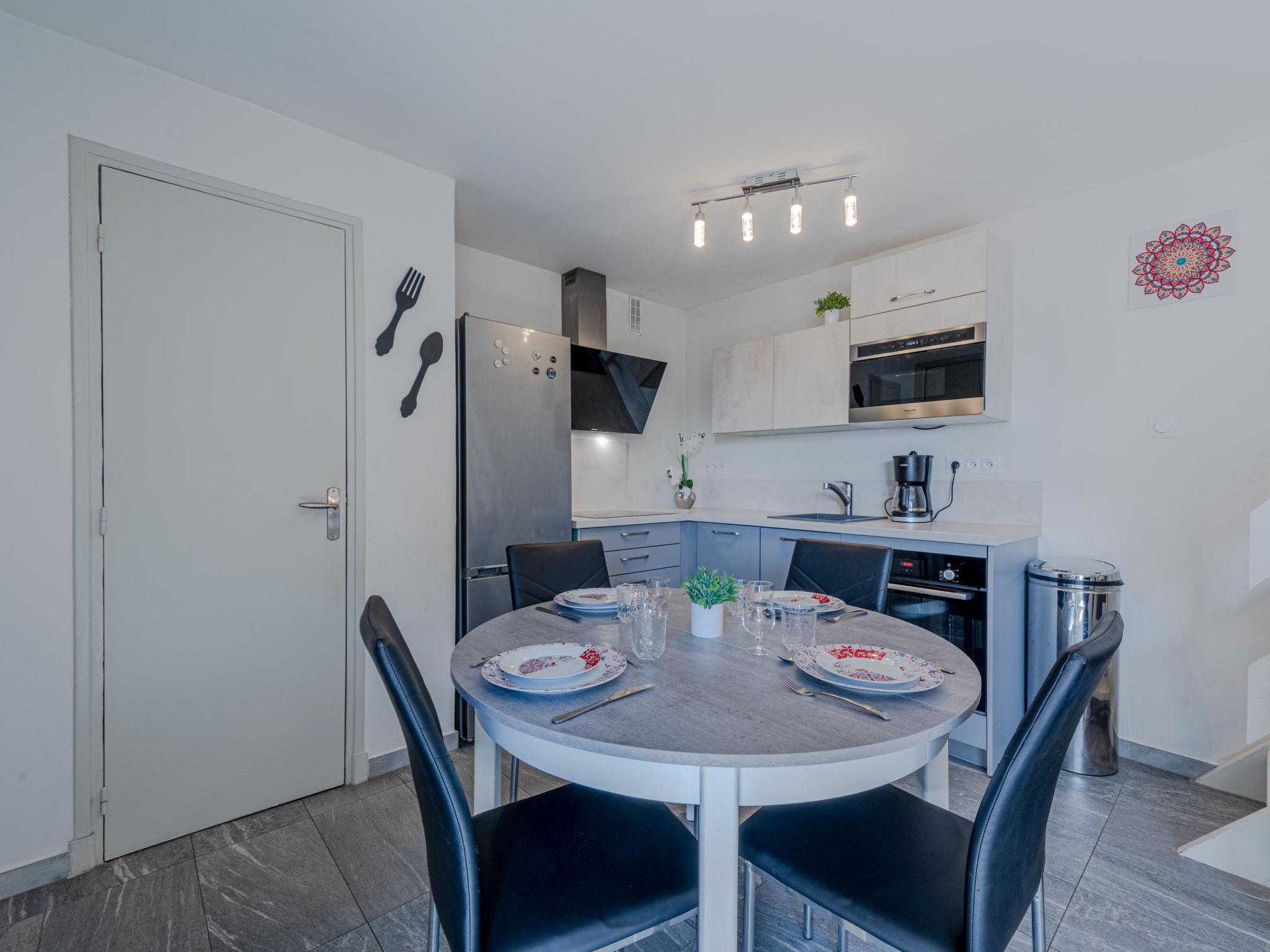 3-room apartment 40 m2 on 2 levels, on the ground floor. Beautiful furnishings: living/dining room with TV (flat screen). Exit to the terrace. 1 room with 1 french bed (1 x 160 cm, length 200 cm). Open kitchen (oven, dishwasher, 3 induction hot plates, toaster, kettle, microwave, electric coffee machine). Shower, sep. WC. Air-conditioning. Upper floor: 1 room with 1 double sofabed (1 x 140 cm, length 190 cm). Terrace 15 m2. Terrace furniture. Facilities: washing machine. Internet (WiFi, free). Parking. Please note: 1 small pet/ dog allowed. Smoke alarm. Offer by a private individual according to Art. 155, IV of CGI. FR6640.270.5