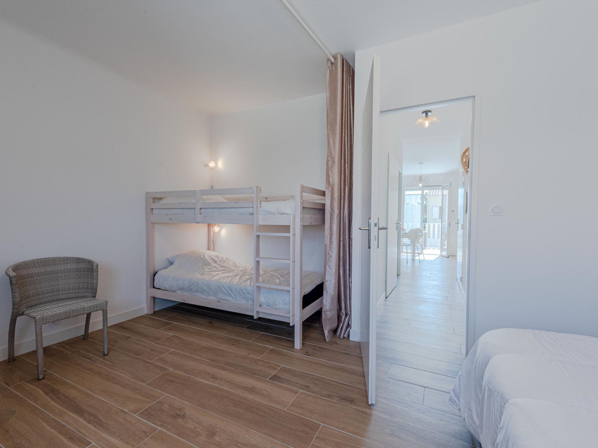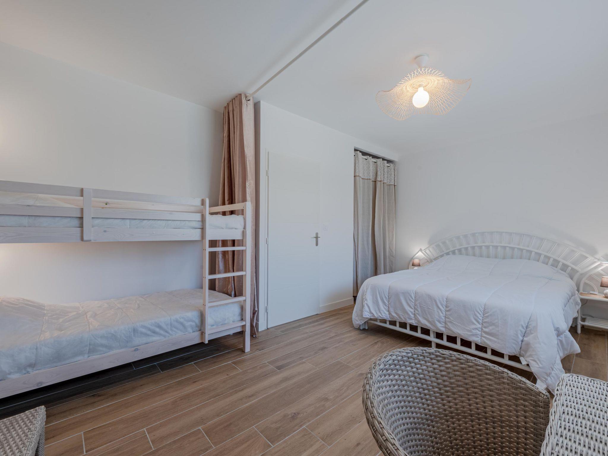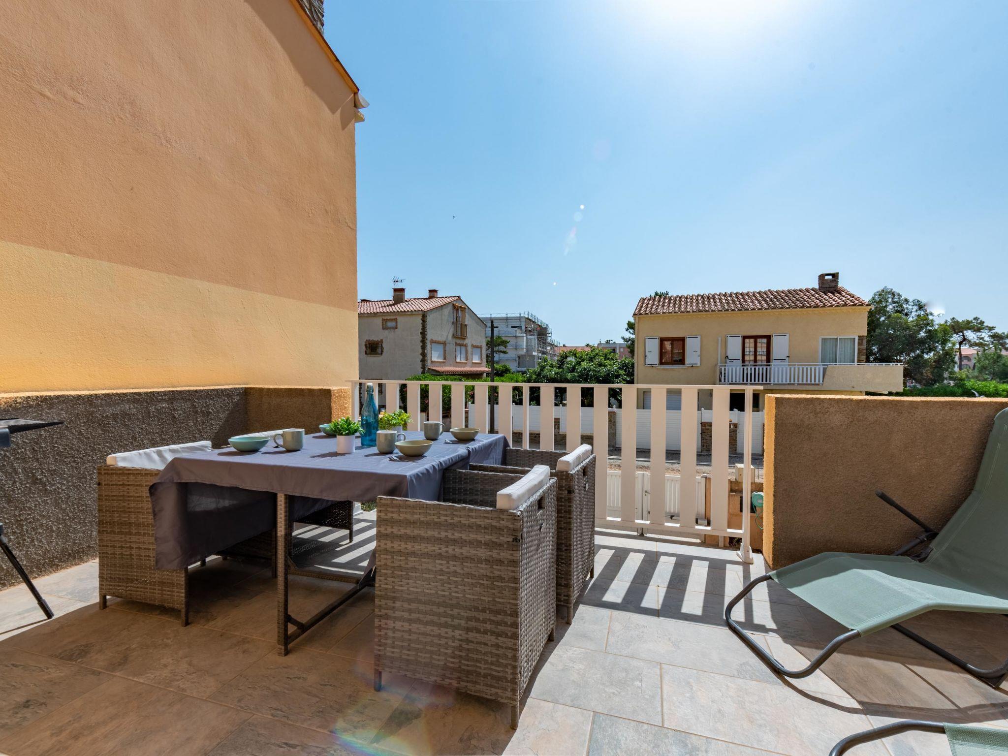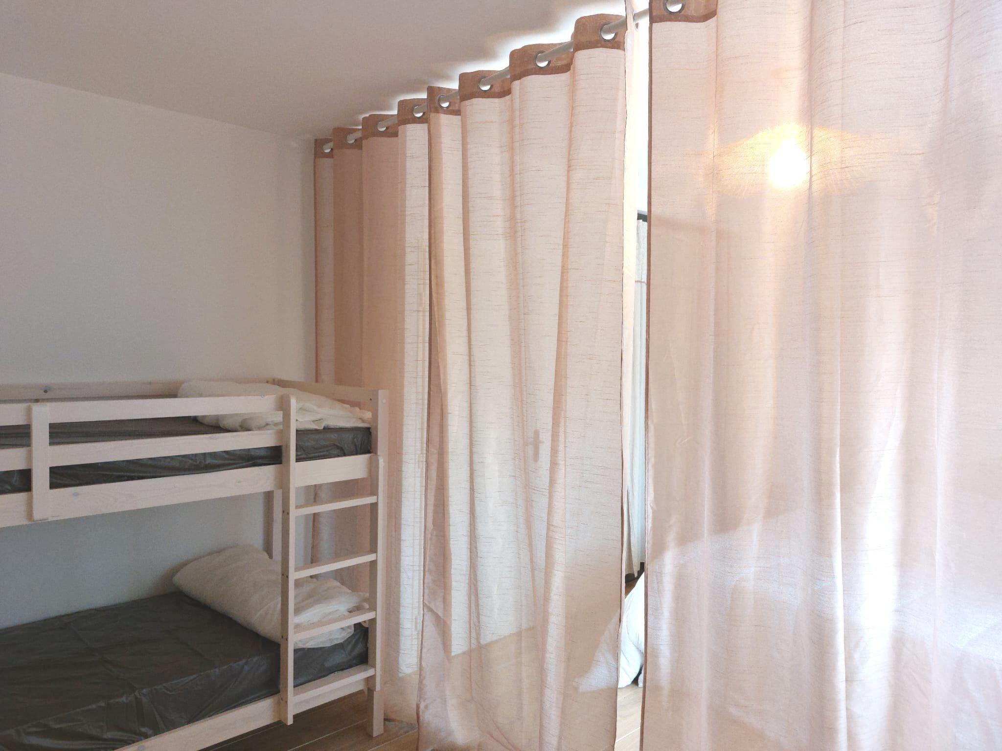 "La Terrasse", 2-room apartment 50 m2 on 1st floor, east facing position. Living/dining room with TV (flat screen). Exit to the terrace. 1 room with 1 x 2 bunk beds (90 cm, length 190 cm), 1 french bed (1 x 160 cm, length 200 cm). Open kitchen (oven, dishwasher, 3 ceramic glass hob hotplates, toaster, kettle, microwave, electric coffee machine). Exit to the terrace. Shower, sep. WC. Air-conditioning. Terrace 15 m2, east facing position. Terrace furniture. Facilities: washing machine. Internet (WiFi, free). Please note: smoke alarm. Offer by a private individual according to Art. 155, IV of CGI.