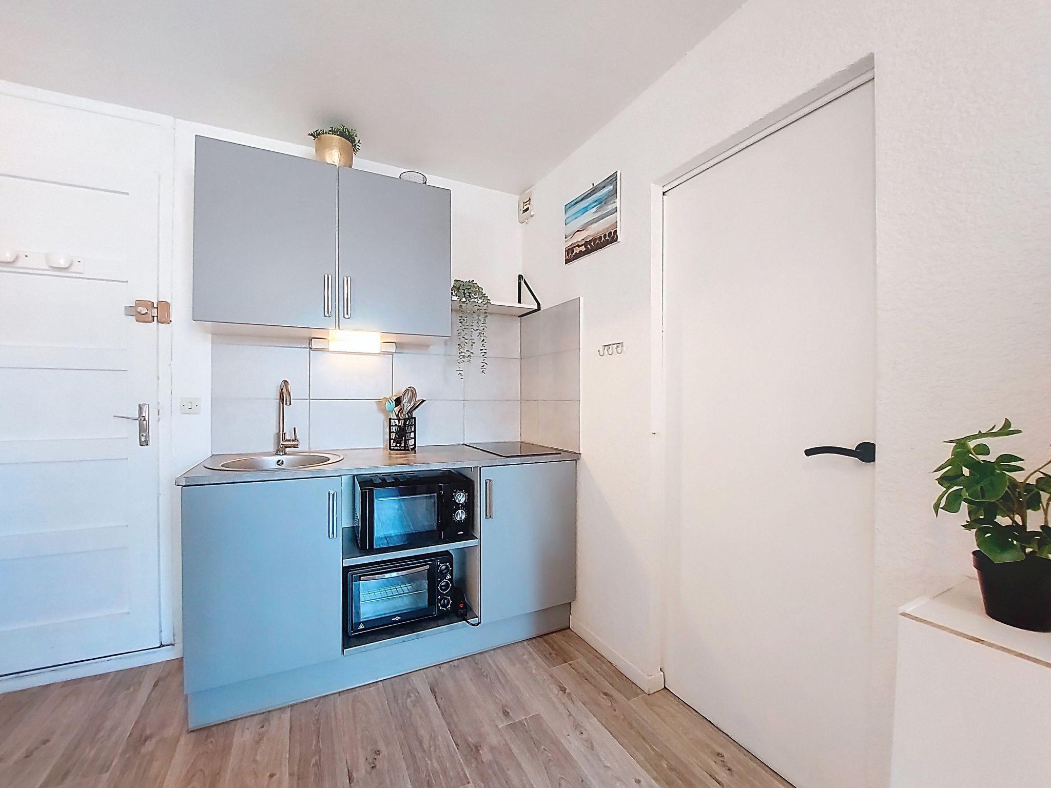 2-room apartment 27 m2 on 1st floor. Dining room with 1 sofabed (140 cm, length 190 cm), TV (flat screen). Exit to the terrace. 1 room with 1 french bed (1 x 140 cm, length 190 cm). Kitchenette (mini-oven, 2 ceramic glass hob hotplates, toaster, kettle, microwave, electric coffee machine). Shower/WC. Air-conditioning. Terrace 5 m2. Terrace furniture. Side view of the sea. Facilities: Internet (WiFi, extra). Parking. Please note: smoke alarm. Offer by a private individual according to Art. 155, IV of CGI.