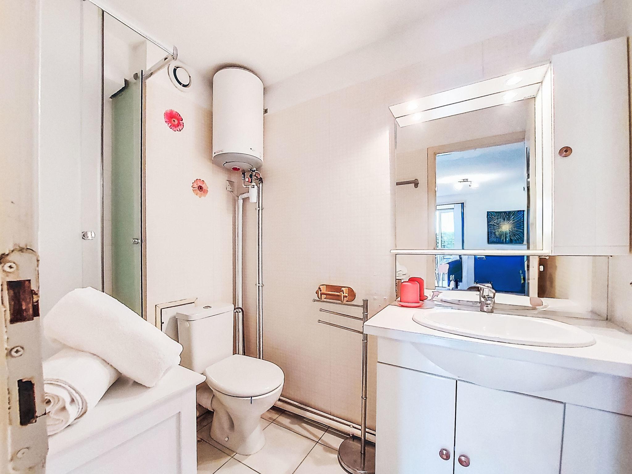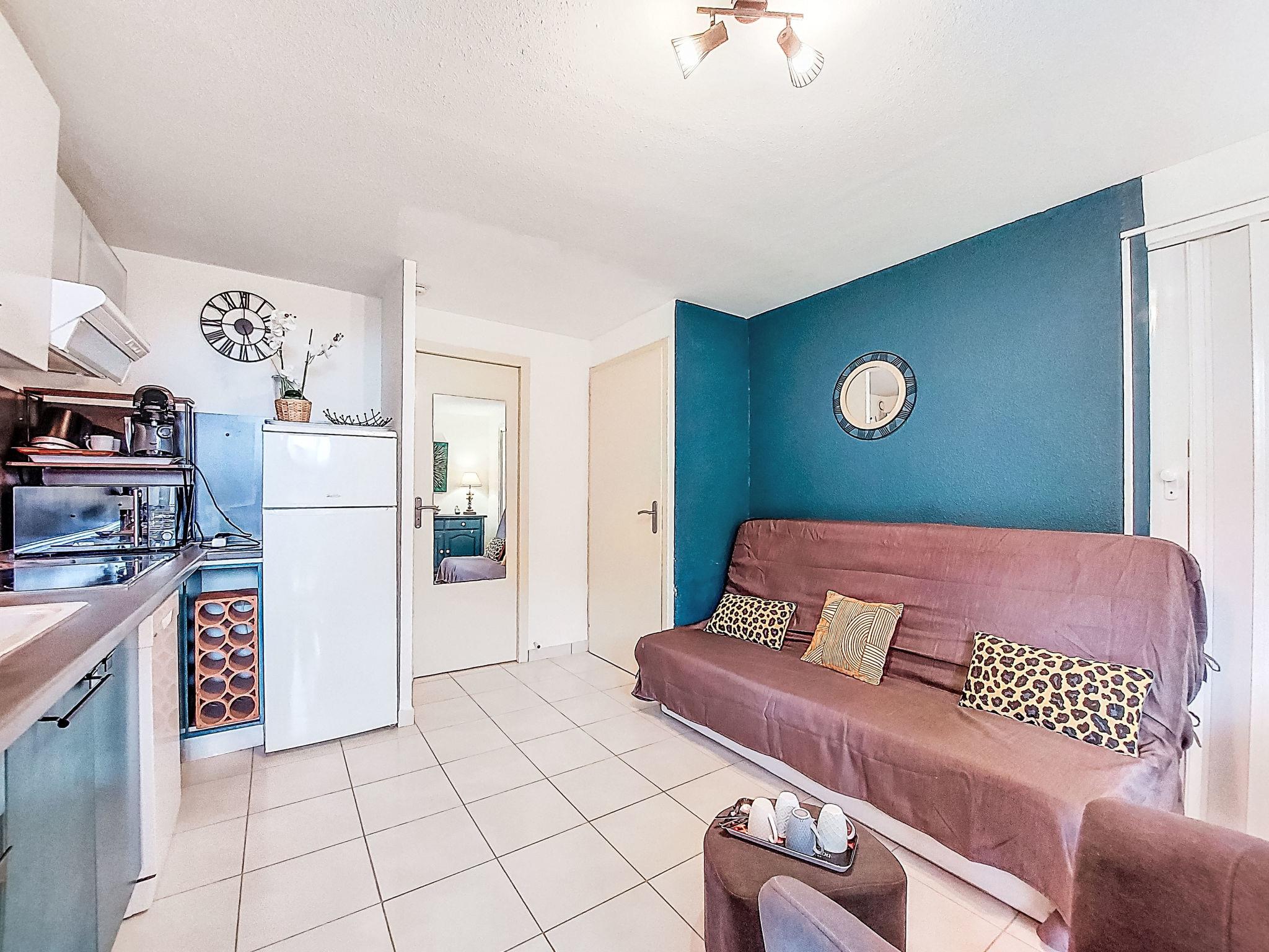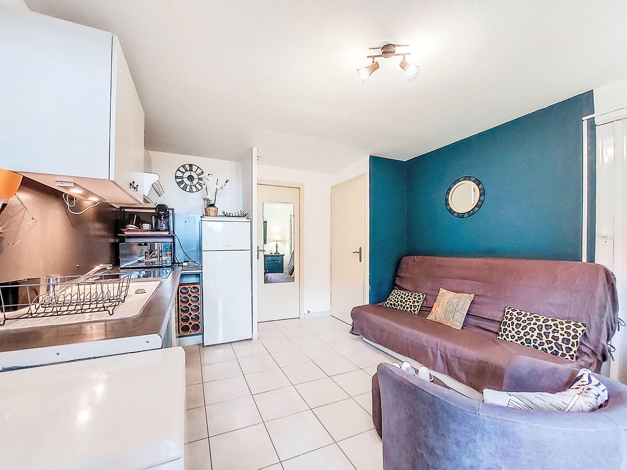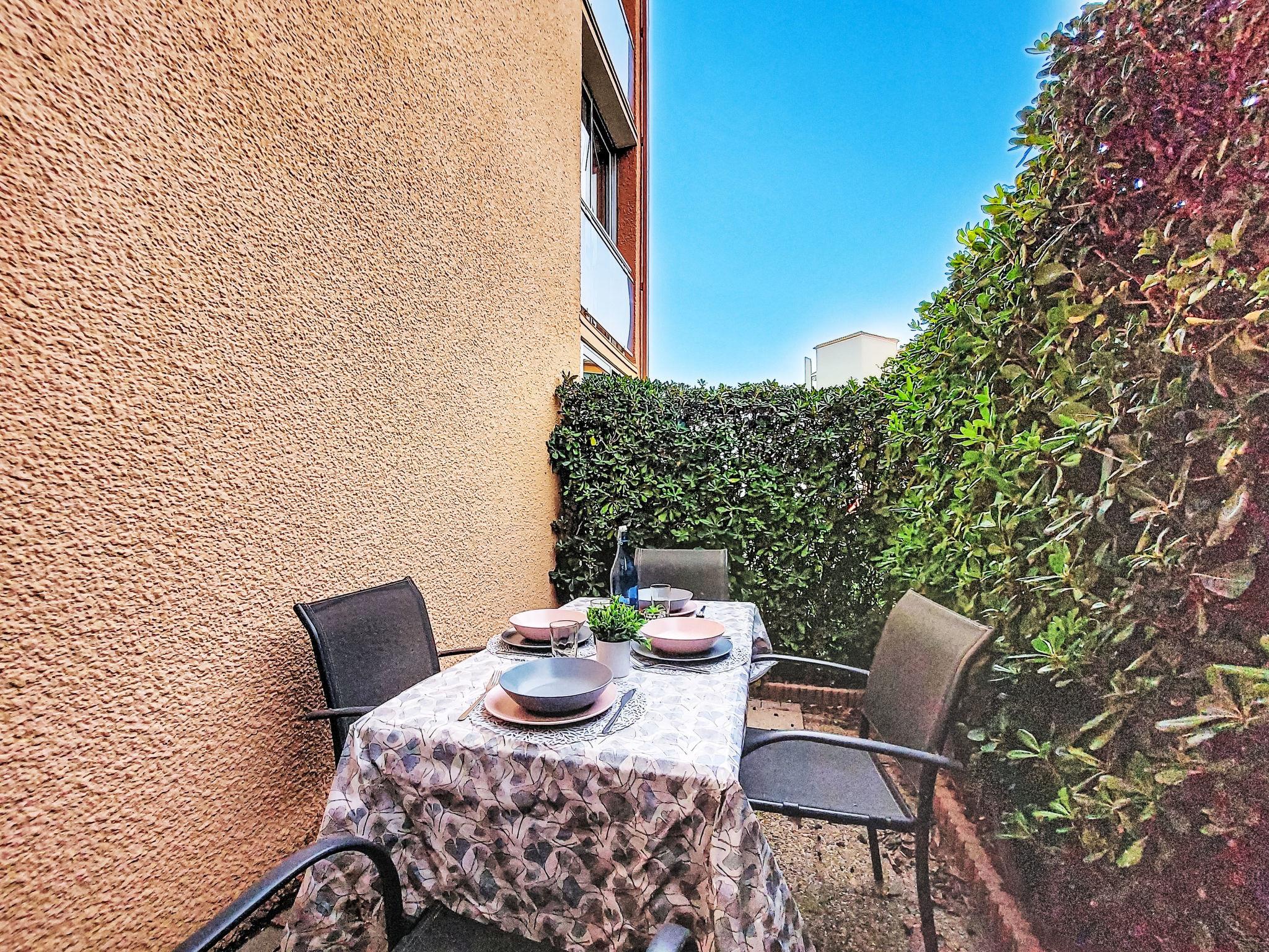 "Cap de mer", 2-room apartment 28 m2, on the ground floor, south-east facing position. Living/dining room with TV (flat screen). Exit to the terrace, to the loggia. 1 room with 1 french bed (1 x 140 cm, length 190 cm). Sleeping alcove with 1 x 2 bunk beds (90 cm, length 190 cm). Kitchenette (dishwasher, 4 ceramic glass hob hotplates, toaster, kettle, electric coffee machine, combination microwave). Shower/WC. Terrace 9 m2. Terrace furniture, covered balcony. Facilities: washing machine. Internet (WiFi, extra). Parking. Please note: maximum 1 pet/ dog allowed. Smoke alarm. Offer by a private individual according to Art. 155, IV of CGI.