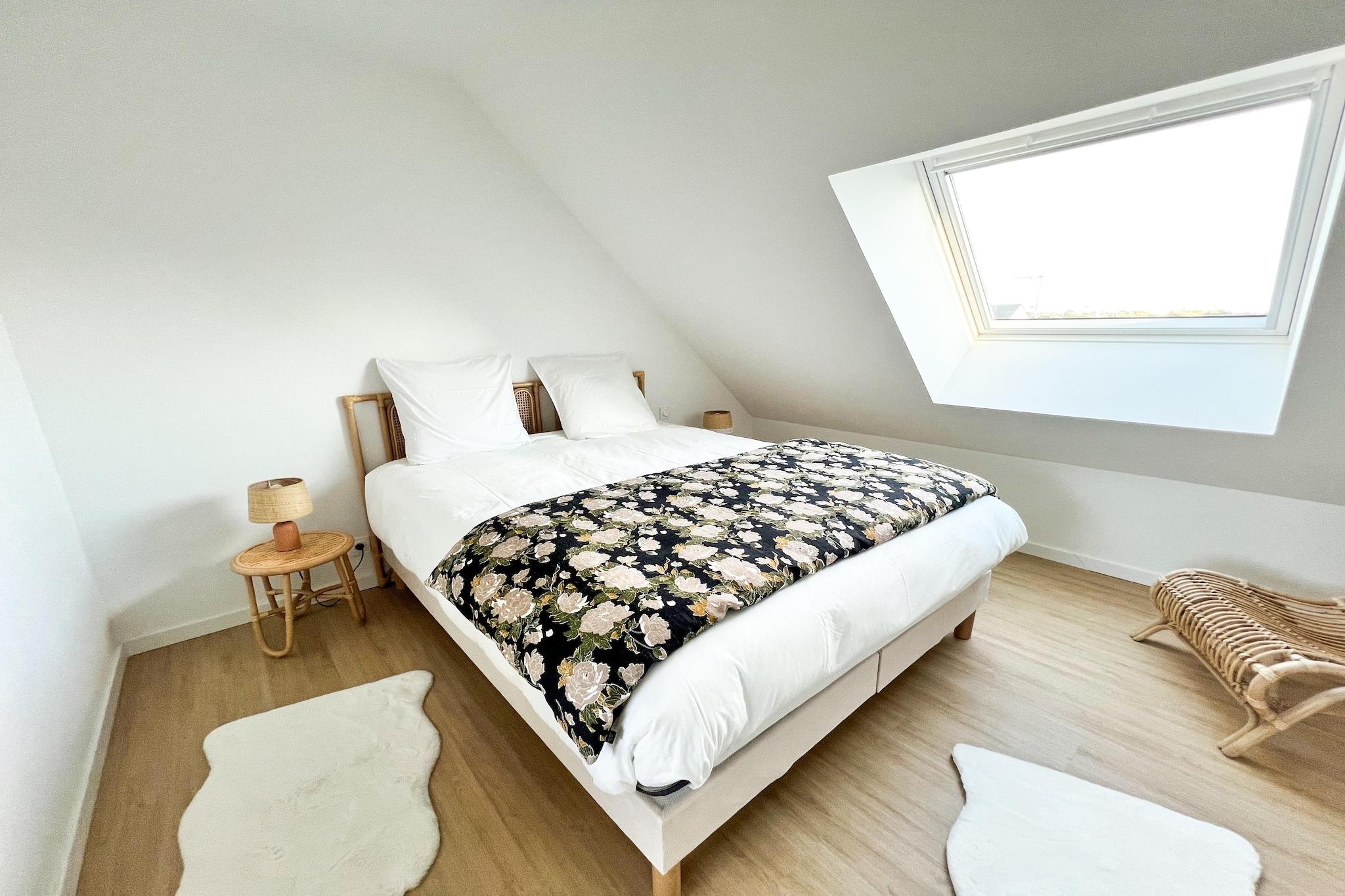 Denne arkitekttegnede villa tilbyder en generøs opholdsstue og moderne, elegante møbler med en betagende delvis havudsigt. Den rummelige planløsning, stuen med havudsigt og den tilstødende terrasse inviterer dig til at nyde vidunderlige øjeblikke med hygge, måske omkring en grill på plancha-grillen. Det fuldt udstyrede køkken er ideelt til at tilberede bretonske specialiteter sammen. Vinkælderen er et sandt højdepunkt for vinelskere. Pejsen i stuen skaber en særlig hyggelig atmosfære, især i lavsæsonen. Ovenpå, på mezzaninen, er der en anden opholdsstue med et fjernsyn, der tilbyder endnu mere spektakulær havudsigt. I stueetagen finder du master-suiten med en 160 x 200 cm seng, store vinduer, der åbner direkte ud mod haven, et tilstødende påklædningsværelse og et badeværelse med badekar, bruser og separat toilet. Ovenpå er der yderligere to soveværelser: Et soveværelse med dobbeltseng (160 x 200 cm) Et soveværelse med dobbeltseng (160 x 200 cm) og en enkeltseng (90 x 190 cm), ideelt til et barn Et badeværelse med bruser og toilet To kontorer er også tilgængelige, perfekte til hjemmearbejde. Babyudstyr, en barneseng, en højstol og et babybadekar kan stilles til rådighed efter anmodning. En garage (afhængigt af køretøjets størrelse) fuldender denne exceptionelle villa. Der er flere ekstra parkeringspladser på ejendommen. Den nærmeste sandstrand og kystvandrestien GR34 ligger kun 300 meter væk. Et særligt højdepunkt er det ugentlige marked, som bringer hele bymidten til live hver tirsdag. Der afgår også færger herfra til de nærliggende øer Molène og Ouessant, hvilket tilbyder en uforglemmelig oplevelse. En tur i en af de 12-personers oppustelige både kan også varmt anbefales: På denne imponerende tur kan du med lidt held observere delfiner og sæler, der soler sig på klipperne. For vandreentusiaster tilbyder den berømte GR34-kystrute en betagende udsigt og strækker sig kilometervis langs Frankrigs vilde og romantiske vestkyst. )