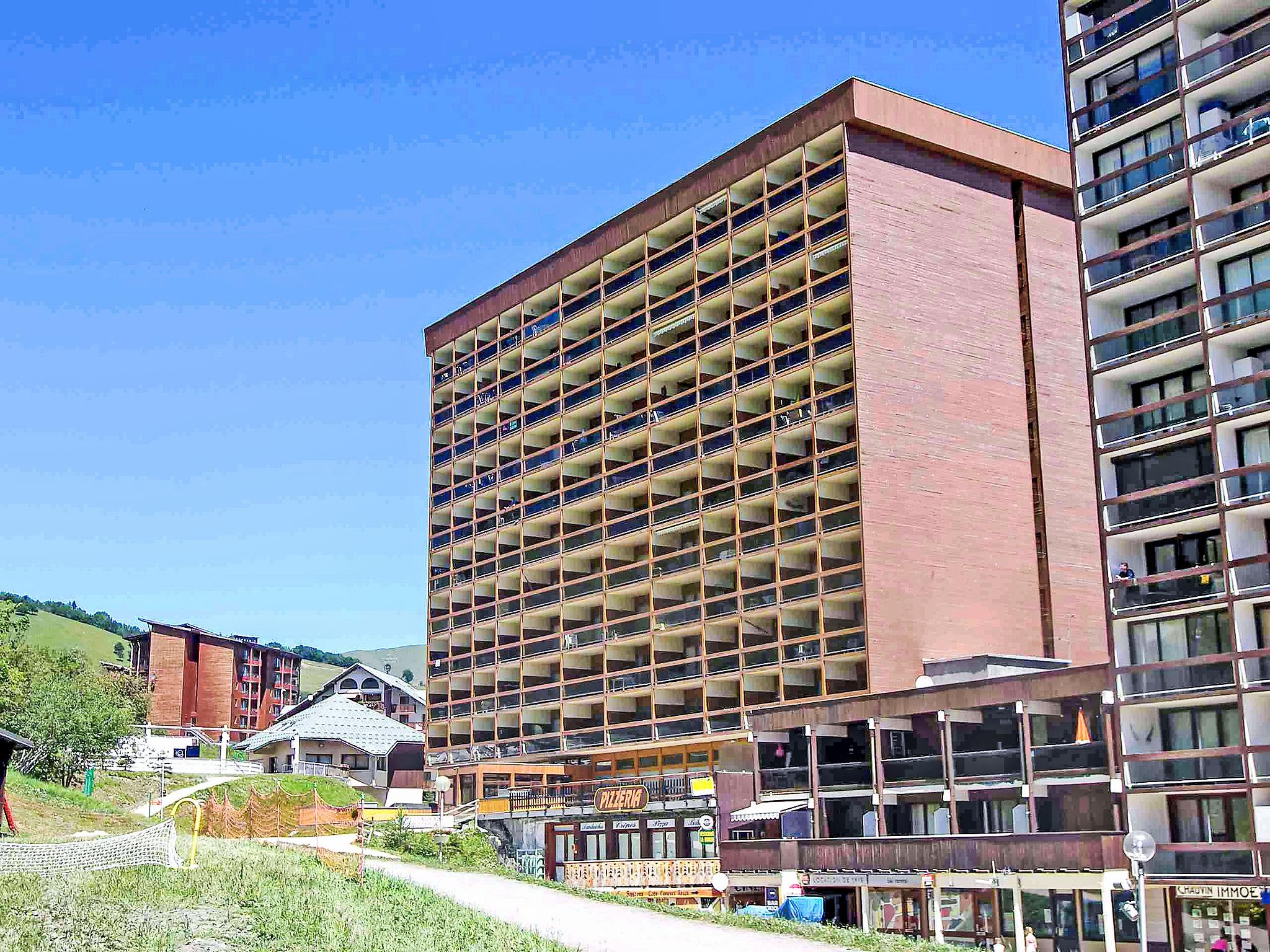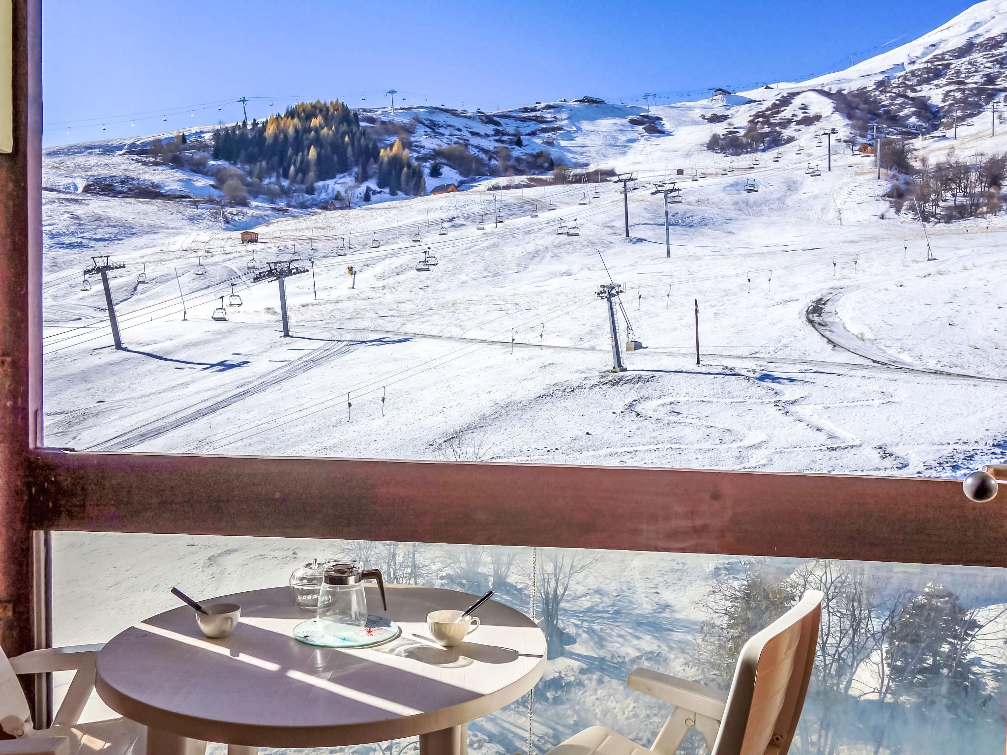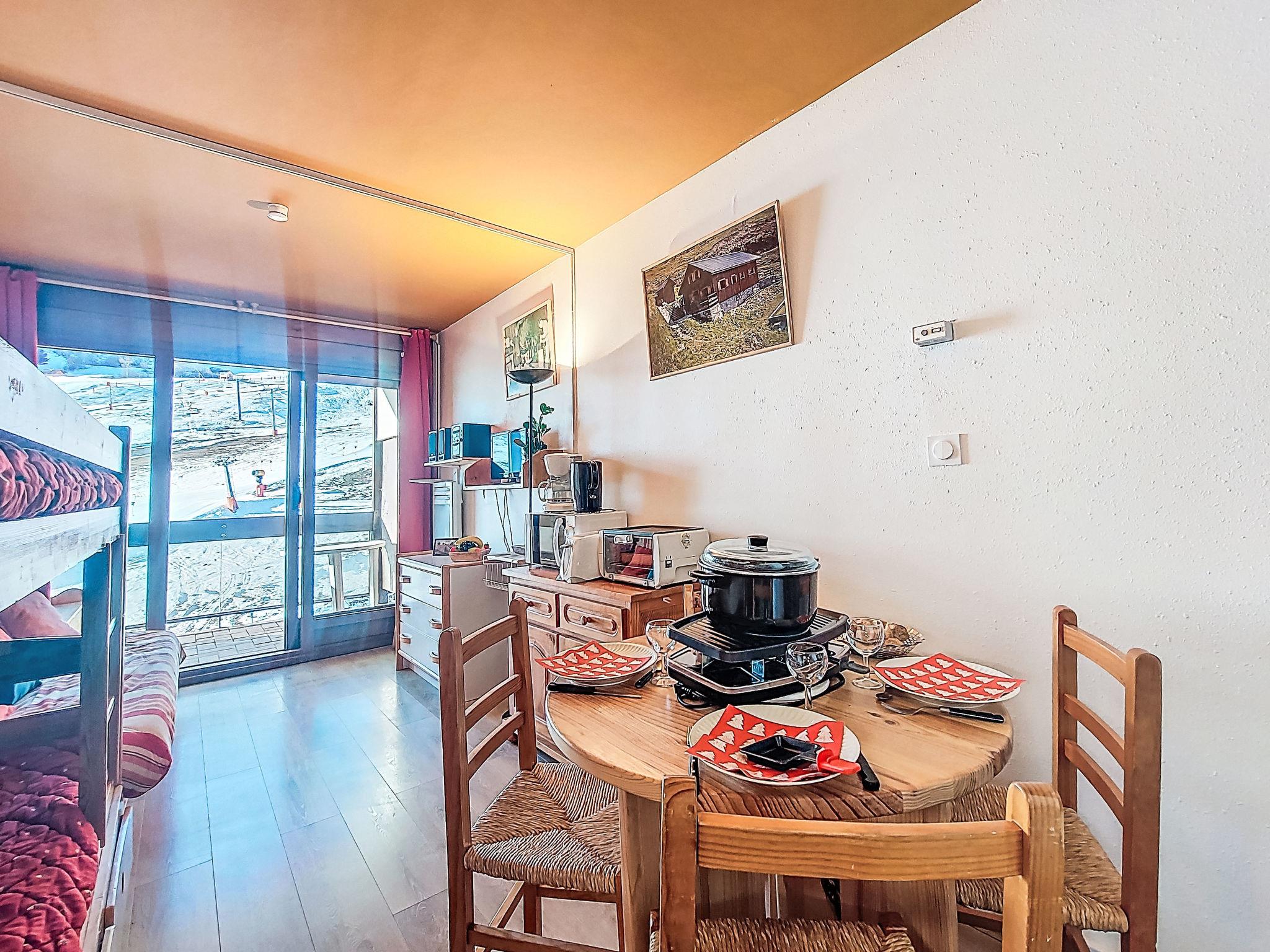 1-room studio 23 m2 on 5th floor, south facing position. Simple furnishings: living/sleeping room with 1 double sofabed (130 cm, length 190 cm), 1 x 2 bunk beds (80 cm, length 190 cm), TV (flat screen), hi-fi system. Exit to the balcony. Kitchenette (2 hot plates, mini-oven, toaster, kettle, microwave, electric coffee machine, raclette grill, fondue Set (cheese)). Bath/WC. Electric heating. Parquet floors. Balcony 5 m2, south facing position. Balcony furniture. Very beautiful view of the mountains and the ski run. Facilities: iron, hair dryer. Internet (WiFi, extra). Please note: non-smokers only. Smoke alarm. Offer by a private individual according to Art. 155, IV of CGI.