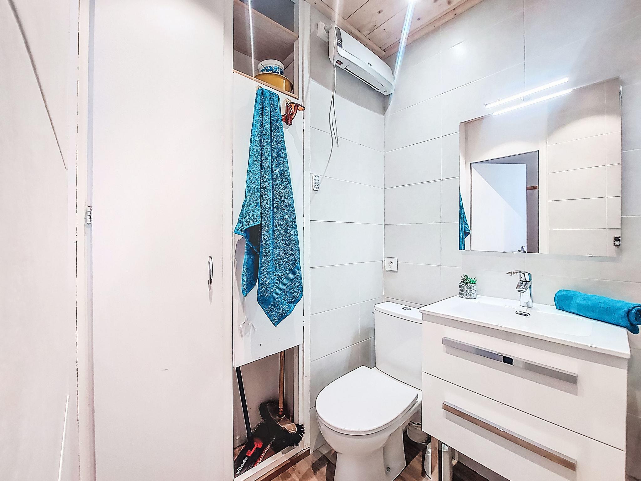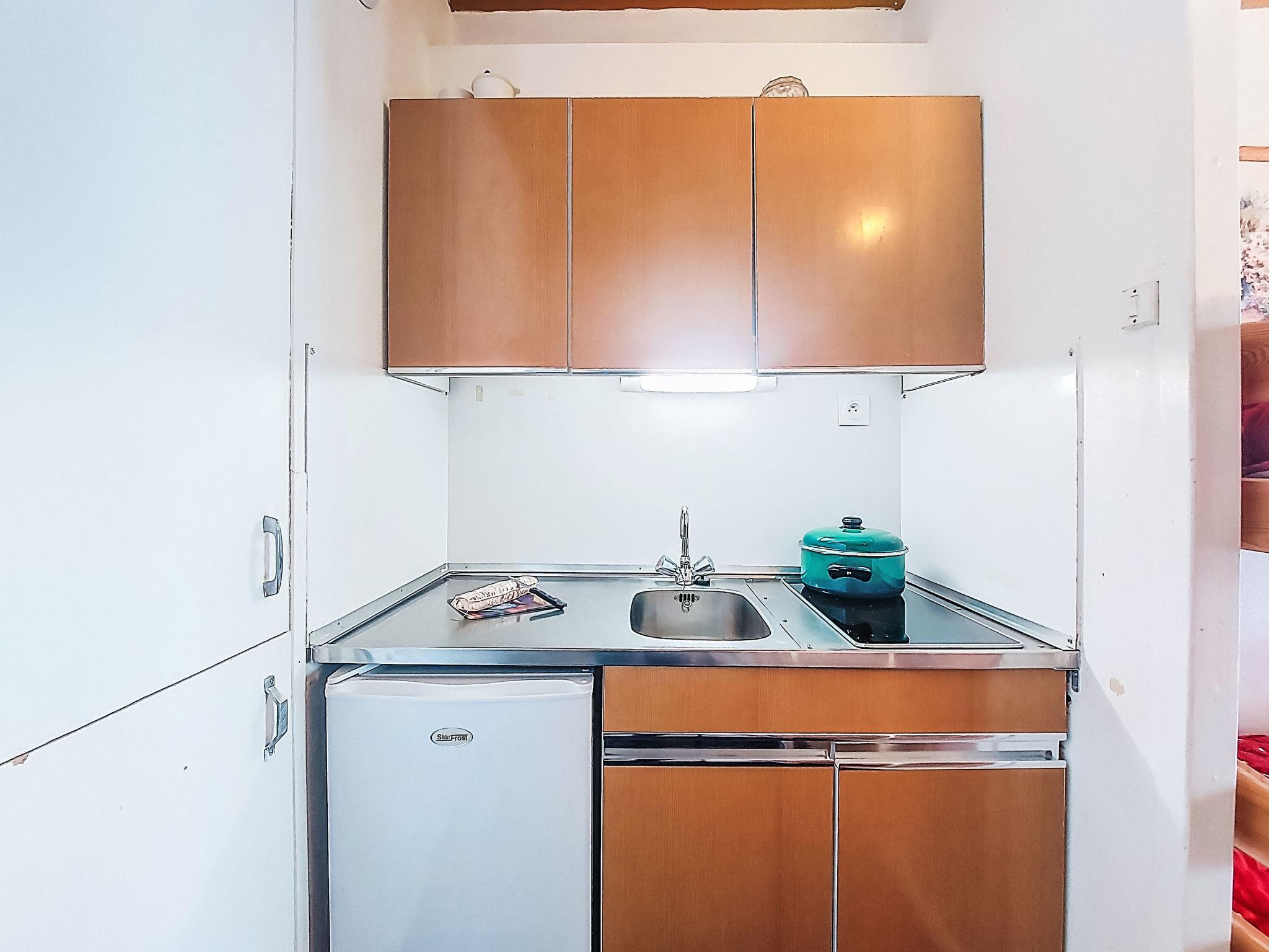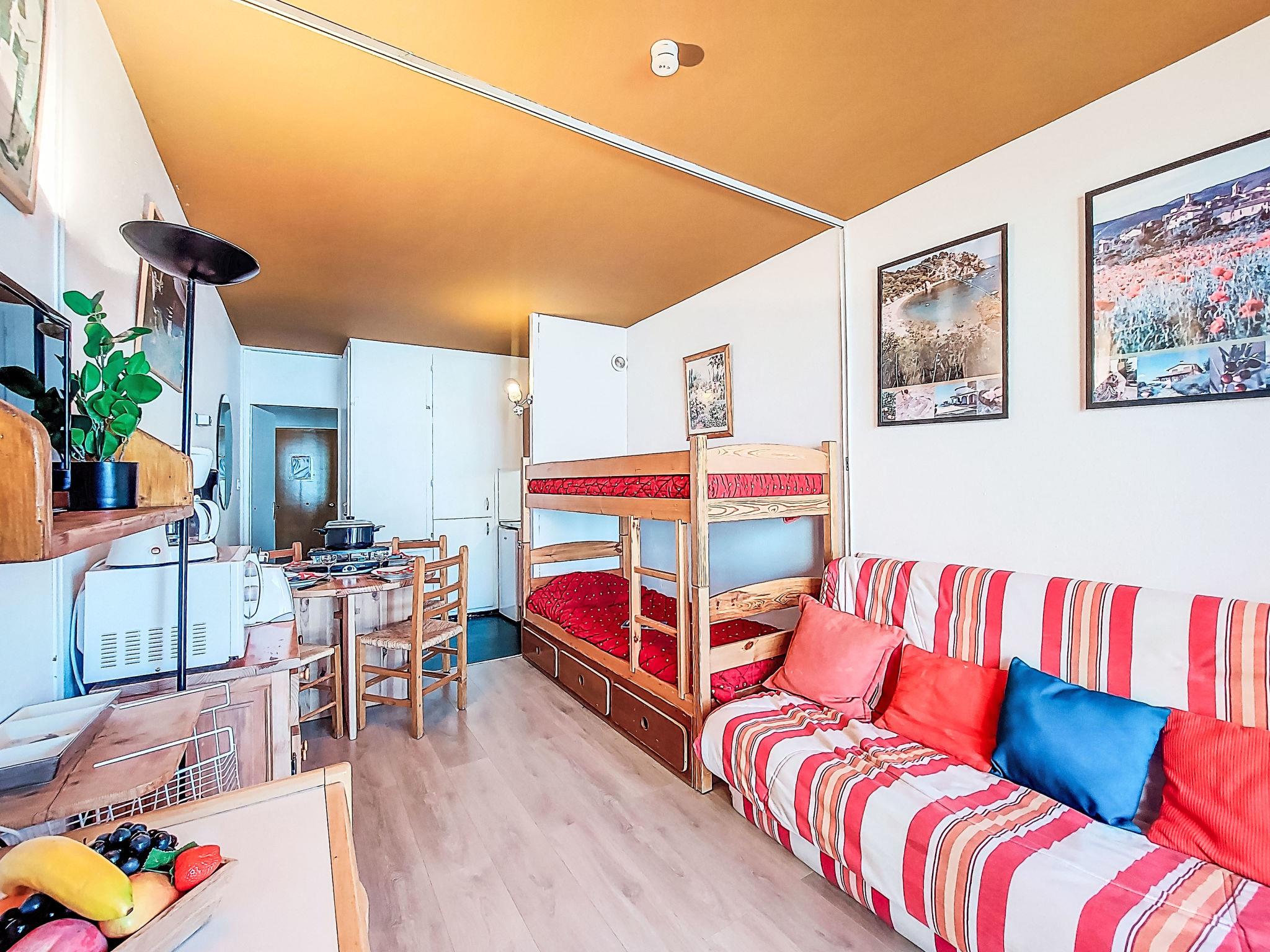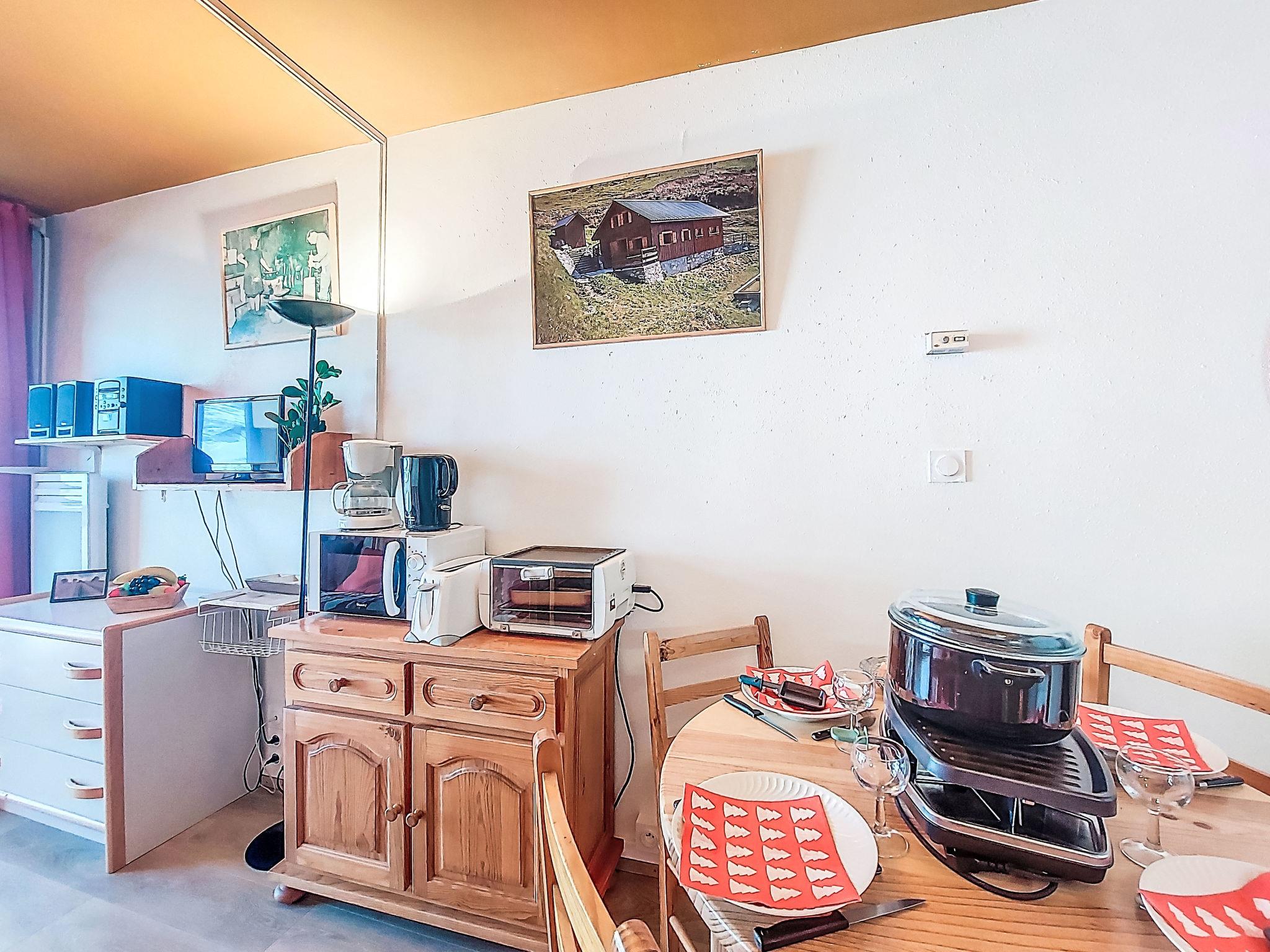 1-room studio 23 m2 on 5th floor, south facing position. Simple furnishings: living/sleeping room with 1 double sofabed (130 cm, length 190 cm), 1 x 2 bunk beds (80 cm, length 190 cm), TV (flat screen), hi-fi system. Exit to the balcony. Kitchenette (2 hot plates, mini-oven, toaster, kettle, microwave, electric coffee machine, raclette grill, fondue Set (cheese)). Bath/WC. Electric heating. Parquet floors. Balcony 5 m2, south facing position. Balcony furniture. Very beautiful view of the mountains and the ski run. Facilities: iron, hair dryer. Internet (WiFi, extra). Please note: non-smokers only. Smoke alarm. Offer by a private individual according to Art. 155, IV of CGI.