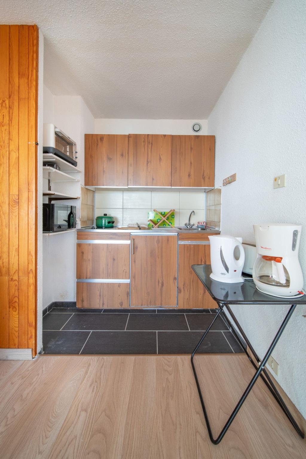 1-room studio 34 m2 on 3rd floor. Simple furnishings: living/sleeping room with 1 double sofabed (140 cm, length 190 cm), TV (flat screen). Exit to the balcony. Alcove with curtain with 1 x 2 bunk beds (90 cm, length 190 cm). Kitchenette (oven, 2 ceramic glass hob hotplates, toaster, kettle, microwave, electric coffee machine). Bathroom. Electric heating. Parquet floors. Large balcony 10 m2, south facing position. Beautiful view of the ski run. Facilities: washing machine. Internet (WiFi, extra). Please note: non-smokers only. Smoke alarm. Instead of an enclosed bedroom, some sleeping areas are located in an open-plan area (gallery, alcove, etc.). Offer by a private individual according to Art. 155, IV of CGI.