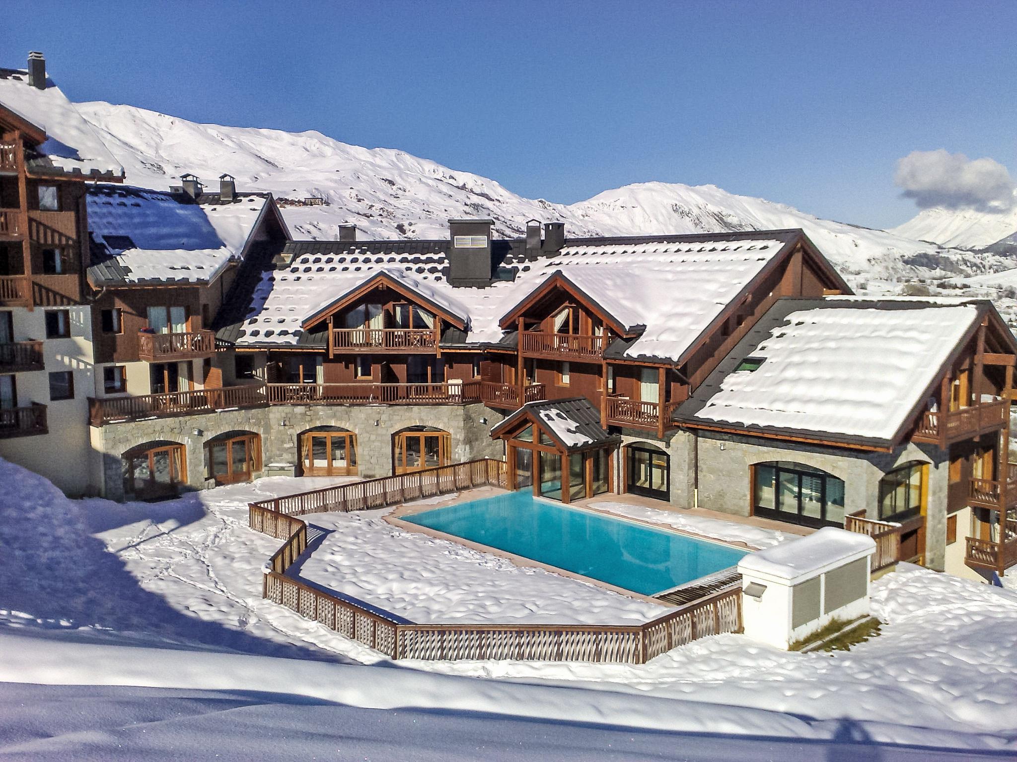Beautiful residence "Les Alpages du Corbier", 8 storeys, built in 2007. Below Corbier, 700 m from the centre, 50 m from the skiing area. For shared use: swimming pool angular heated (5 x 10 m, depth 150 cm, seasonal availability: 13.Dec. - 10.Apr. and 04.Jul. - 28.Aug. pool opening hours: 10:00-18:45). Shower/WC in the pool area. In the complex: restaurant, bar, internet access, sauna, fitness room, lift, storage room for skis, washing machine, tumble dryer (for shared use, extra). 50 m long steep, narrow motor access. In Winter: please take snow chains. Public parking 150 m. Shop 600 m, grocery 100 m, restaurant, bar 600 m, bus stop "Centre-Bagagerie" 700 m, railway station "St Jean de Maurienne" 17 km. Chair lift, skisport facilities, slopes 100 m, ski bus stop 50 m, ski school 600 m, ski-kindergarten 400 m, sled run 600 m. Please note: ski bus (free of charge). In case of good snow conditions, the house is accessible on skis.