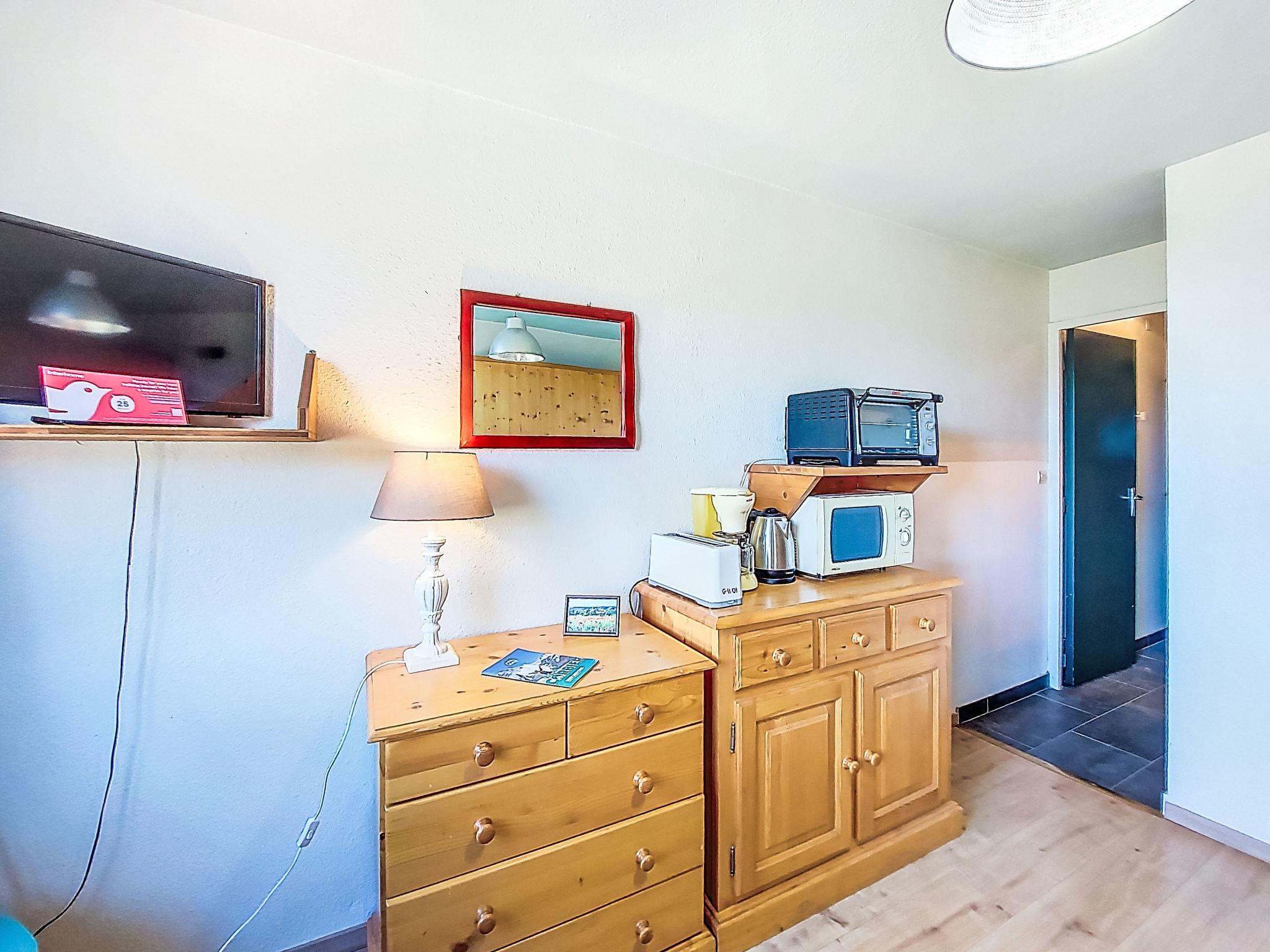 1-room studio 16 m2 on 11st floor, north facing position. Beautiful furnishings: living/dining room with 1 pull-out bed (2 pers. 2 x 80 cm, length 190 cm), TV (flat screen). Kitchenette (2 hot plates, mini-oven, kettle, microwave, electric coffee machine). Bath/WC. Electric heating. Parquet floors. Beautiful view of the mountains and the valley. Facilities: Internet (WiFi, extra). Please note: non-smokers only. Smoke alarm. Offer by a private individual according to Art. 155, IV of CGI. FR7370.800.27