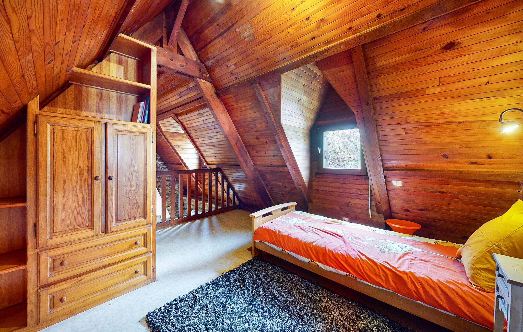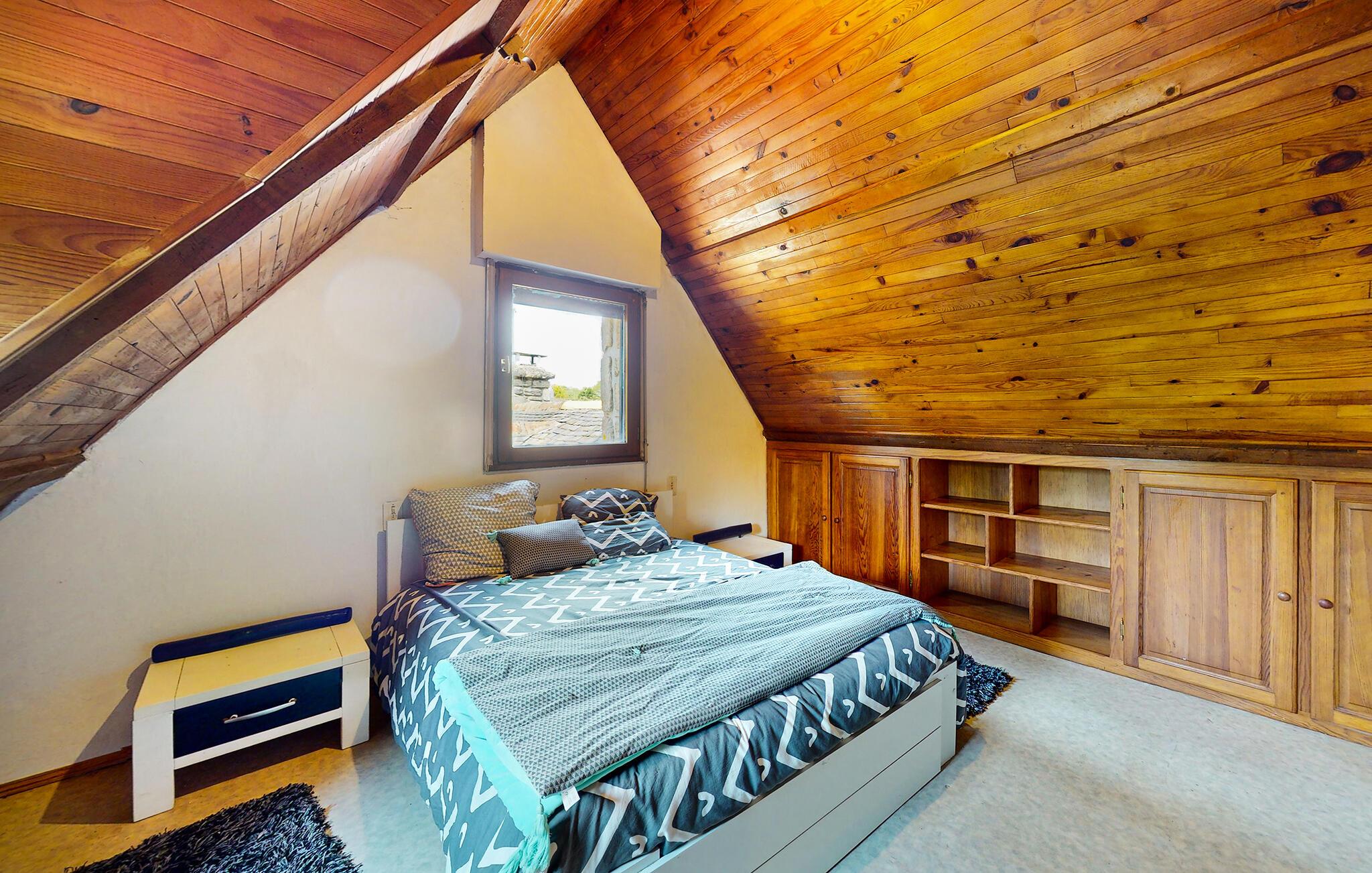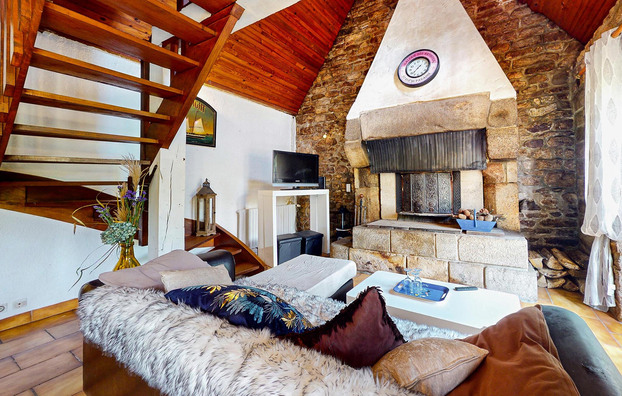 Oplev en uforglemmelig ferie i dette bretonske stenhus i Le Faouët. Interiøret udstråler en rustik hygge takket være den store brændeovn, fritlagte stenvægge og det åbne galleri soveværelse. Træstemningen med synlige bjælker og varme toner skaber en hyggelig atmosfære, der lægger op til at slappe af.